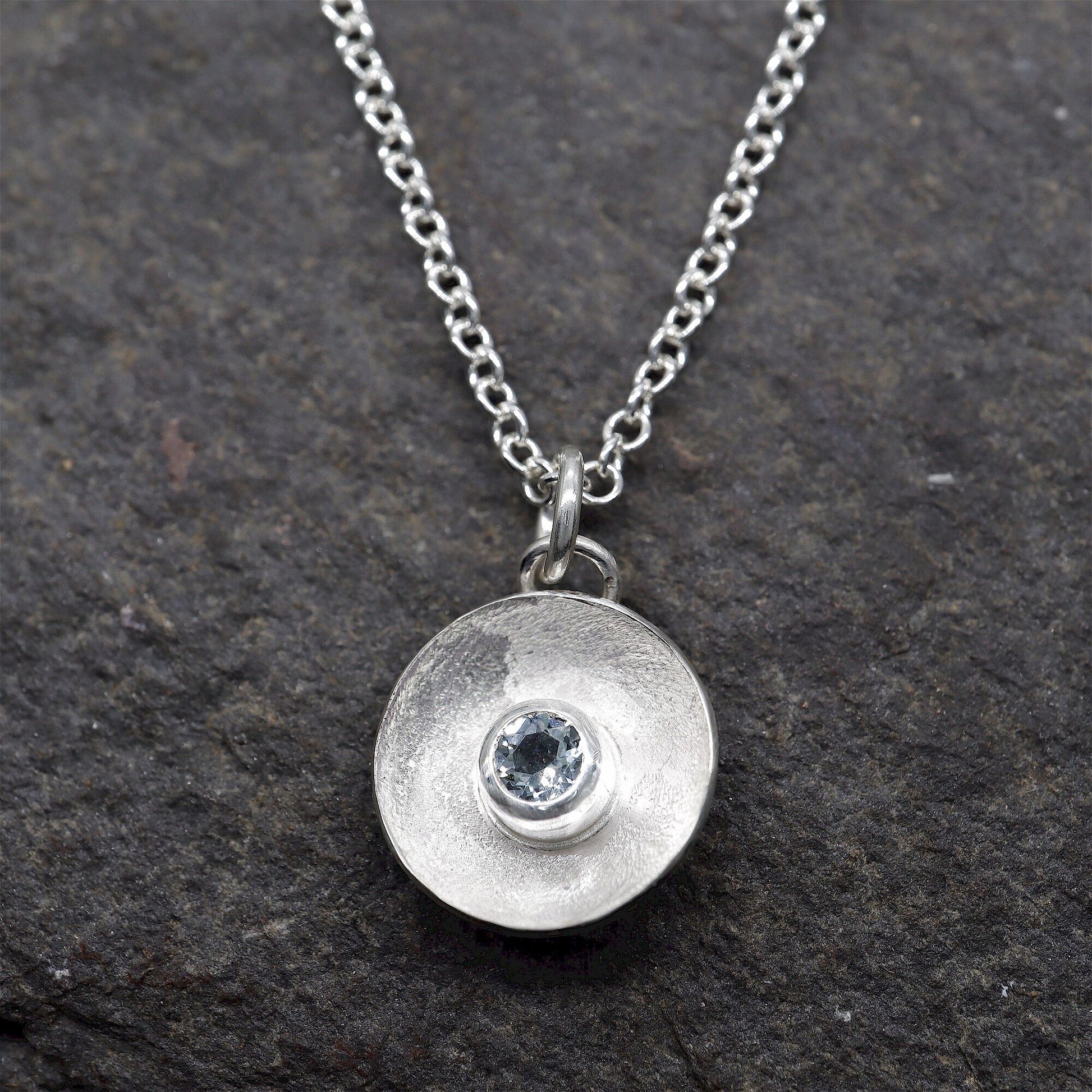 Water Droplets designed handmade pendant in silver set with one 4mm natural Aquamarine and hung from an 18 inch silver chain complete with gift box.