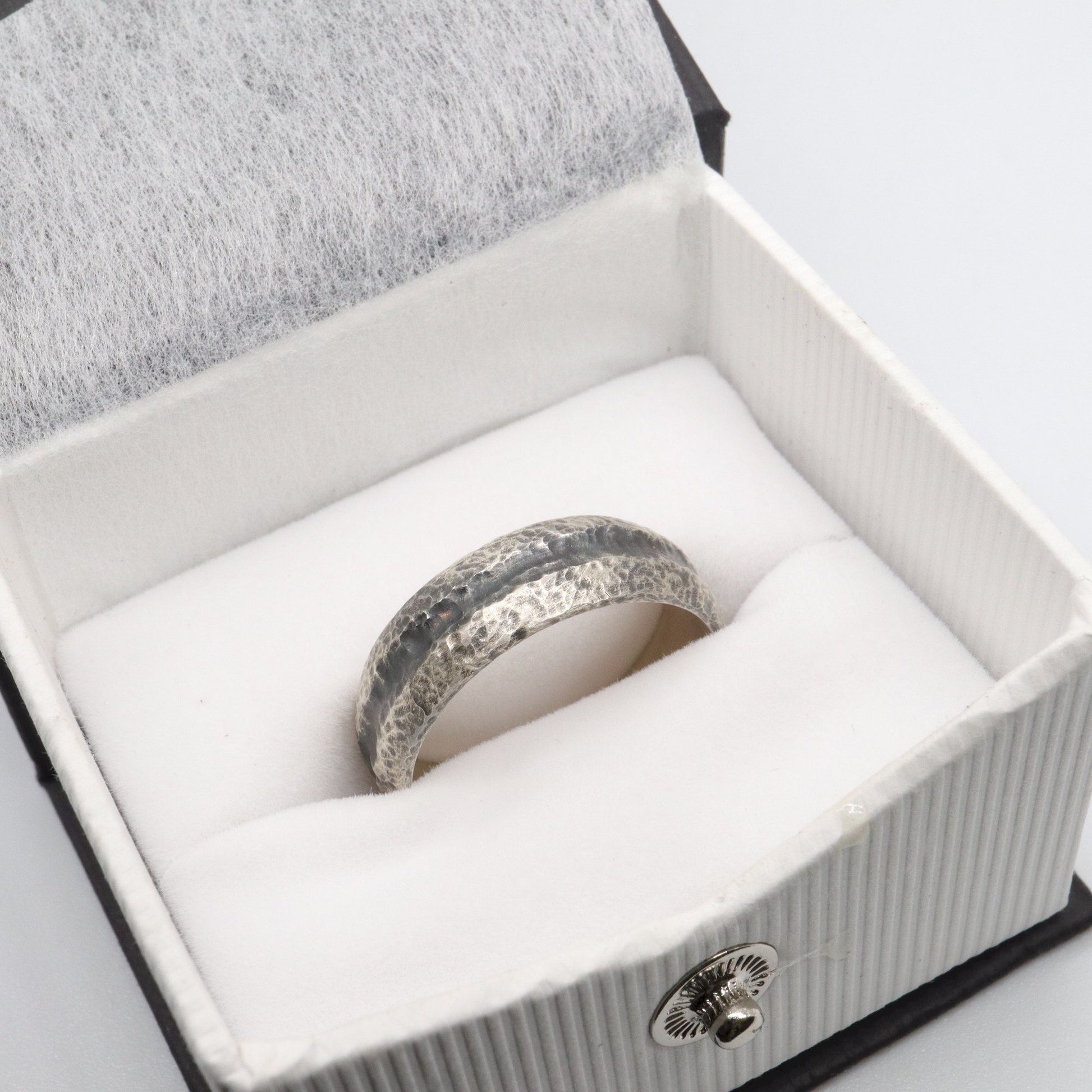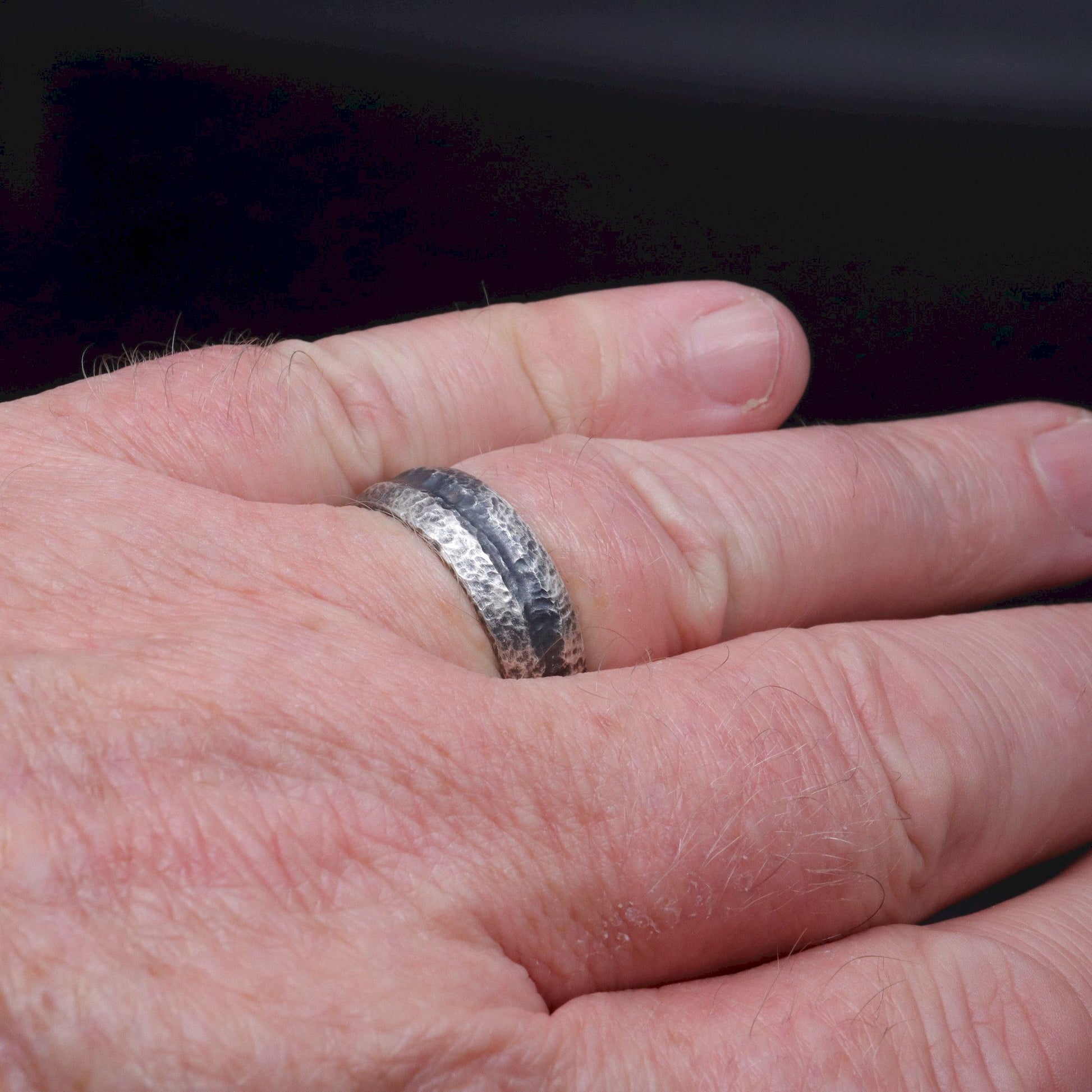 Black silver mans promise, engagement or wedding ring with a carved rustic pattern, Fleetwith Pike design.