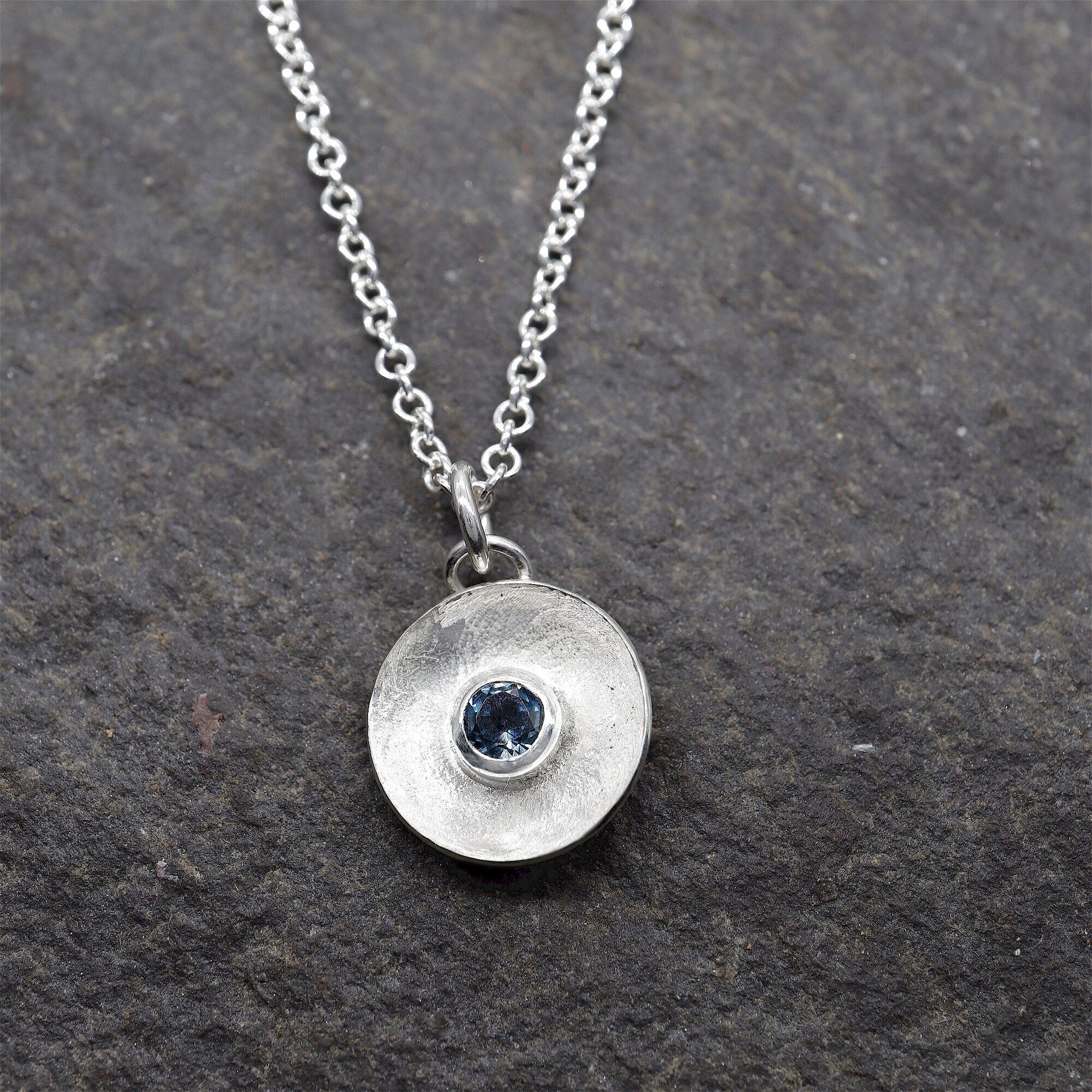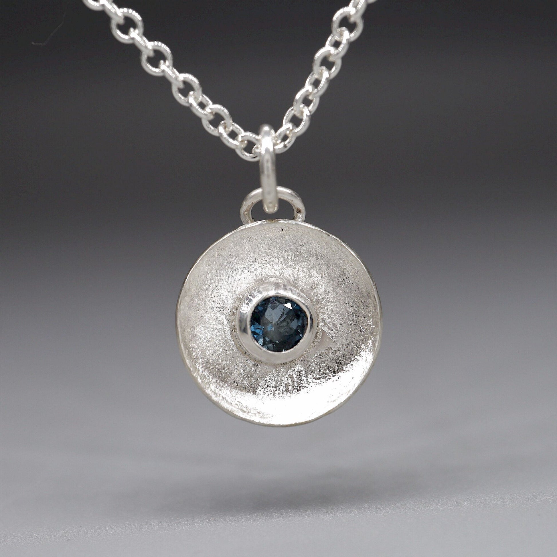 Water Droplets designed handmade pendant in silver set with one 4mm natural blue Topaz and hung from an 18 inch silver chain complete with gift box.