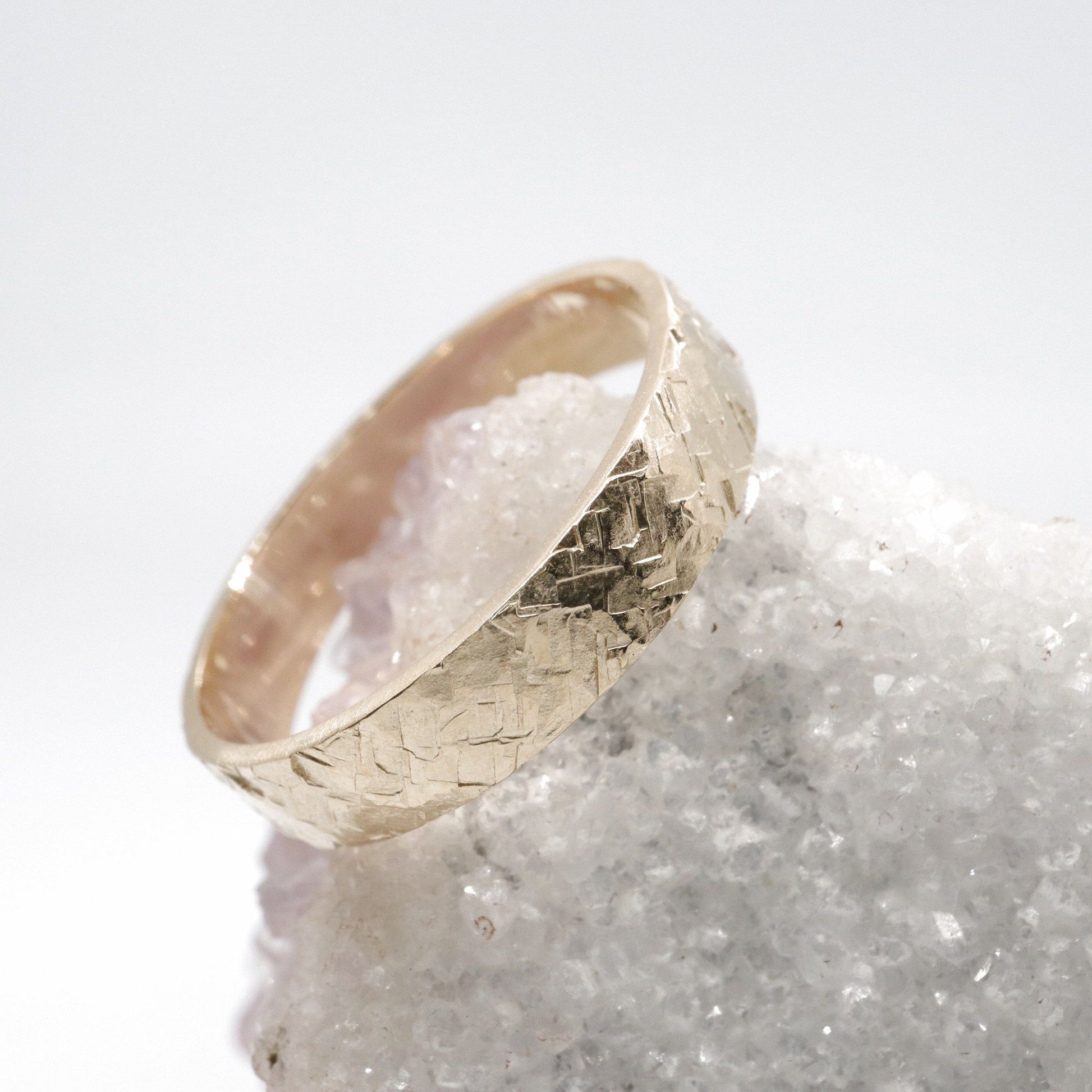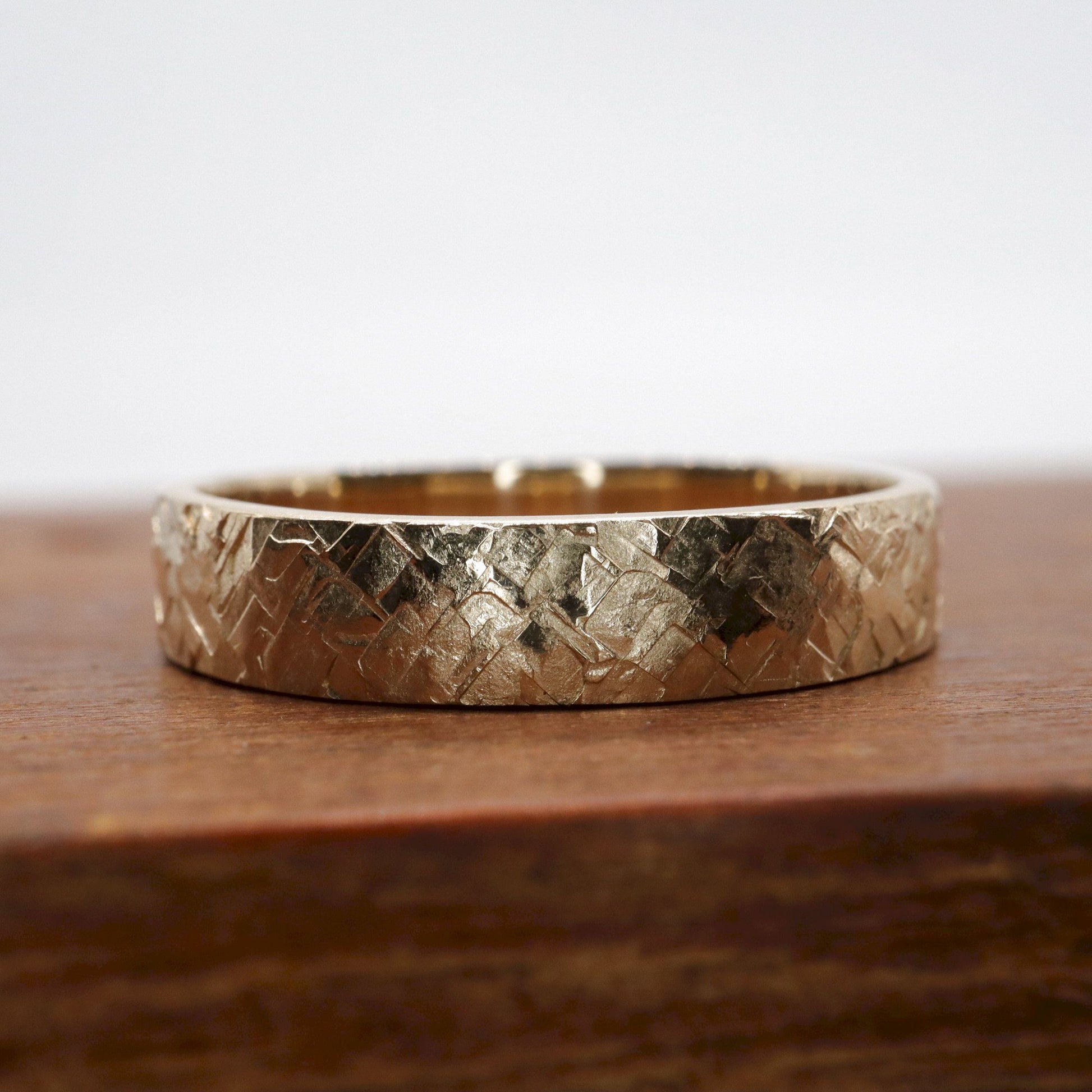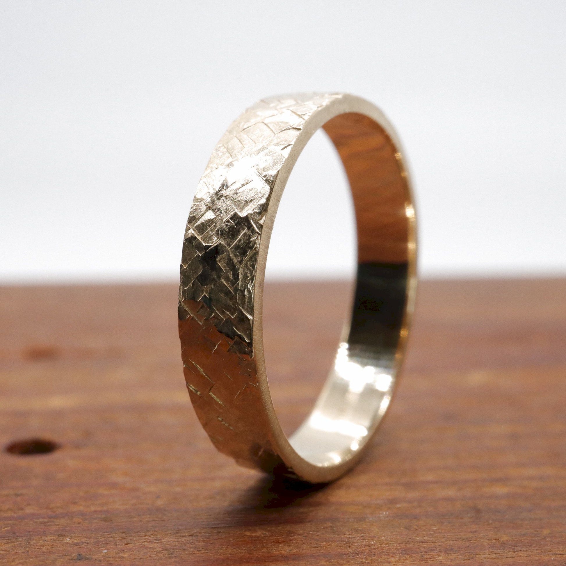 Broad yellow gold wedding ring, Kendal flat rustic hammered design. Hammered outside finish, brushed matt sides and polished inside.