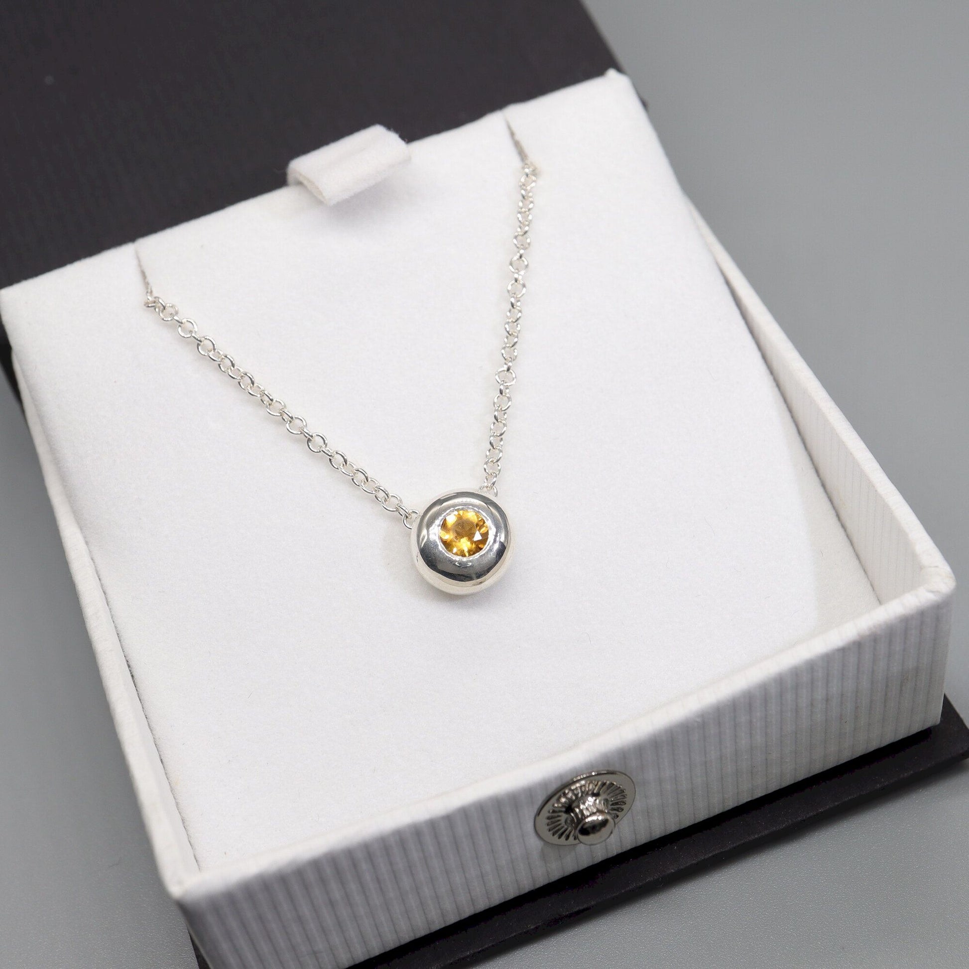 Citrine runner pendant. Silver slider button design set with one 4mm natural gemstone and an 18 inch silver chain complete with gift box.