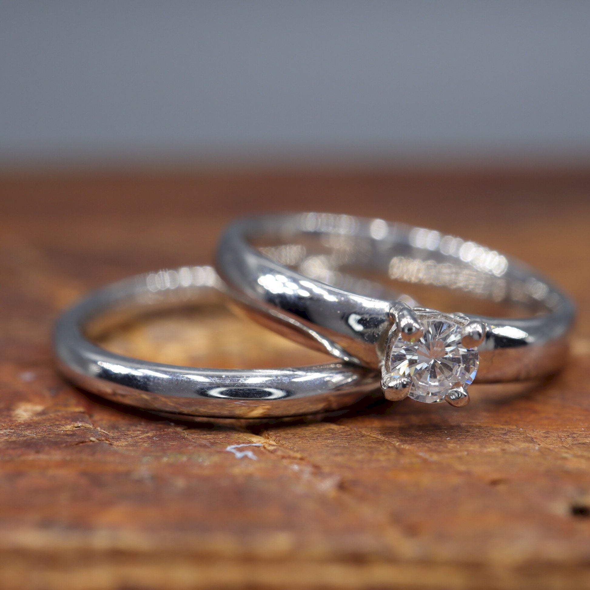 Solitaire white gold diamond bridal set. Carlisle design with one natural 0.25ct diamond. Set in a handmade white gold claw setting with a 3mm wide band with a matching 2mm wide wedding ring.
