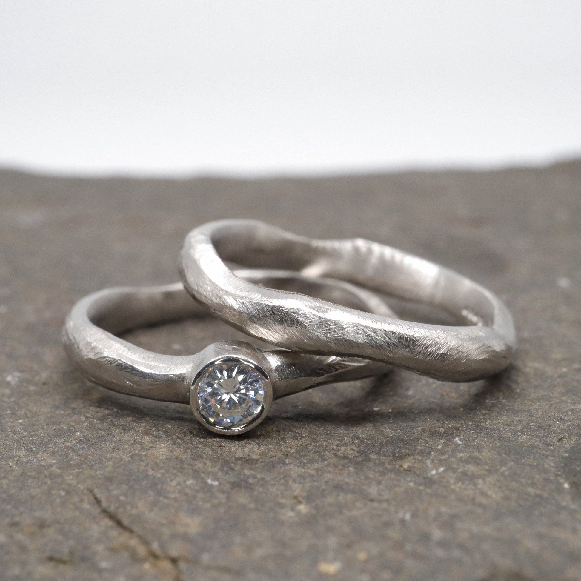 Diamond mounted in a handmade white gold rub over setting on a 3mm band with a matching 3mm wide wedding ring.