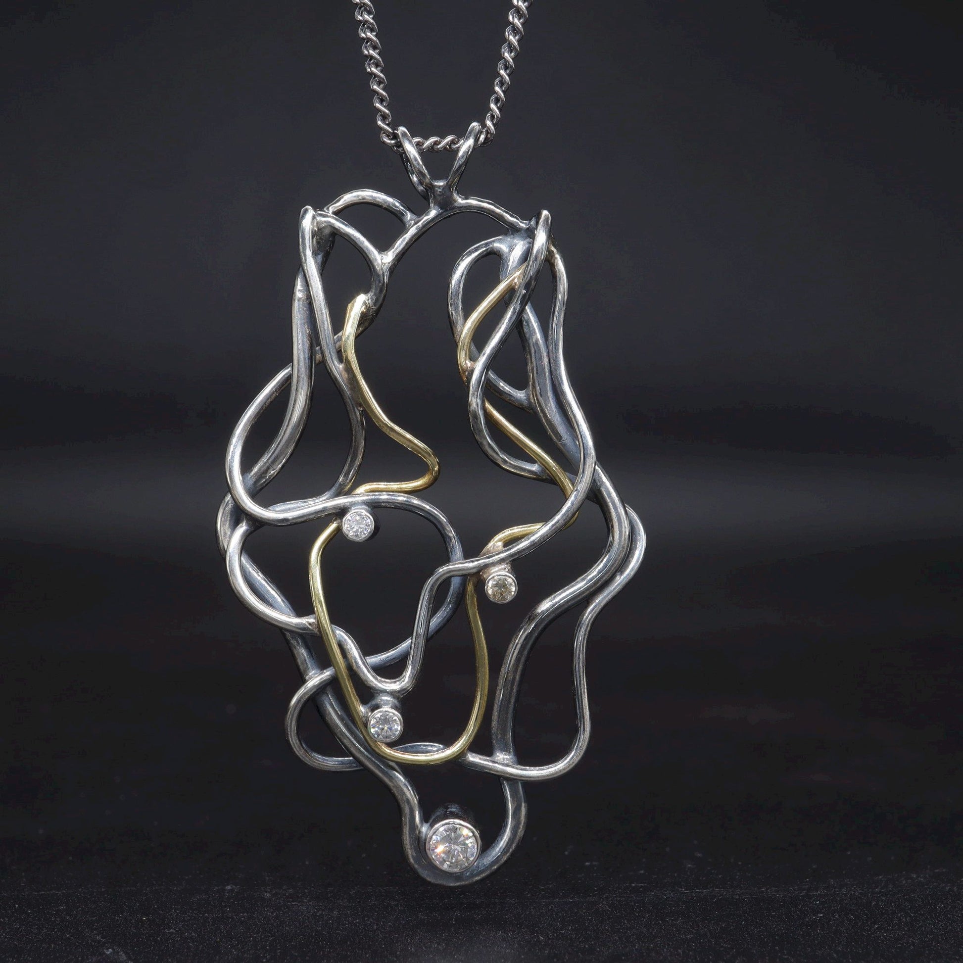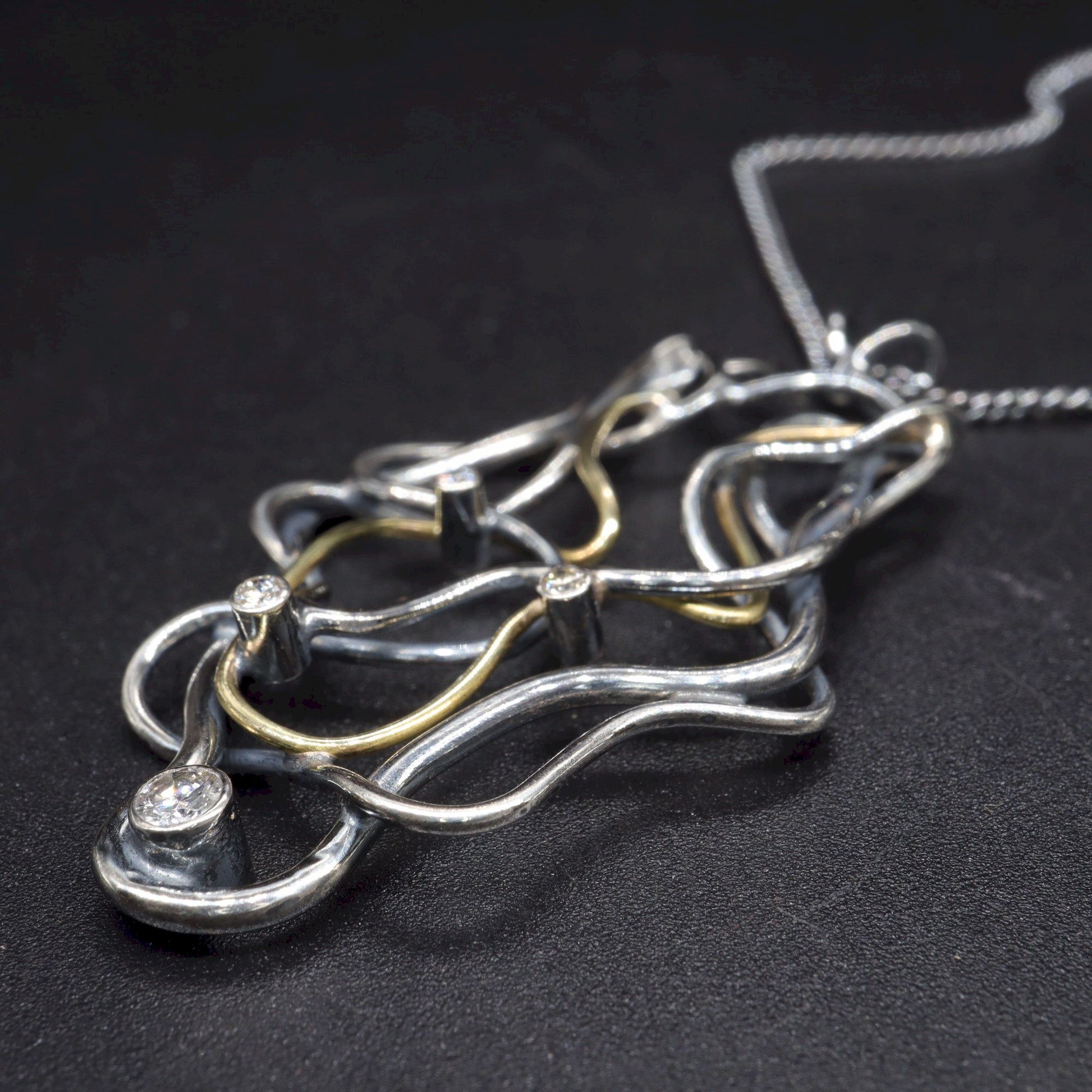 It is an interwoven antique darkened silver and 18ct gold yellow wire necklace set with four round brilliant cut diamonds ranging in size from 1.5mm to 3mm. Total weight 0.15ct . Attached is an 18 inch antique darkened silver chain, finished with a small bolt ring clasp.