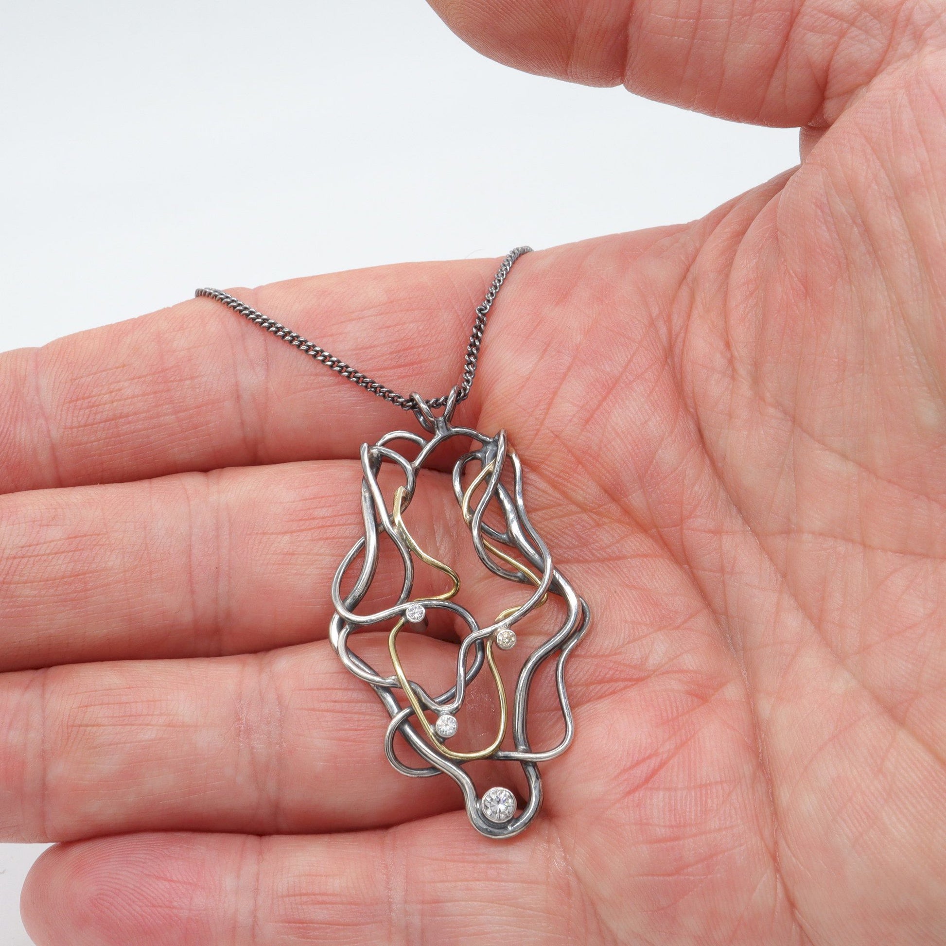Diamond set 18ct gold and antique dark stained silver handmade necklace