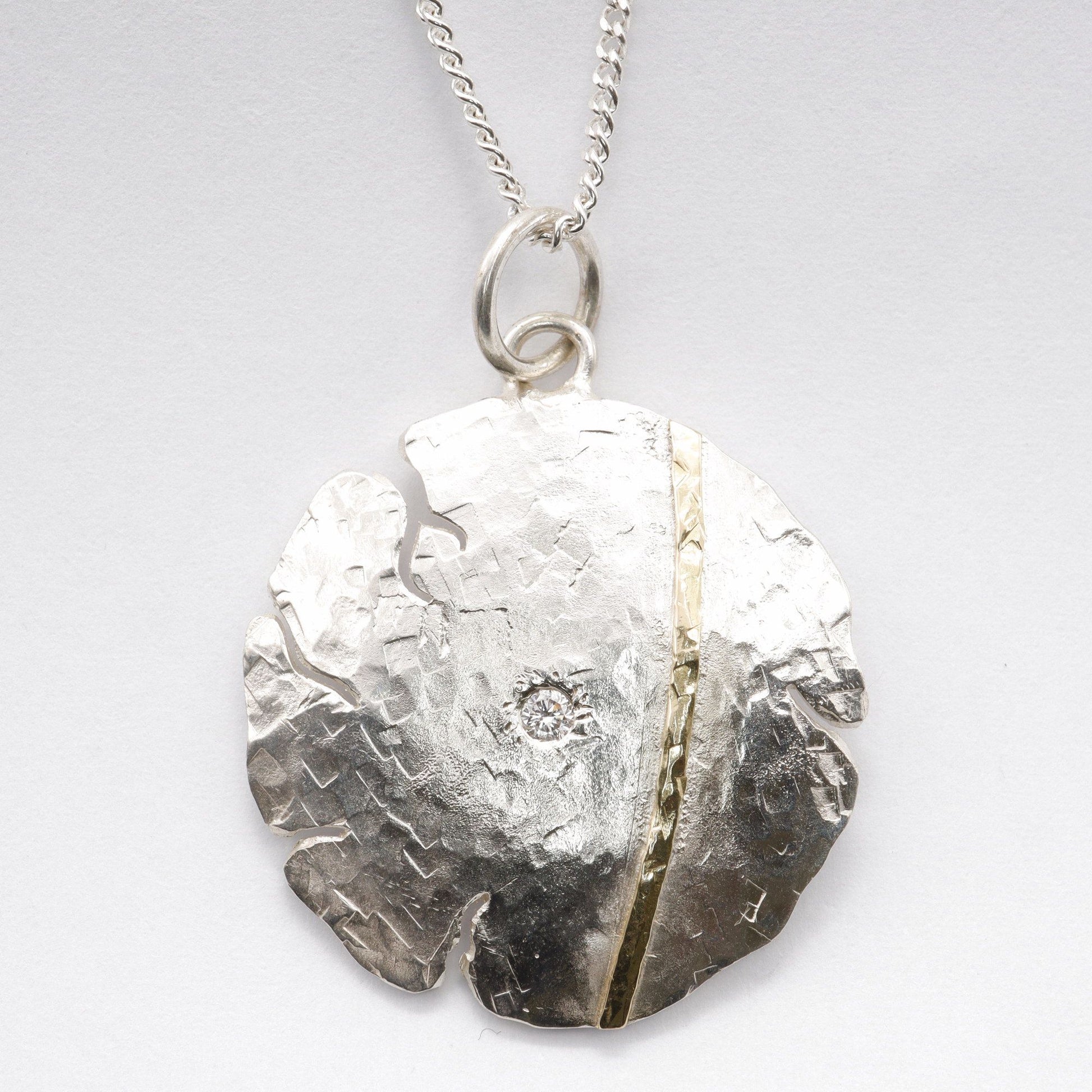 This is a handmade original design pendant in silver and 18ct yellow gold set with one 0.05ct round brilliant cut diamond. The pendant is approximately 25mm and comes with an 18 inch silver chain.
