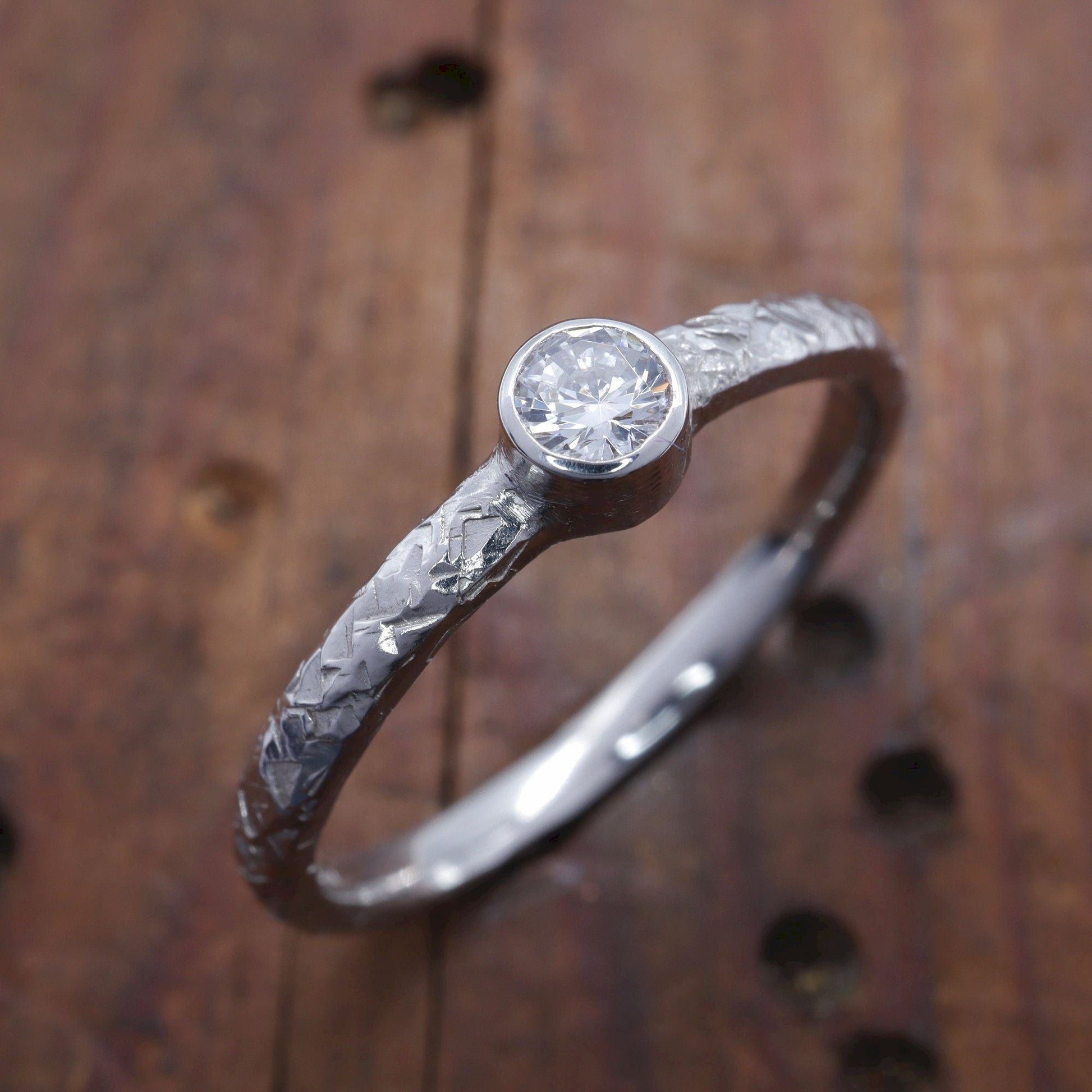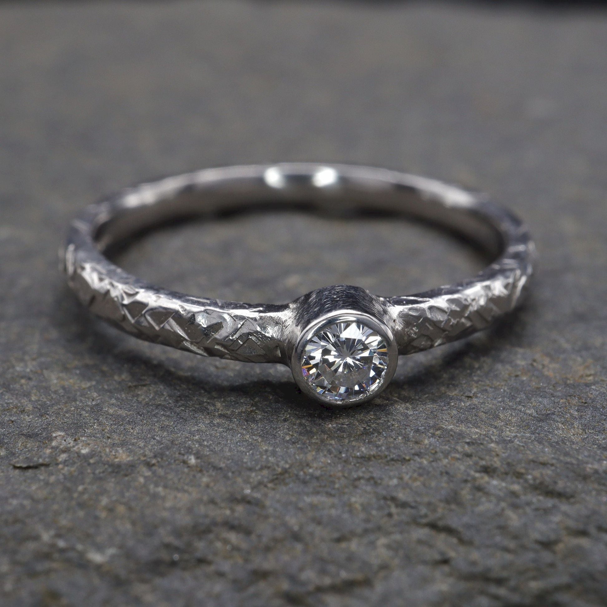 Diamond silver solitaire ring. Fire hammered design set with one natural 0.15ct diamond graded H-I,Si, 3.5mm diameter.