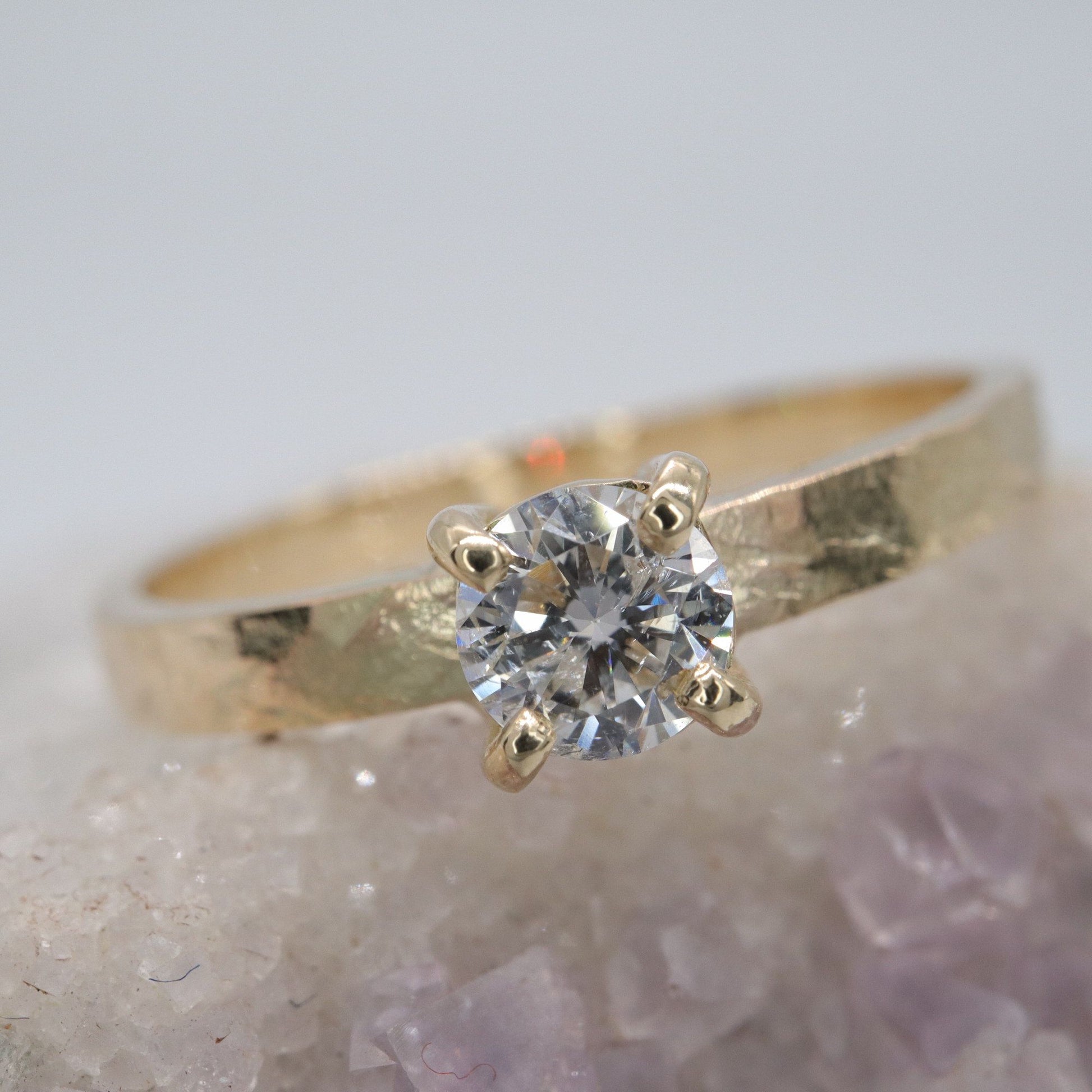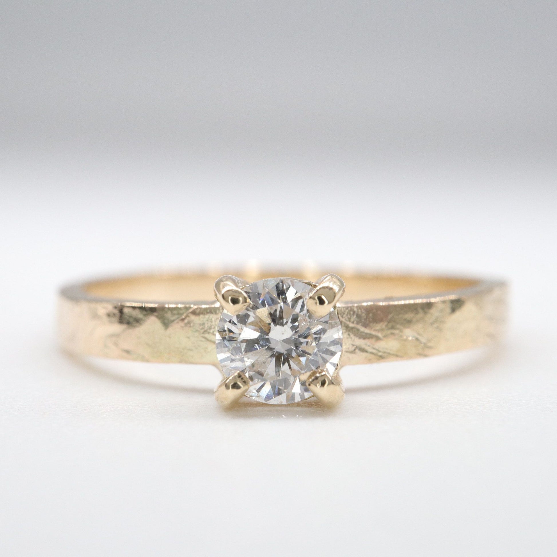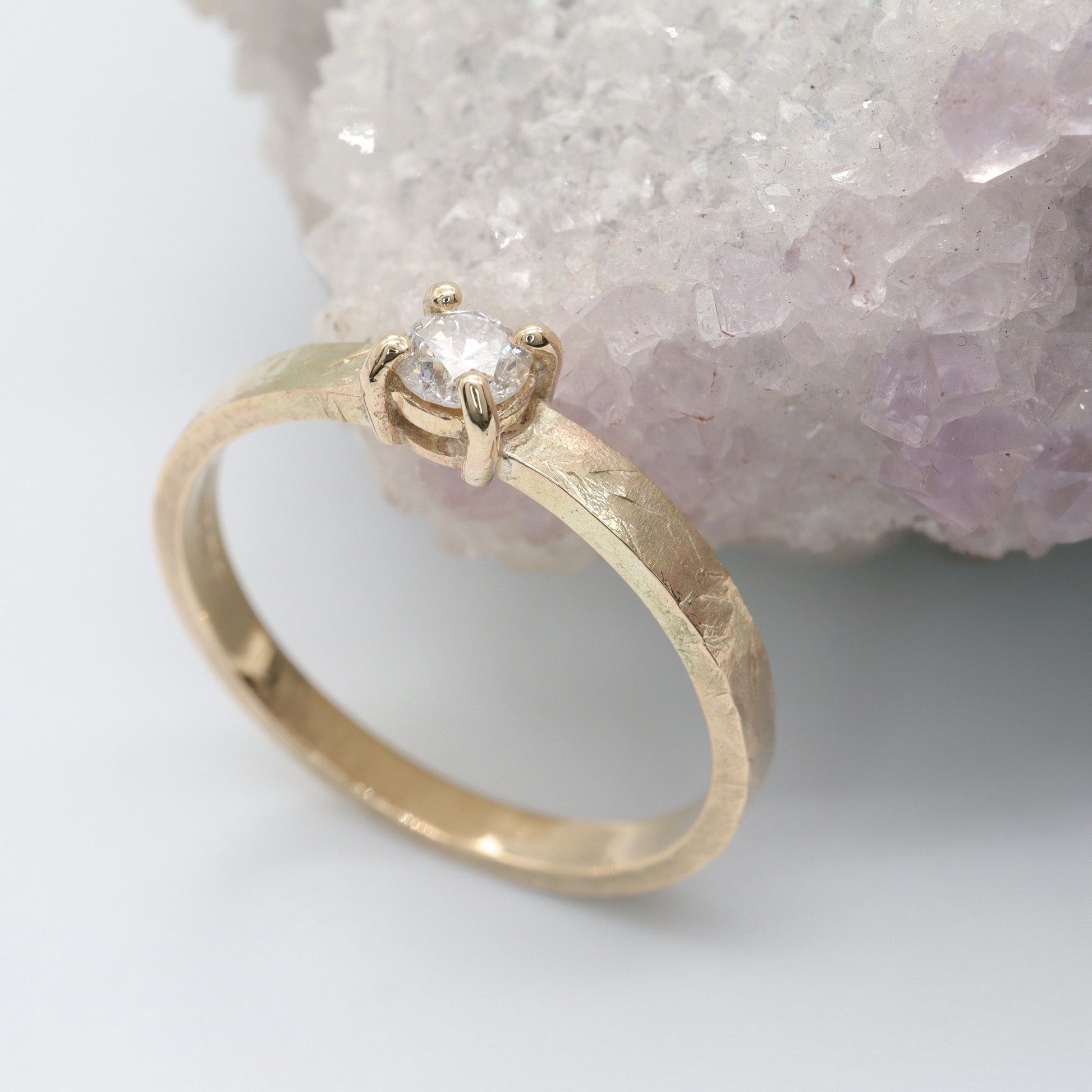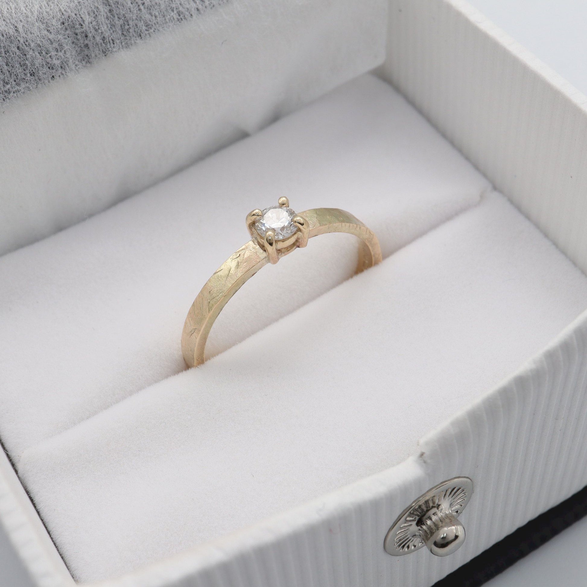 Windermere design ring set with one natural brilliant cut diamond in a claw setting on a 2mm yellow gold band. Inspired by the patterns on the Lakeland rock beside Lake Windermere when on a walk.