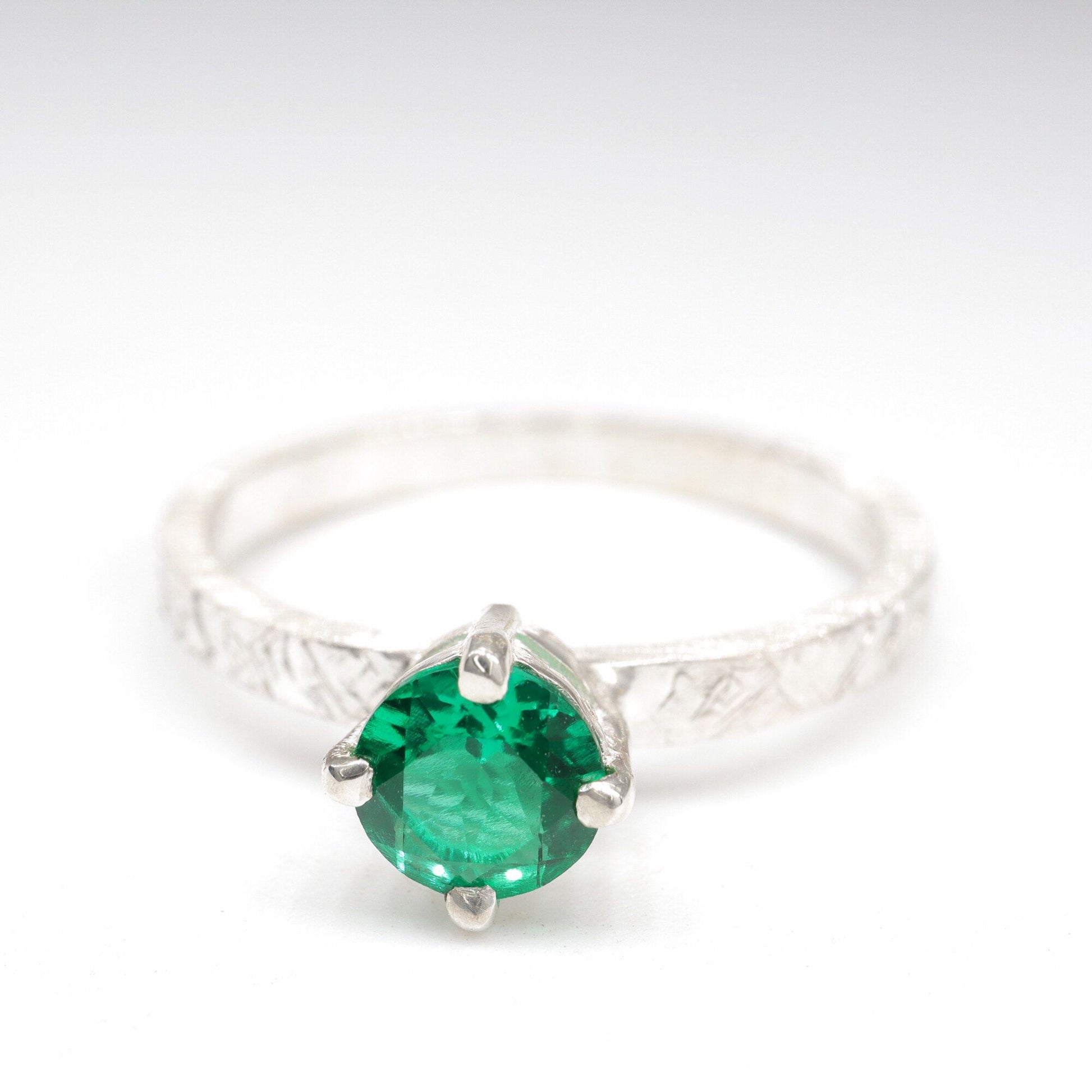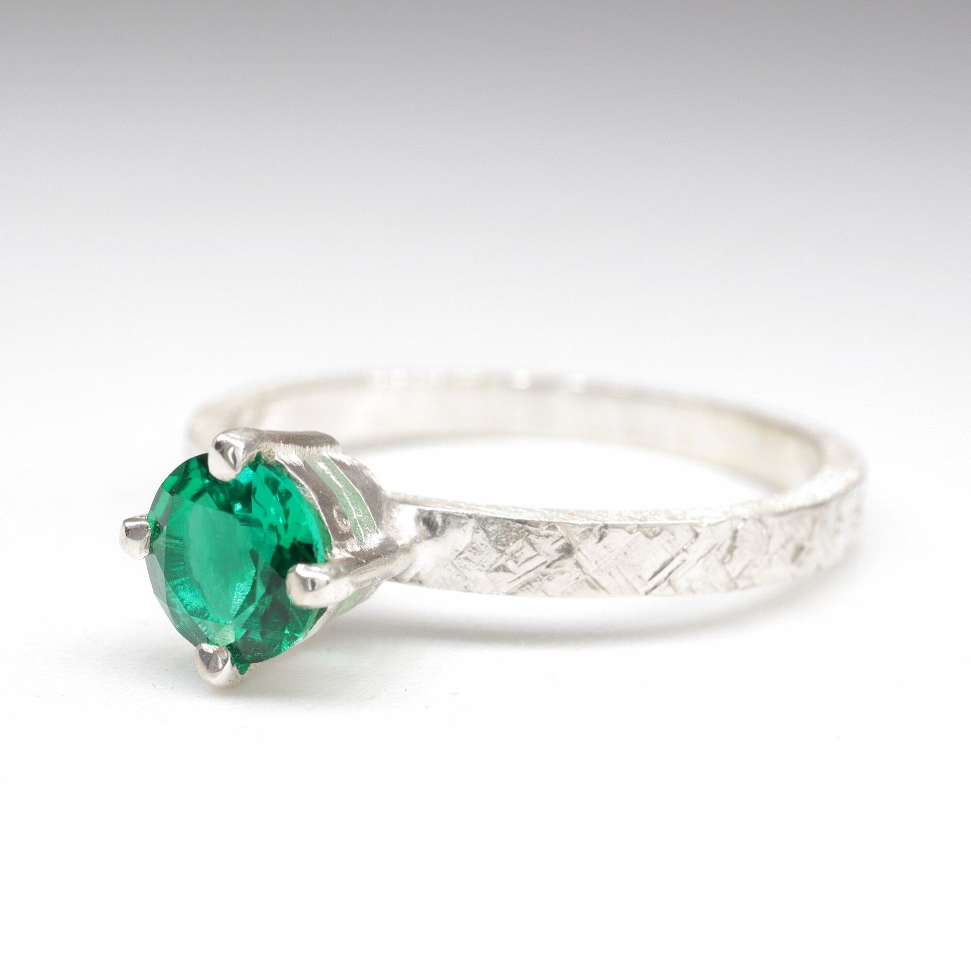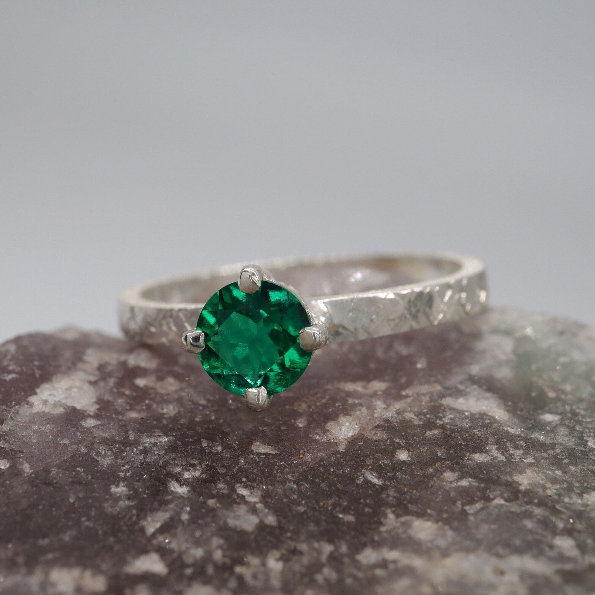 Kendal design ring set with one green emerald on a white or yellow gold band and claw setting. Also available set with ruby or sapphire gemstones.