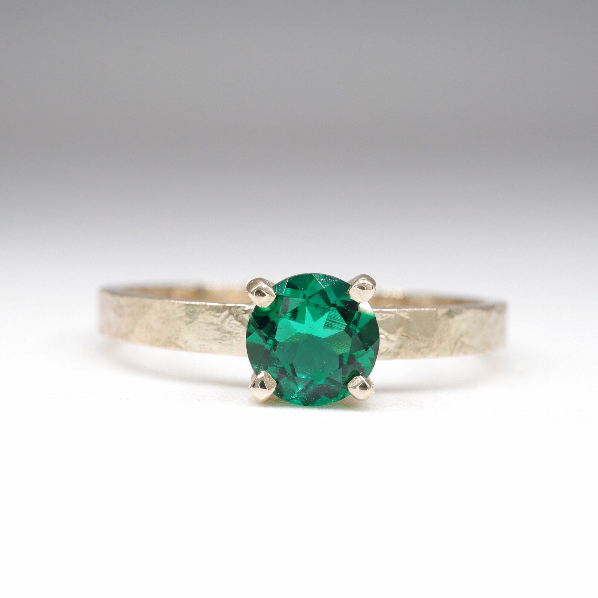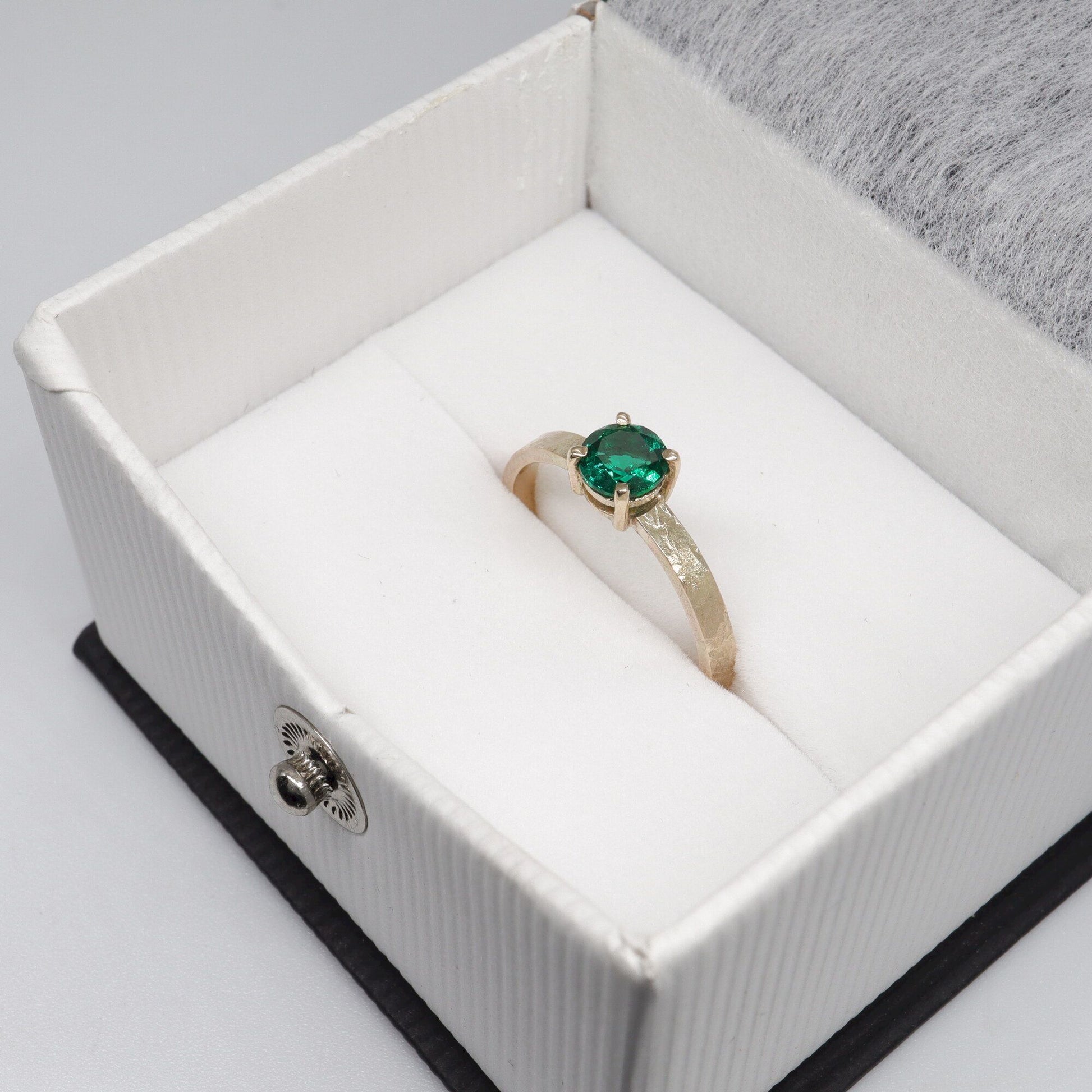 Windermere design ring size set with one 5mm green lab emerald in a yellow or white gold claw setting and 2mm band. Inspired by the patterns on the Lakeland rock beside Lake Windermere when on a walk.
