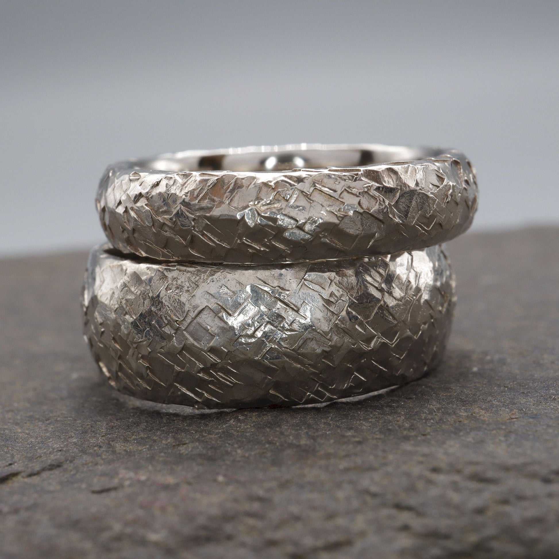 Fire Hammered matching silver ring set, 5mm and 8mm designs.