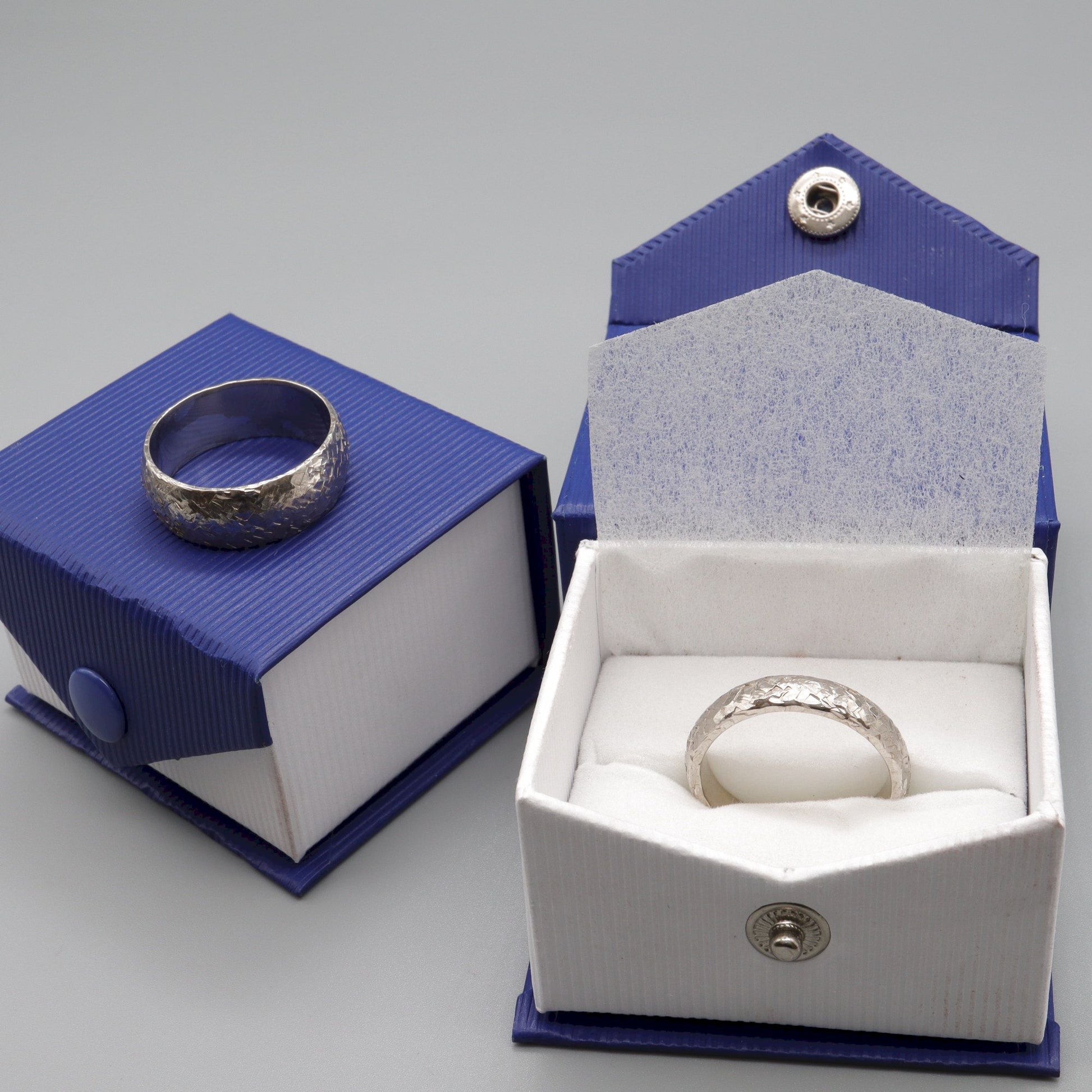 Each one is handmade making a unique individual pattern on every ring. Both rings are made on a heavy court band.