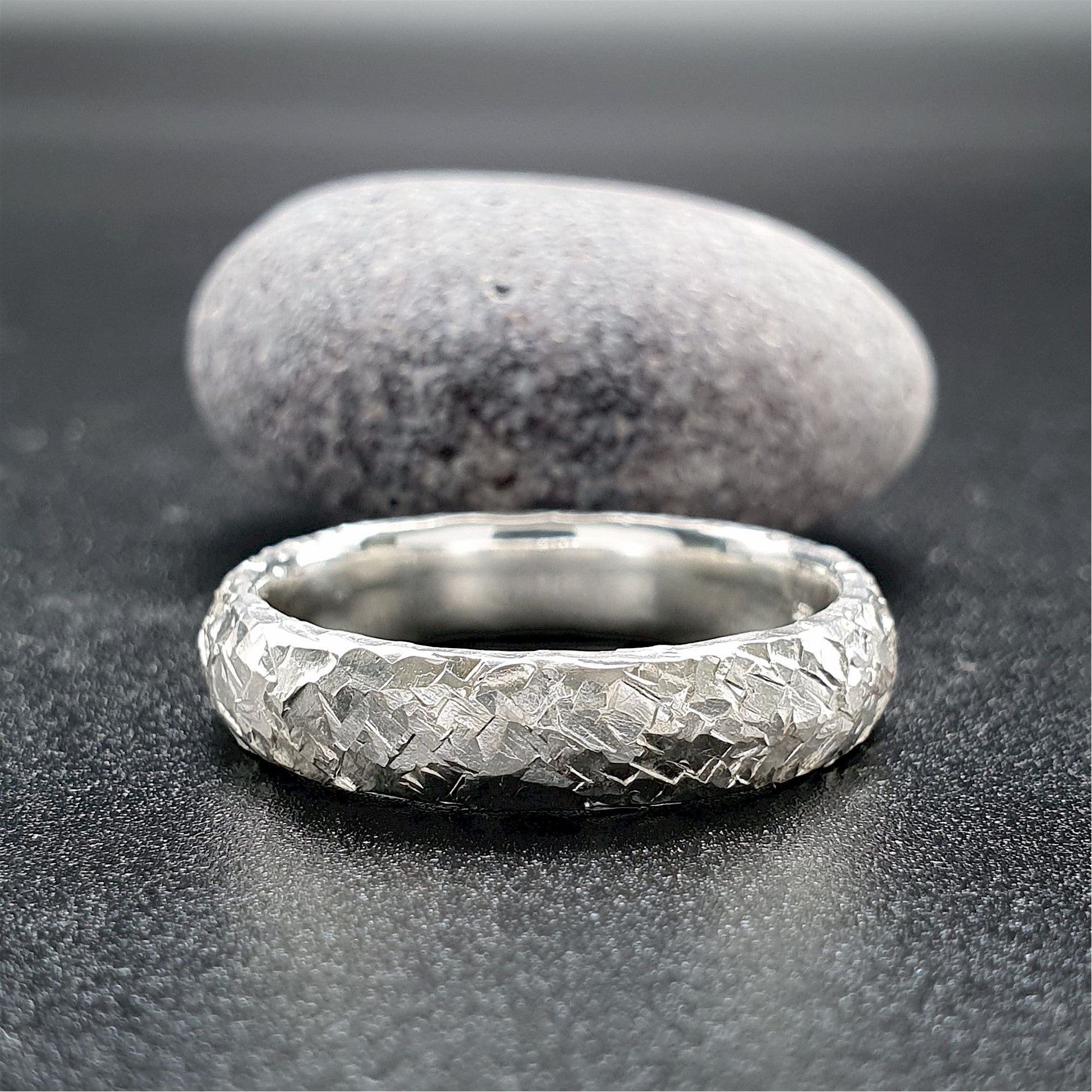 Fire hammered wedding rings. Each one is handmade with a unique texture individual hammered pattern on every band with a polished inside so no ring is ever exactly alike.