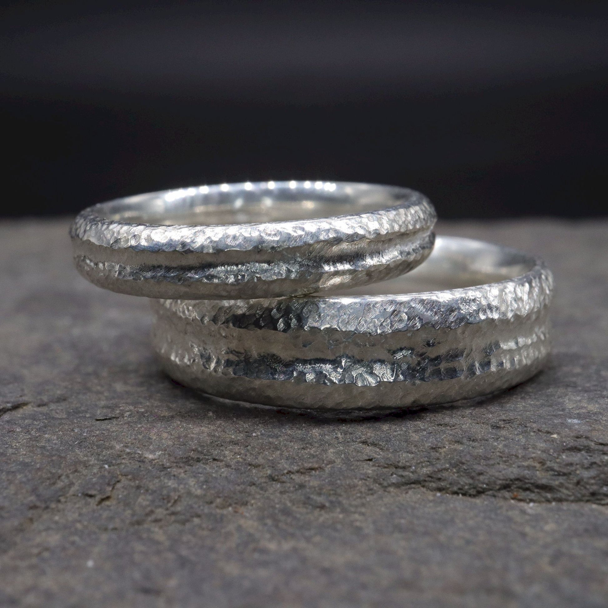 Fleetwith Pike silver matching wedding ring set - rustic carved textured band - original men`s and women`s design - 4mm and 6mm.