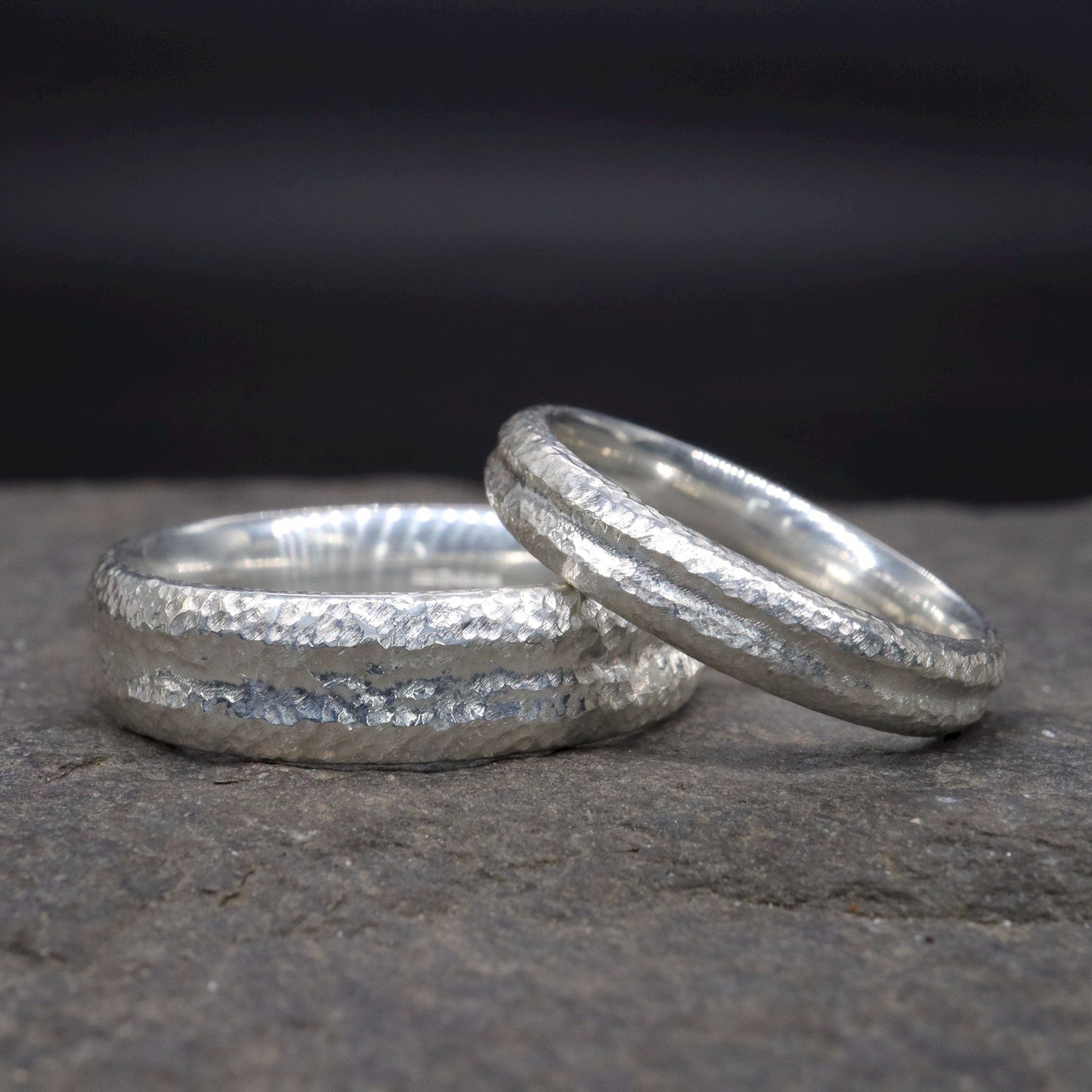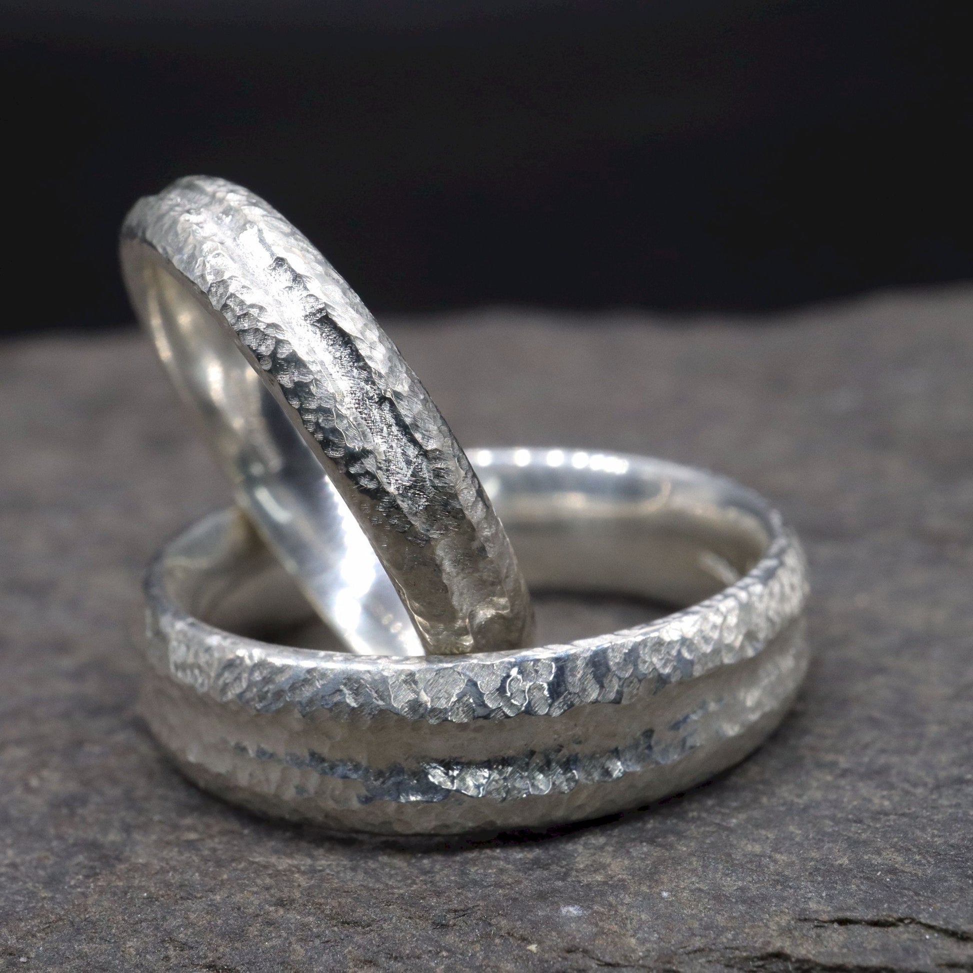 Each one is handmade creating a unique individual pattern on every ring so no two are exactly alike. Both the 4mm and 6mm rings are made on a heavy court band.