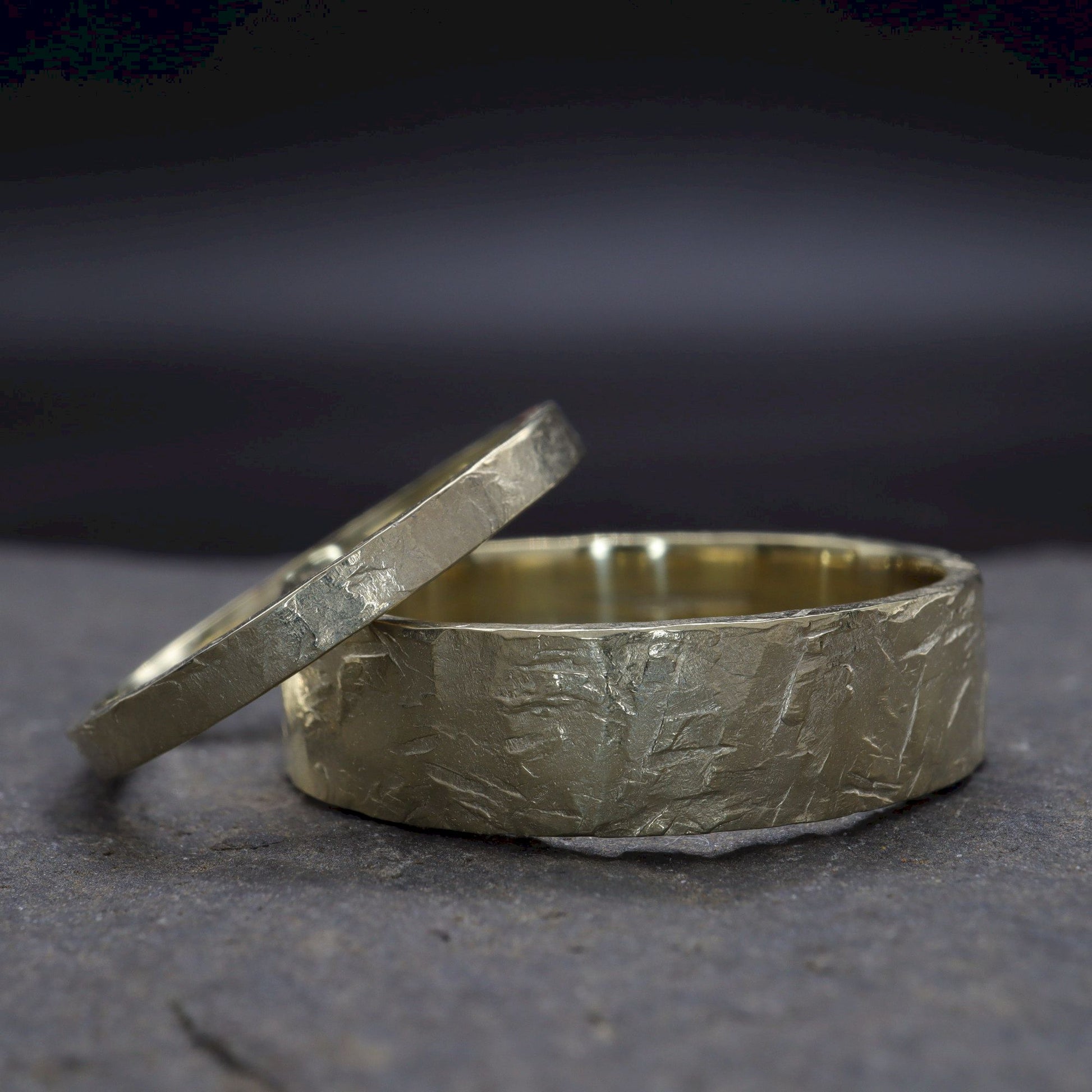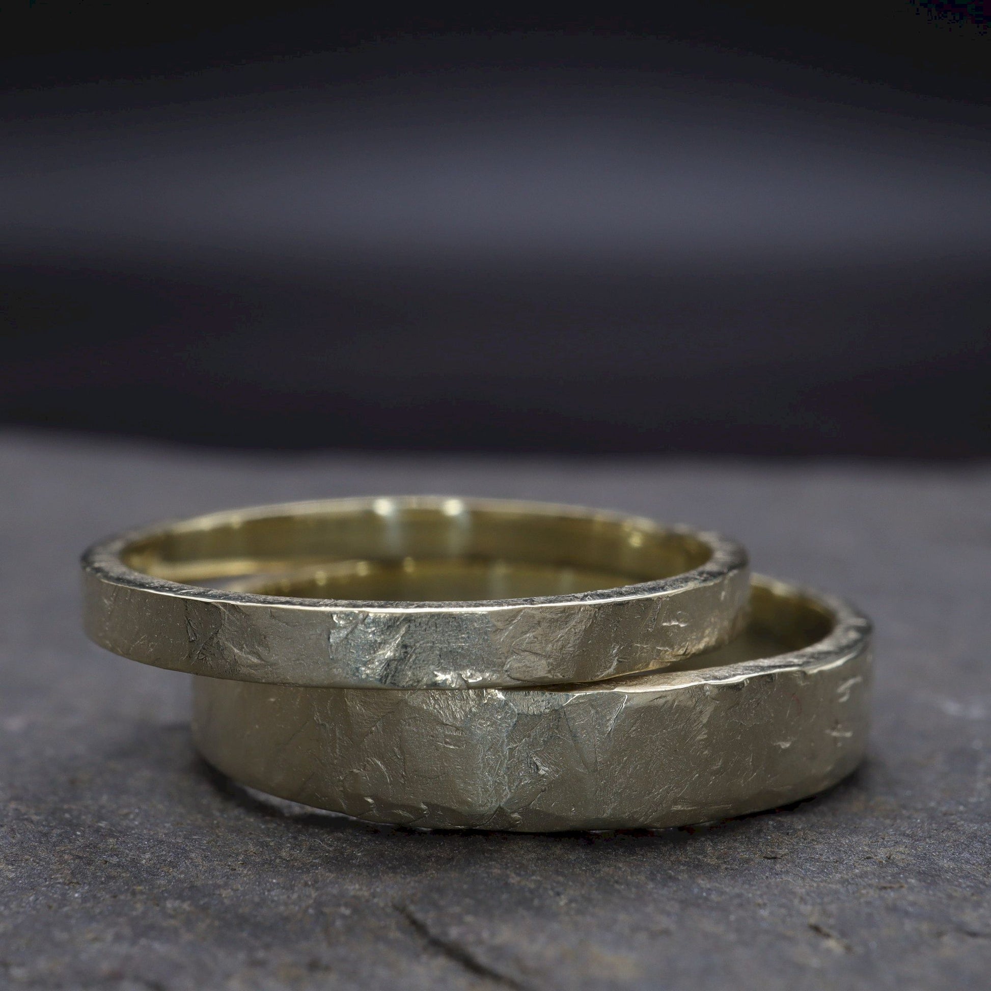 This is my Windermere design matching wedding ring set. They have been finished with an original hammered distressed texture.