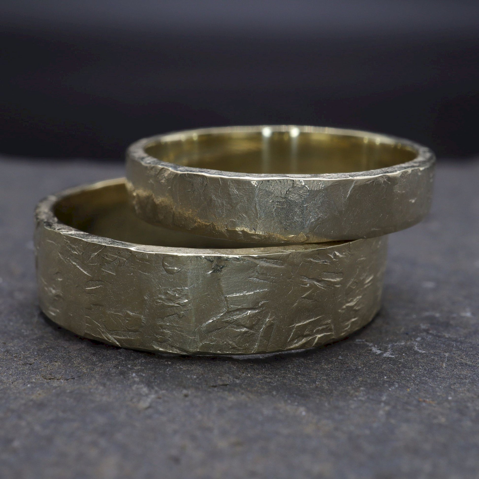 Made from recycled eco-friendly gold they are available in 2mm, 3mm, 4mm, 5mm, 6mm and 8mm widths on heavy flat bands. Each one is handmade creating a unique individual pattern on every ring so no two are exactly alike.