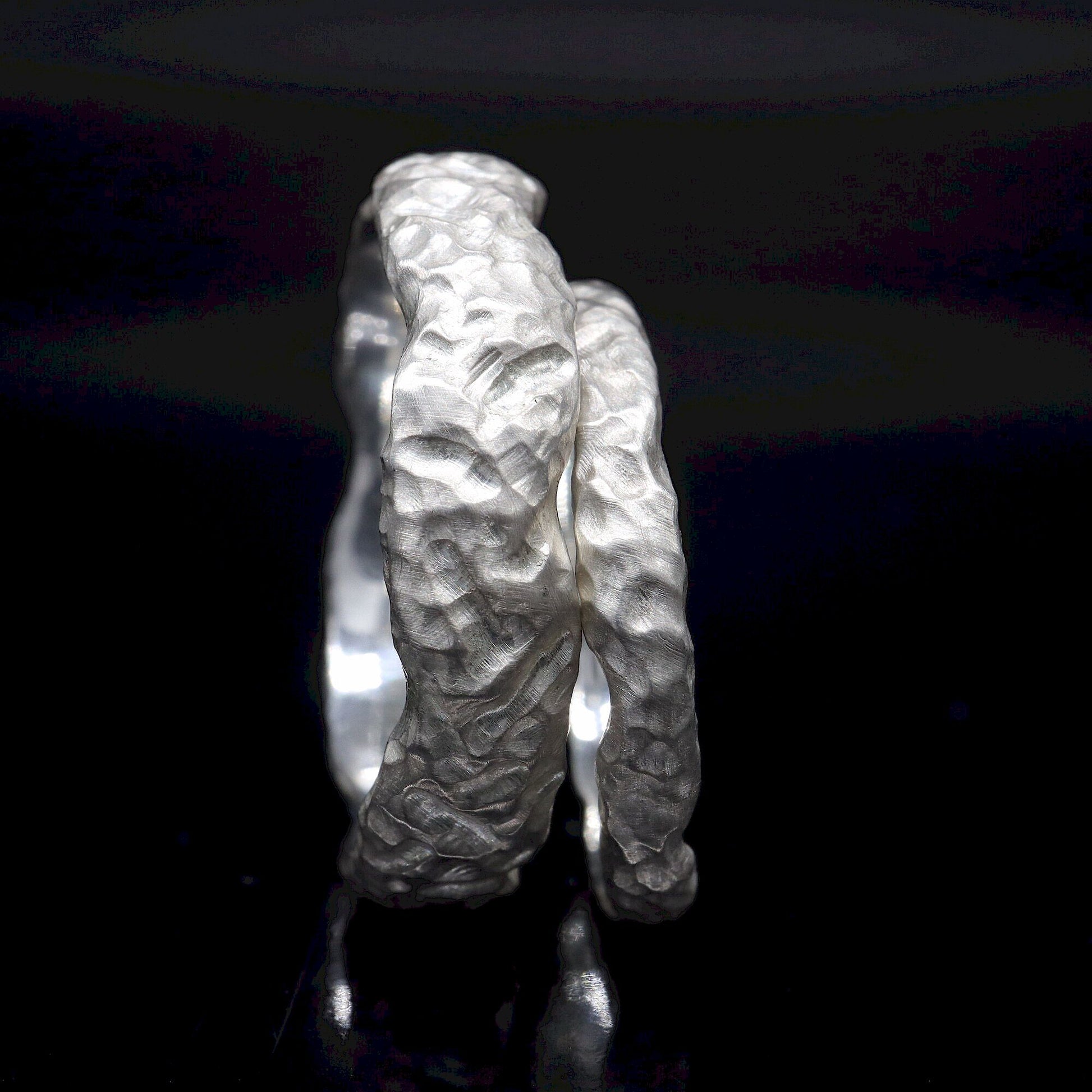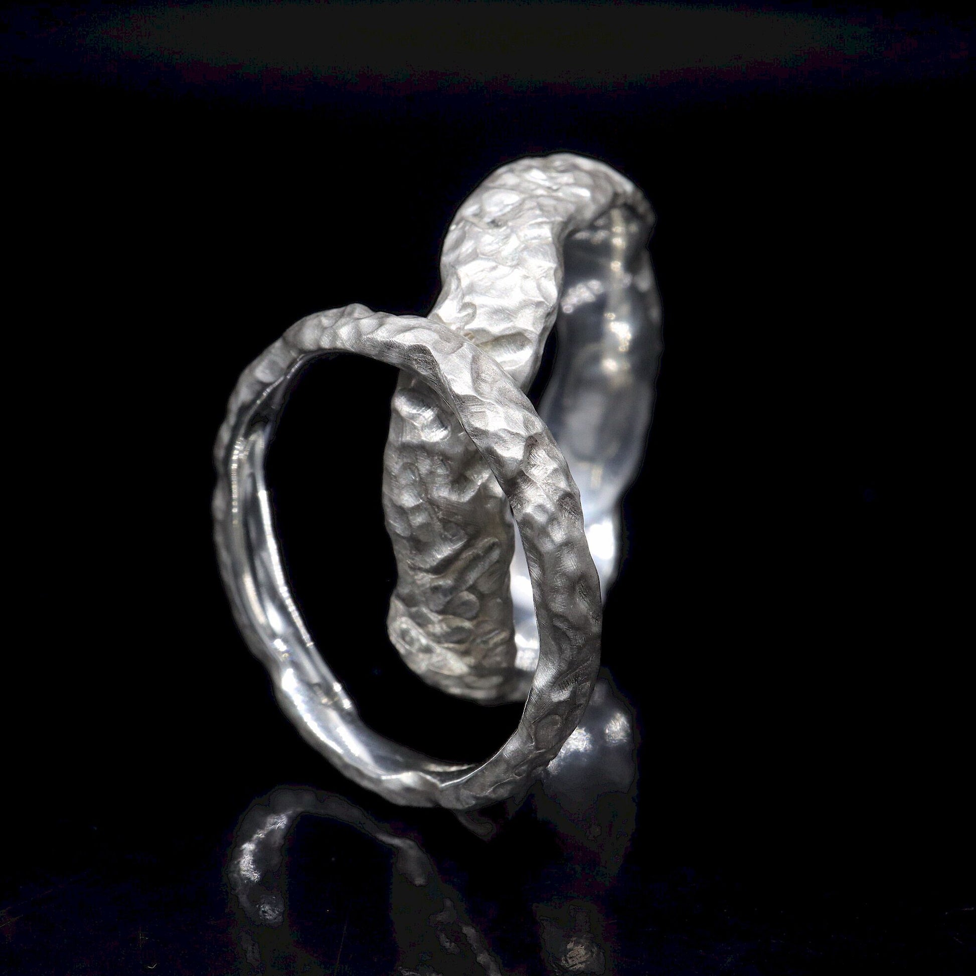 Each one is handmade creating a unique individual pattern on every ring so no two are exactly alike. Both the 3mm and 6mm rings are made on a heavy court band.