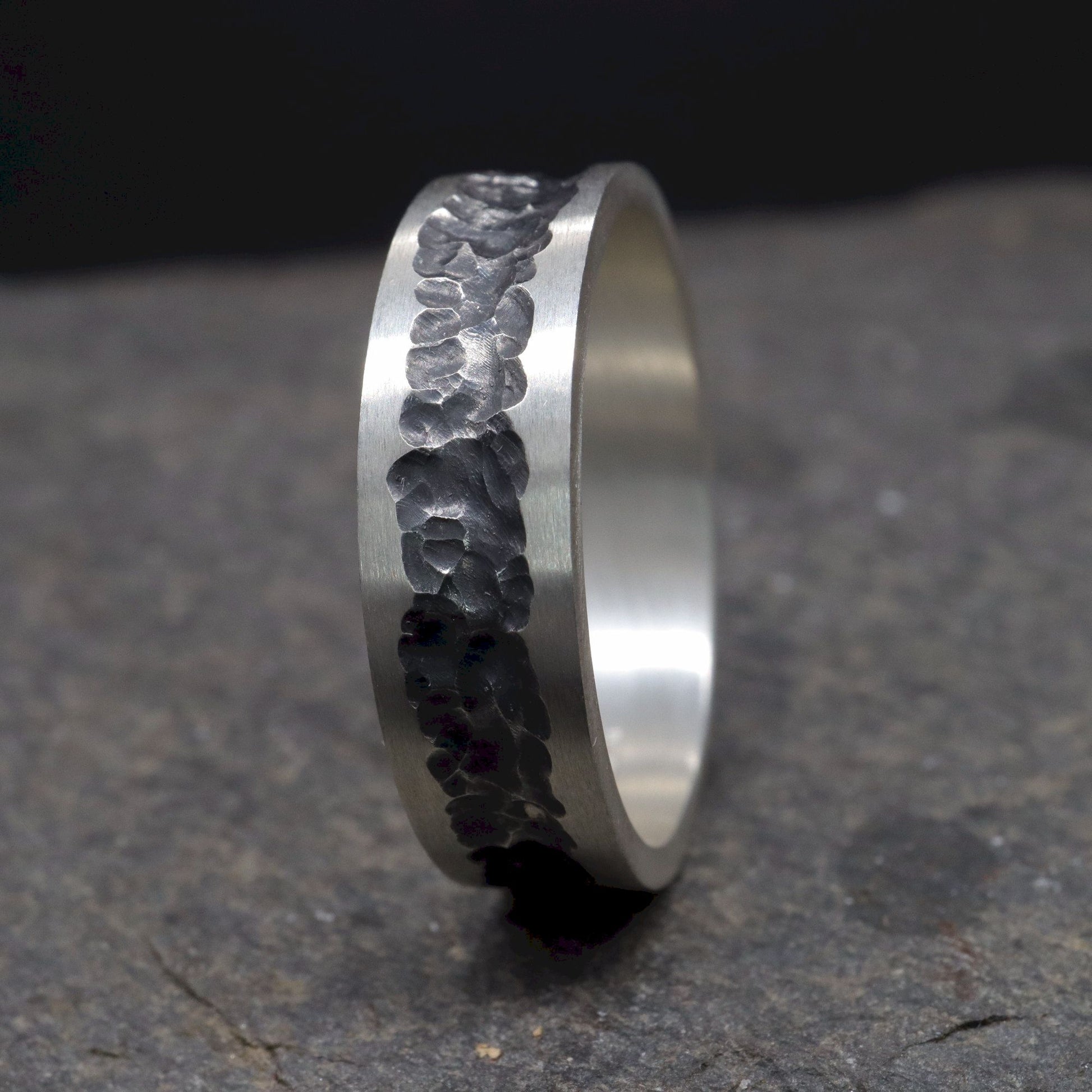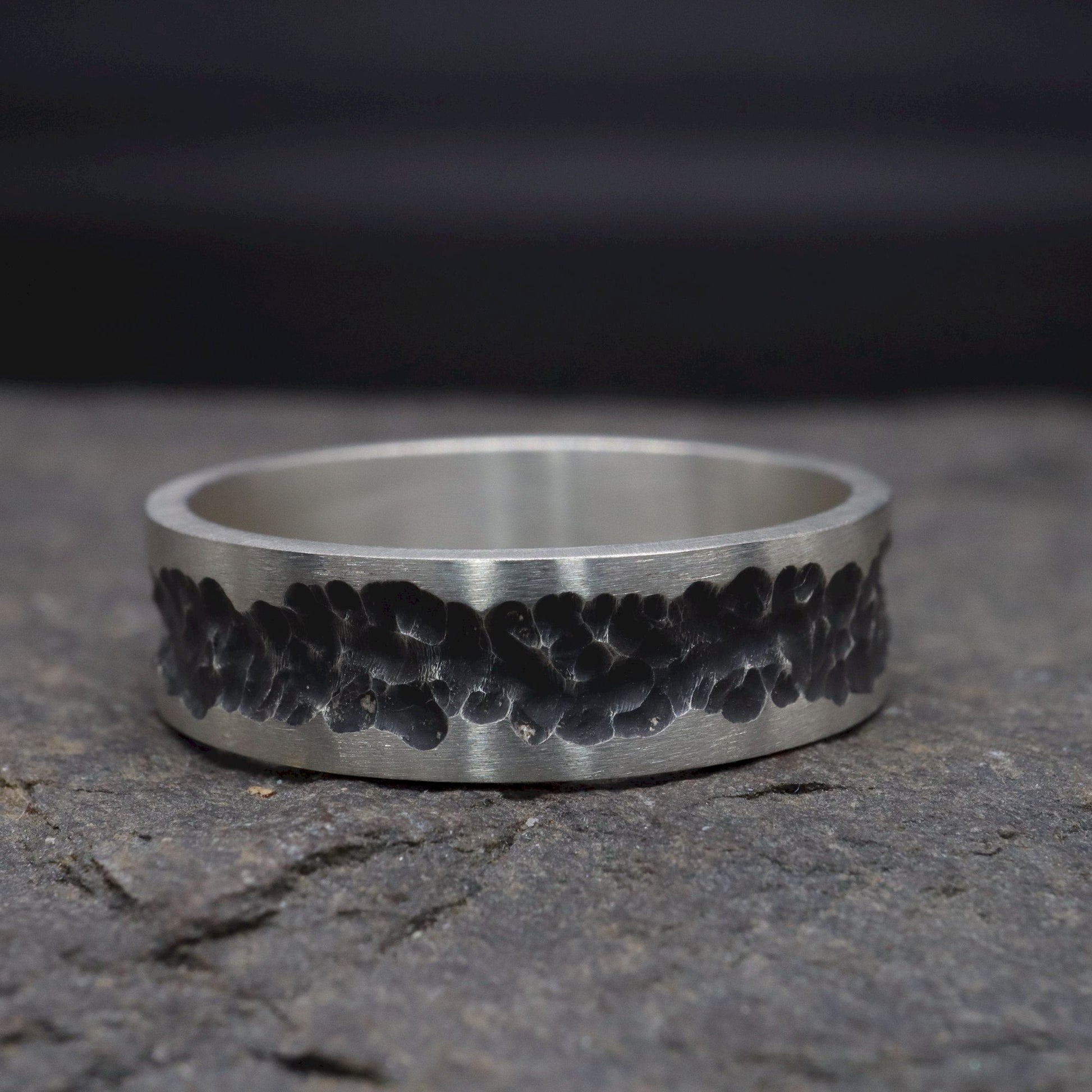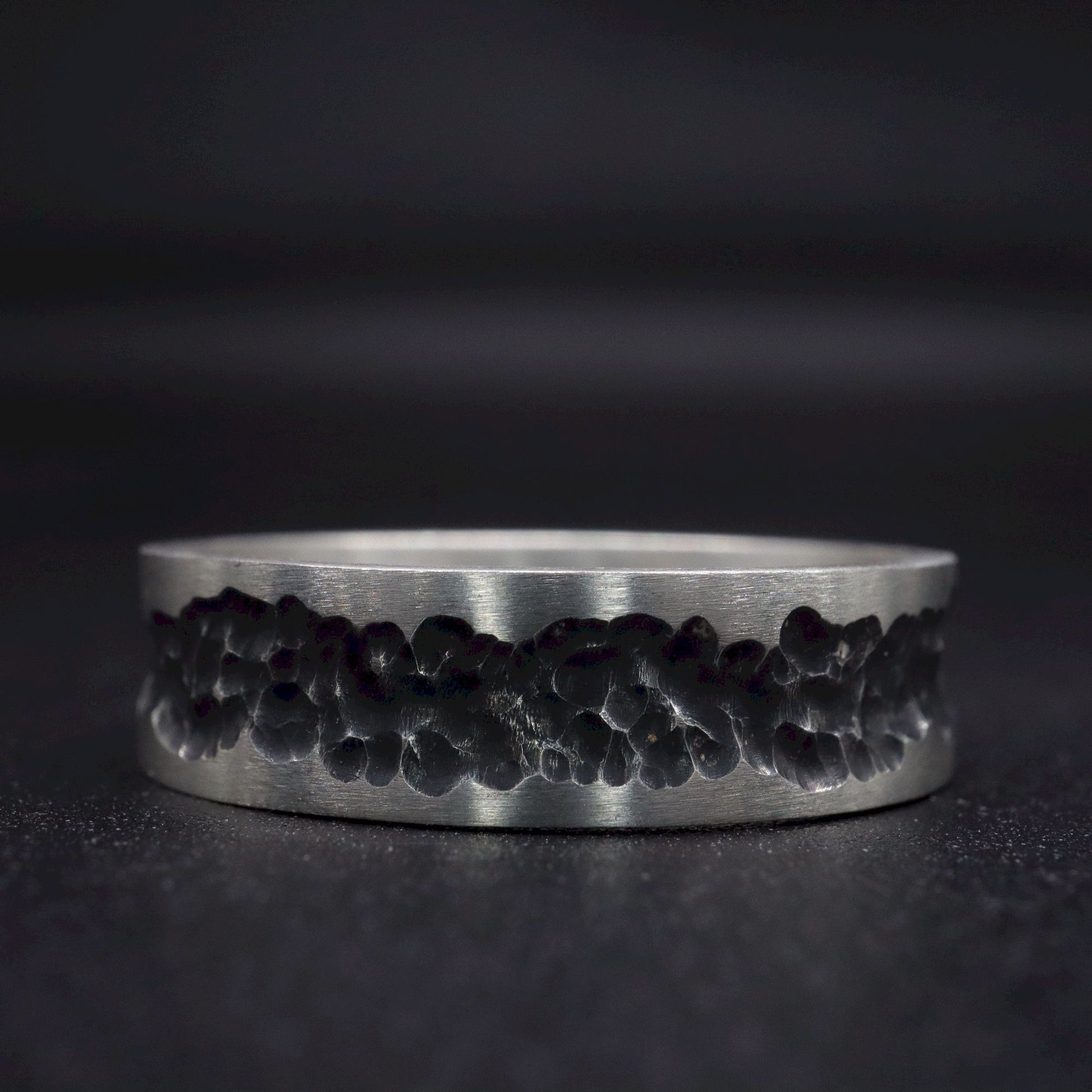 The black version is made from silver and is available in 5mm, 6mm and 8mm wide on a flat band. The images seen is of the 6mm version.
