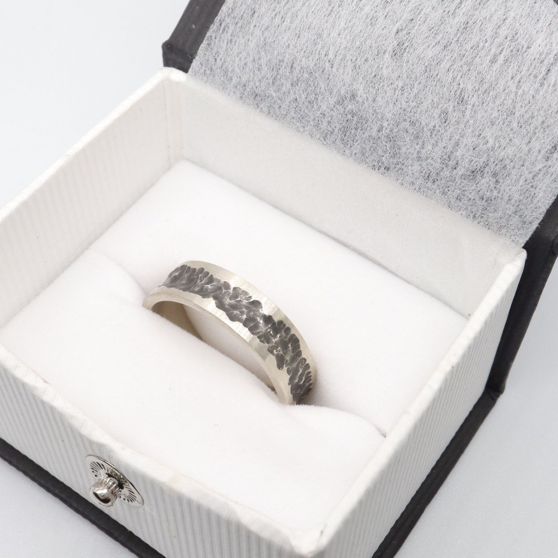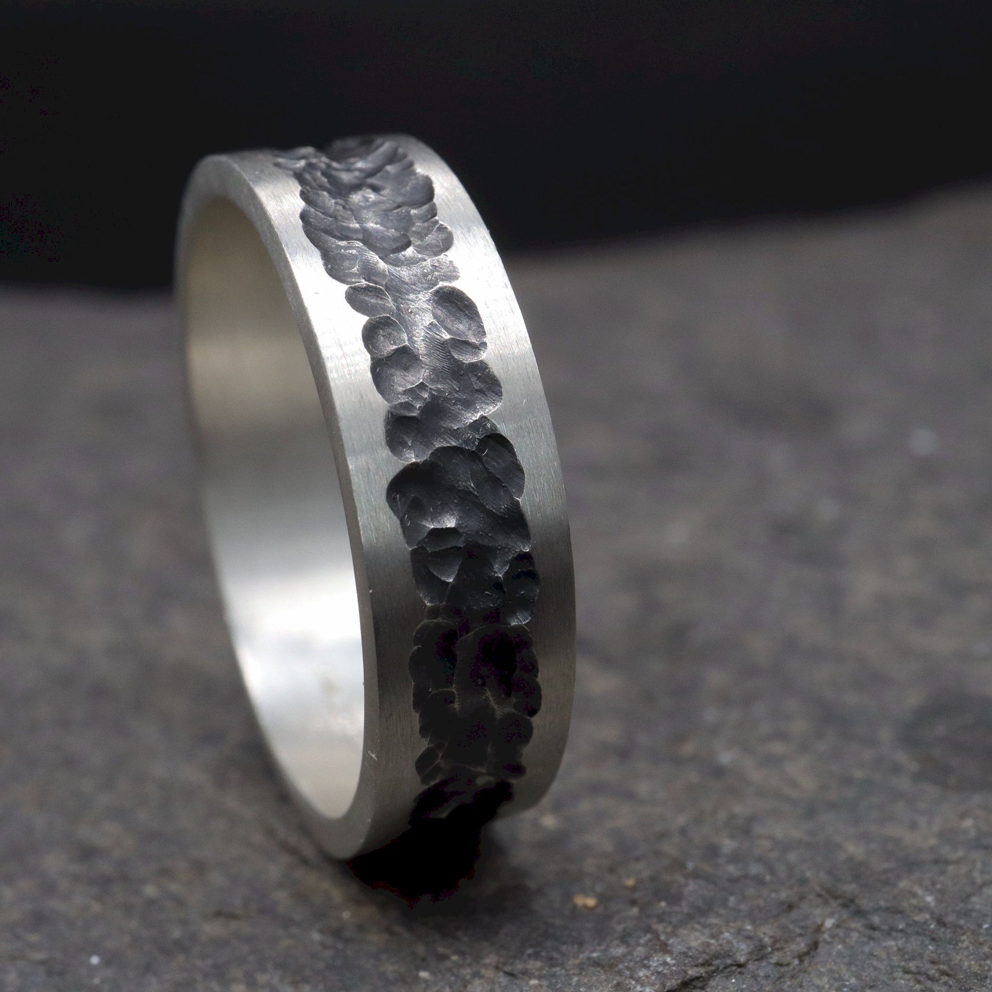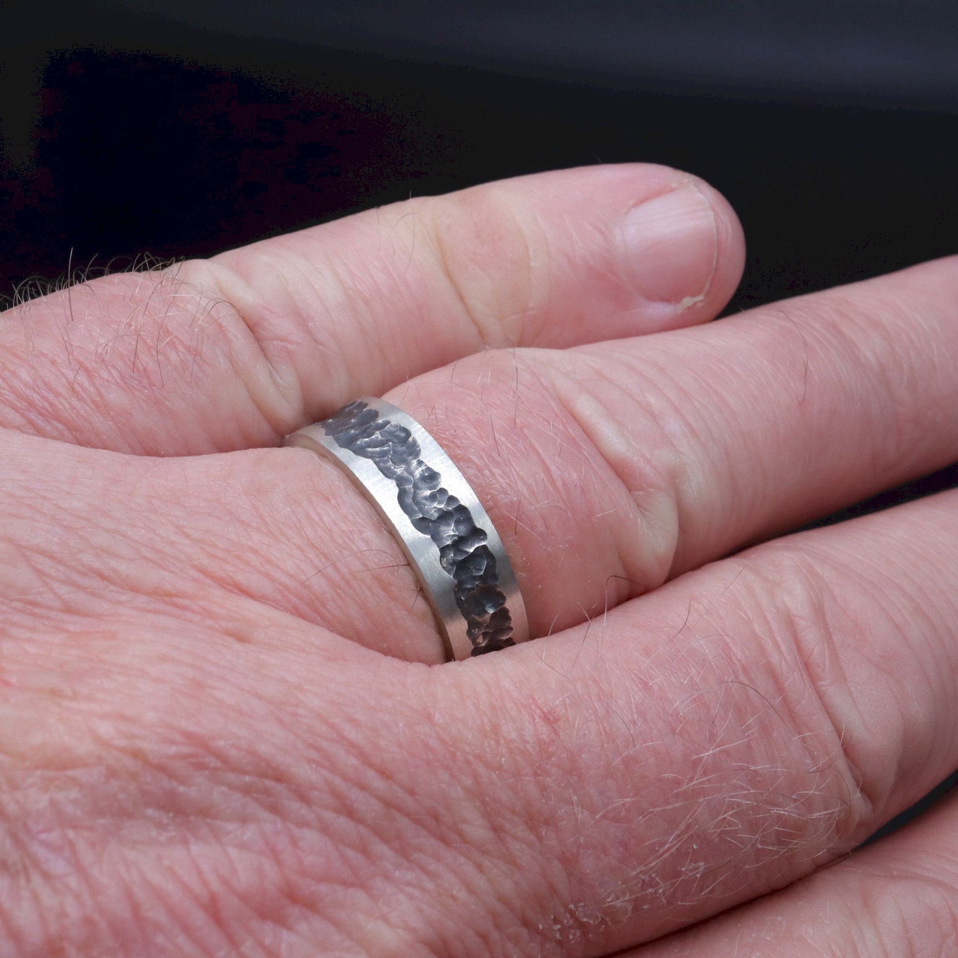 Mens wedding, engagement, promise or commitment ring, black silver carved out Cat Bells design.