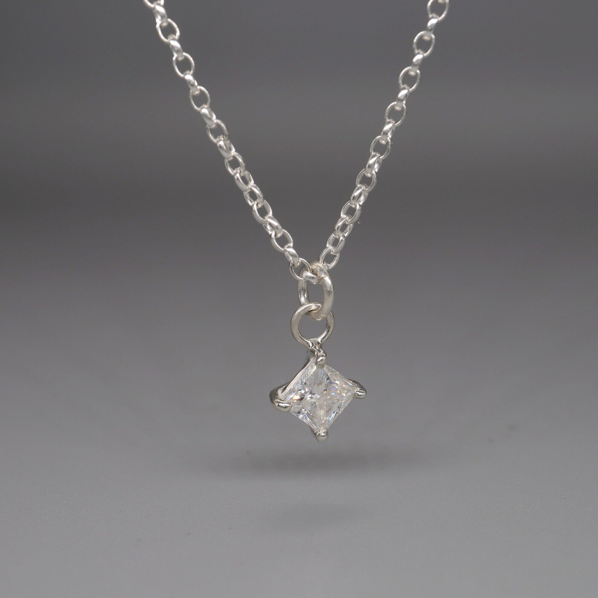Moissanite pendant, classic claw set drop style set with one 5mm square cut Moissanite and hung from an 18 inch silver chain complete with gift box.