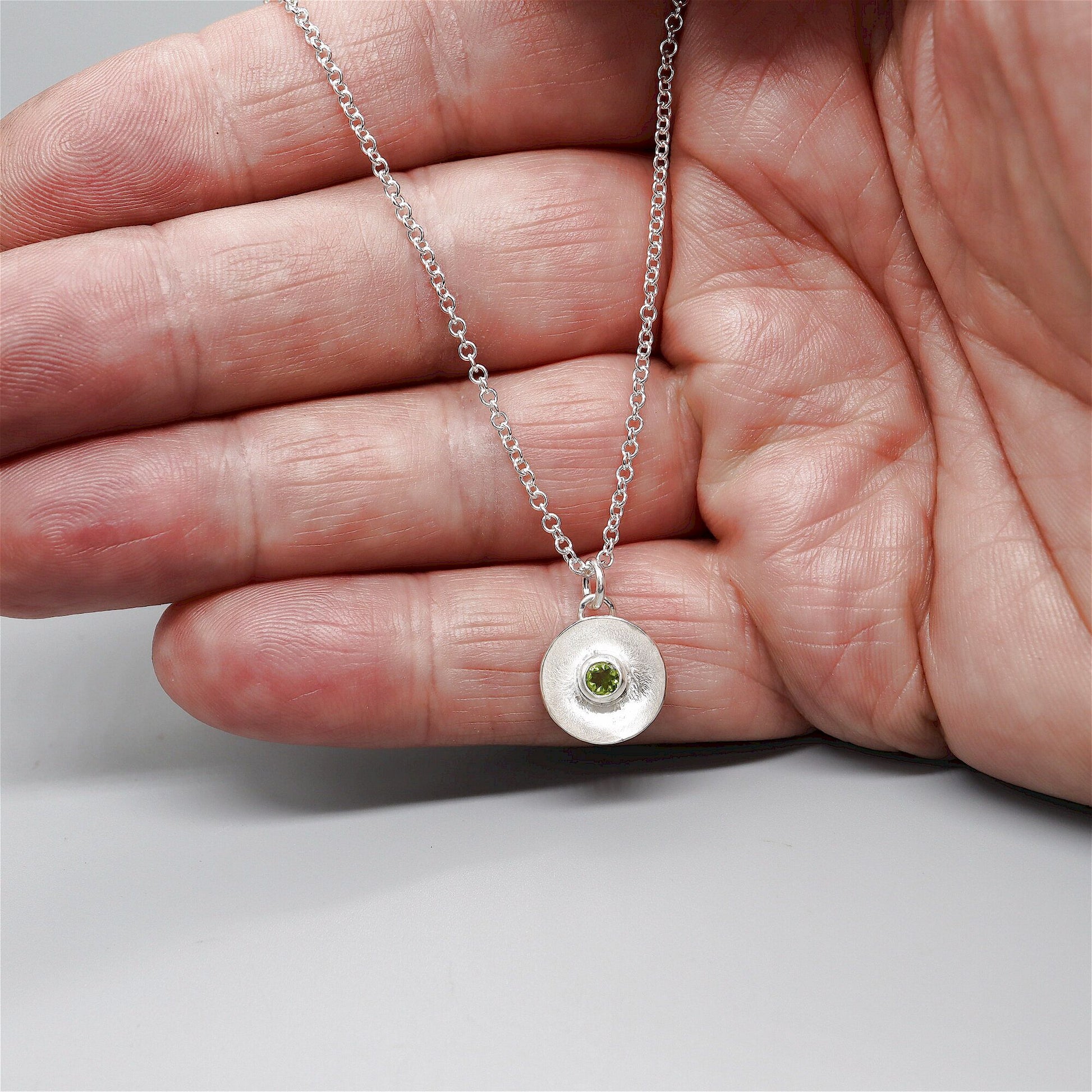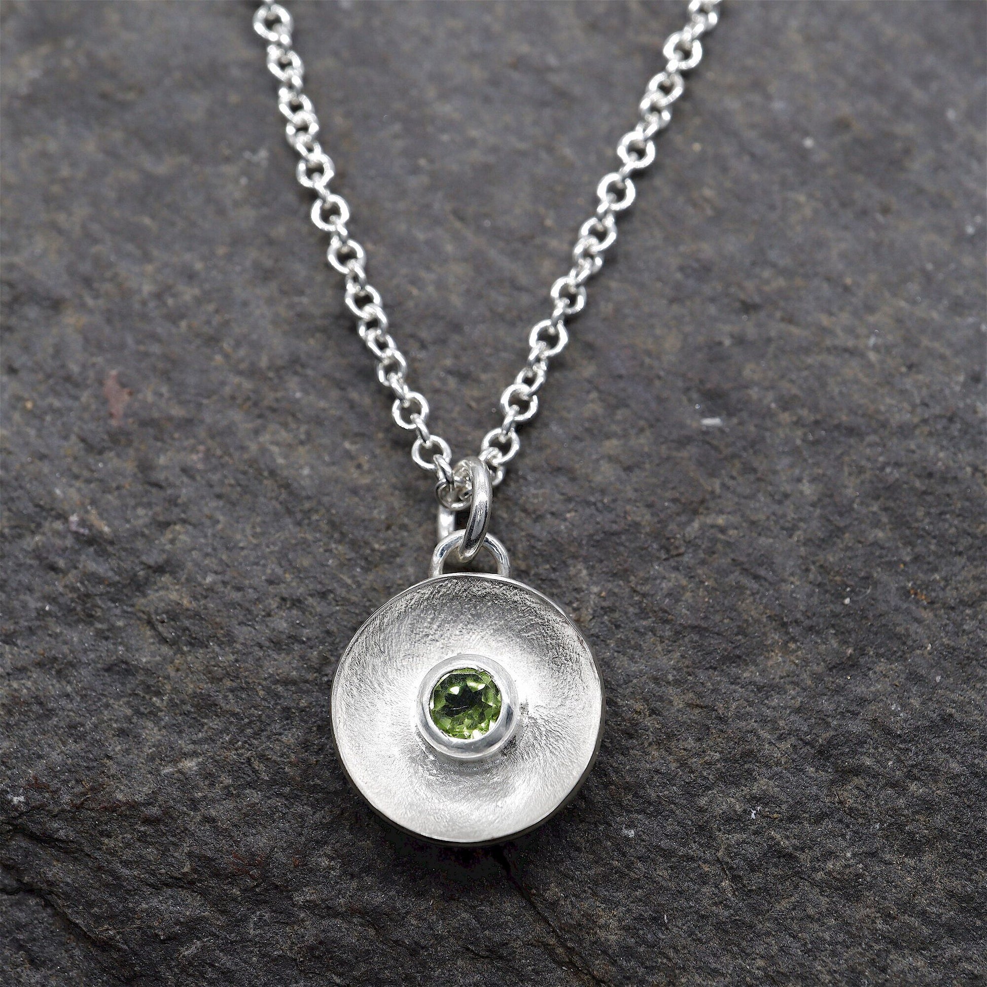 Water Droplets designed handmade pendant in silver set with one 4mm natural Peridot and hung from an 18 inch silver chain complete with gift box.