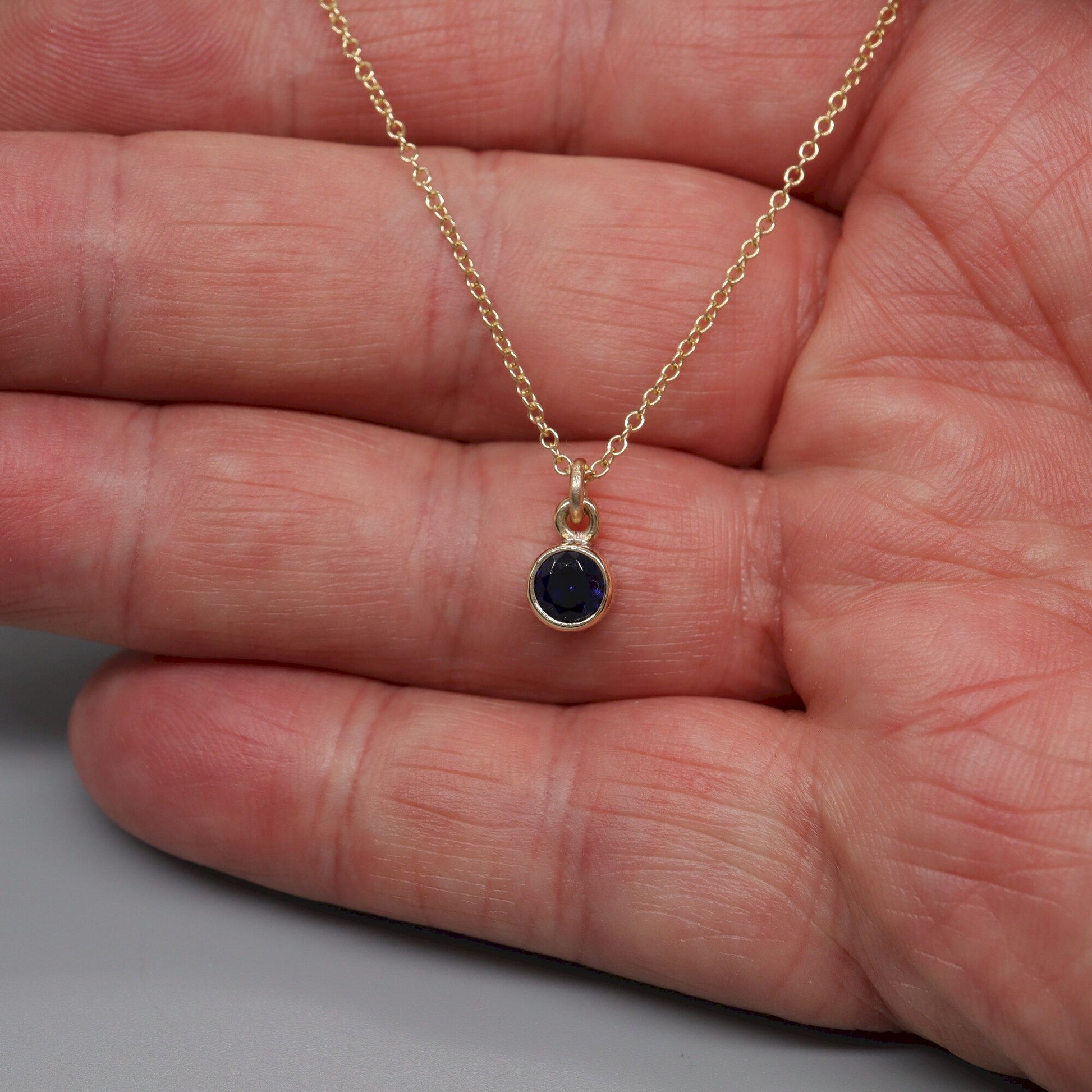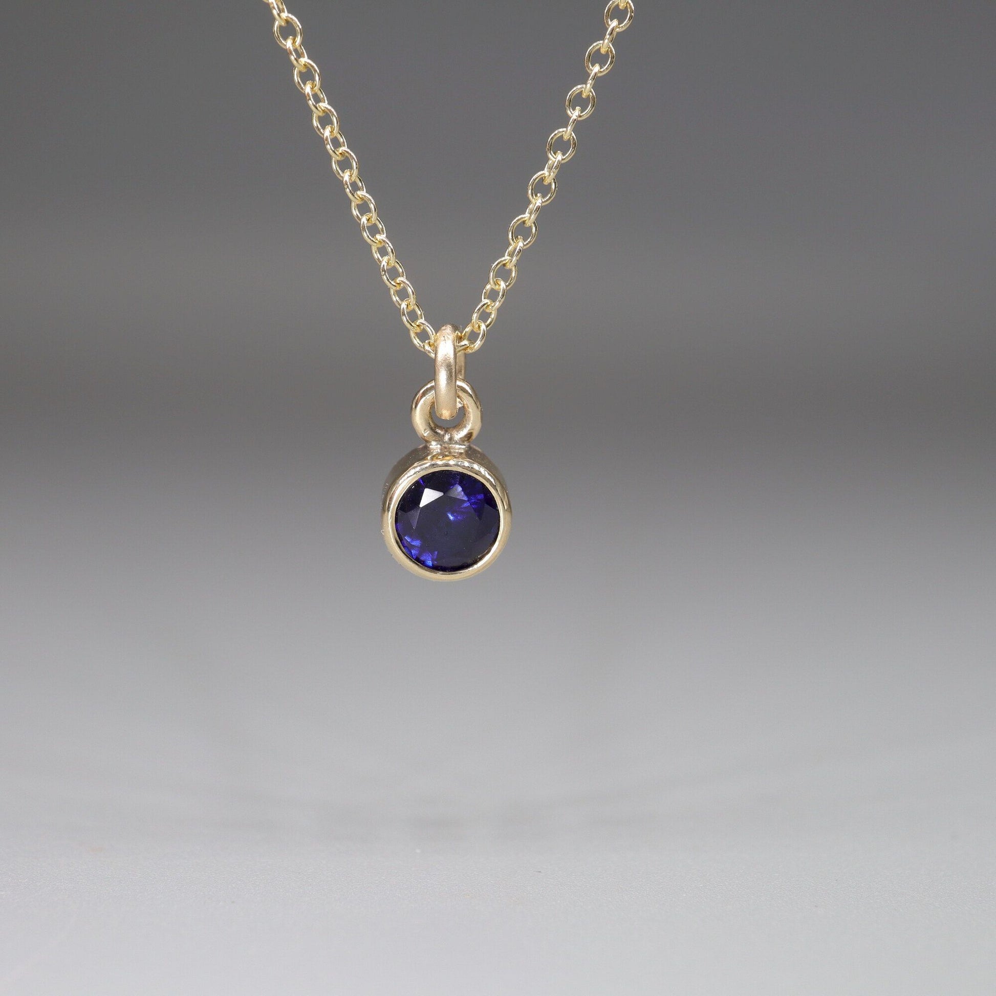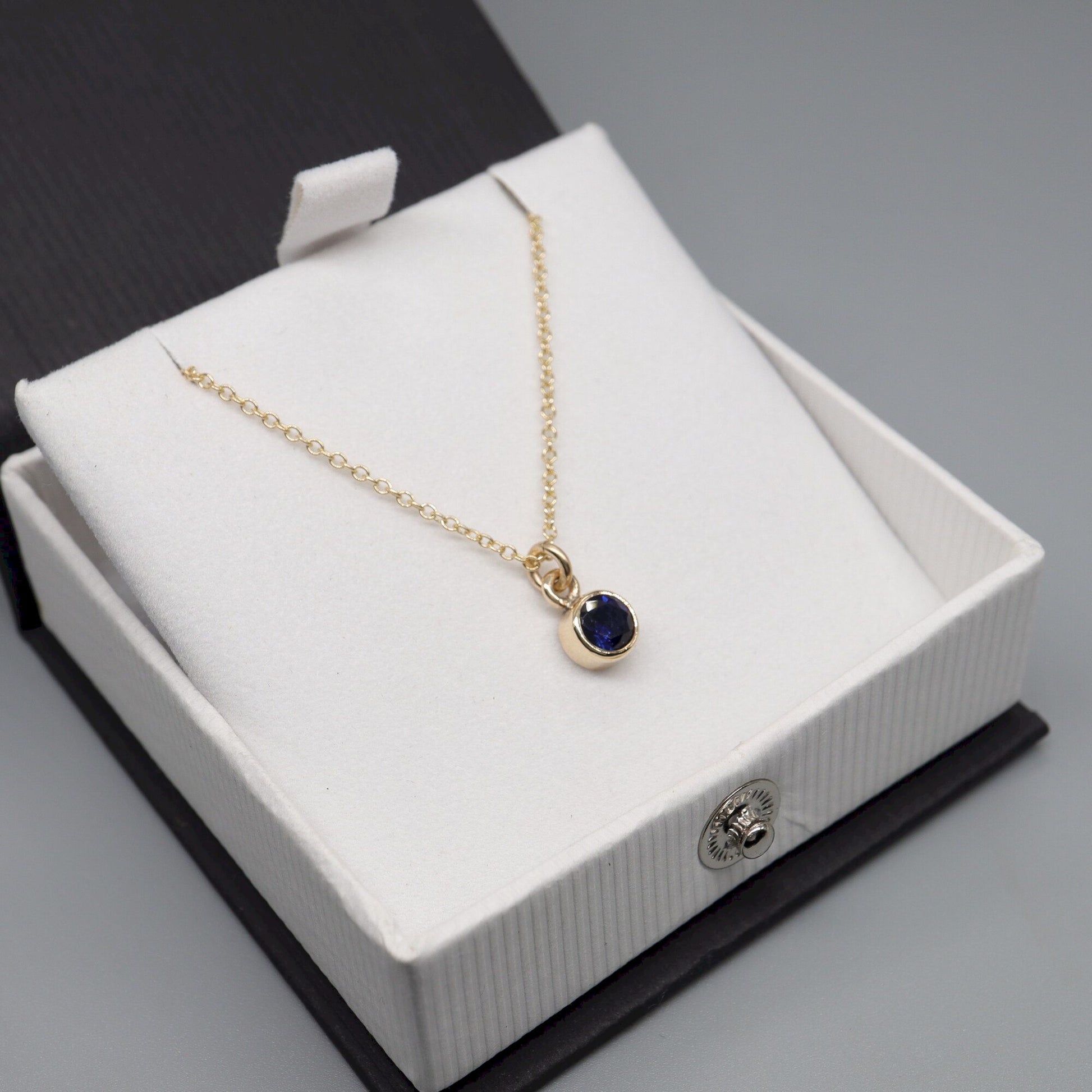 Blue sapphire pendant in a yellow gold rub over setting hung from an 18 inch solid yellow gold chain. A popular classic style necklace for every day use set with the birthstone for September