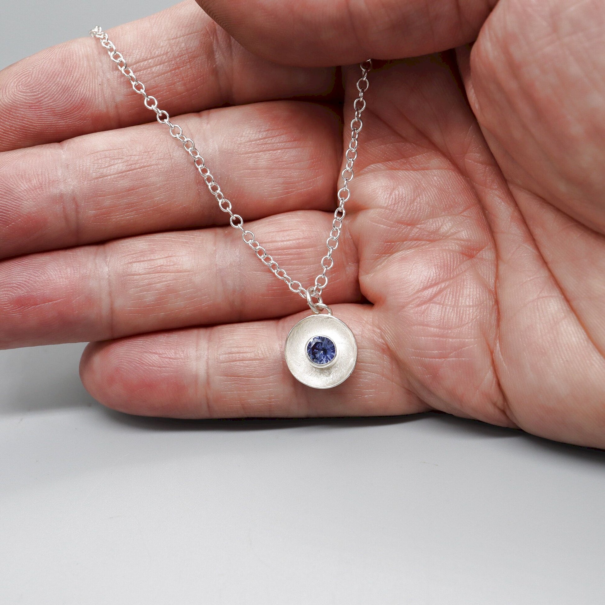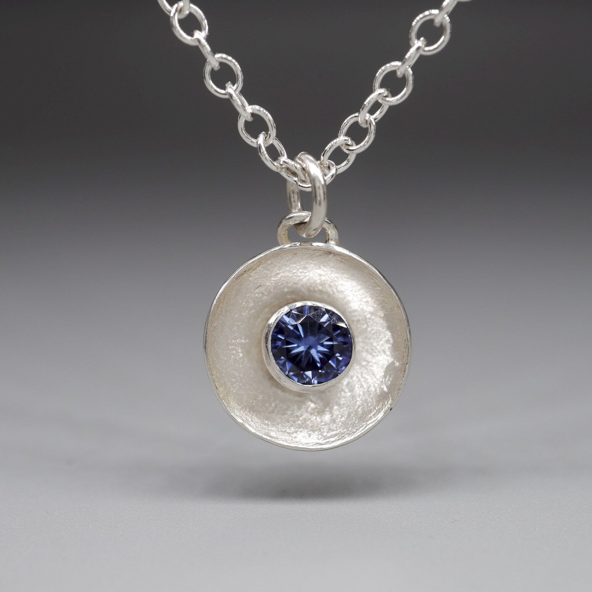 Water Droplets designed handmade pendant in silver set with one 5mm blue lab sapphire and hung from an 18 inch silver chain complete with gift box.