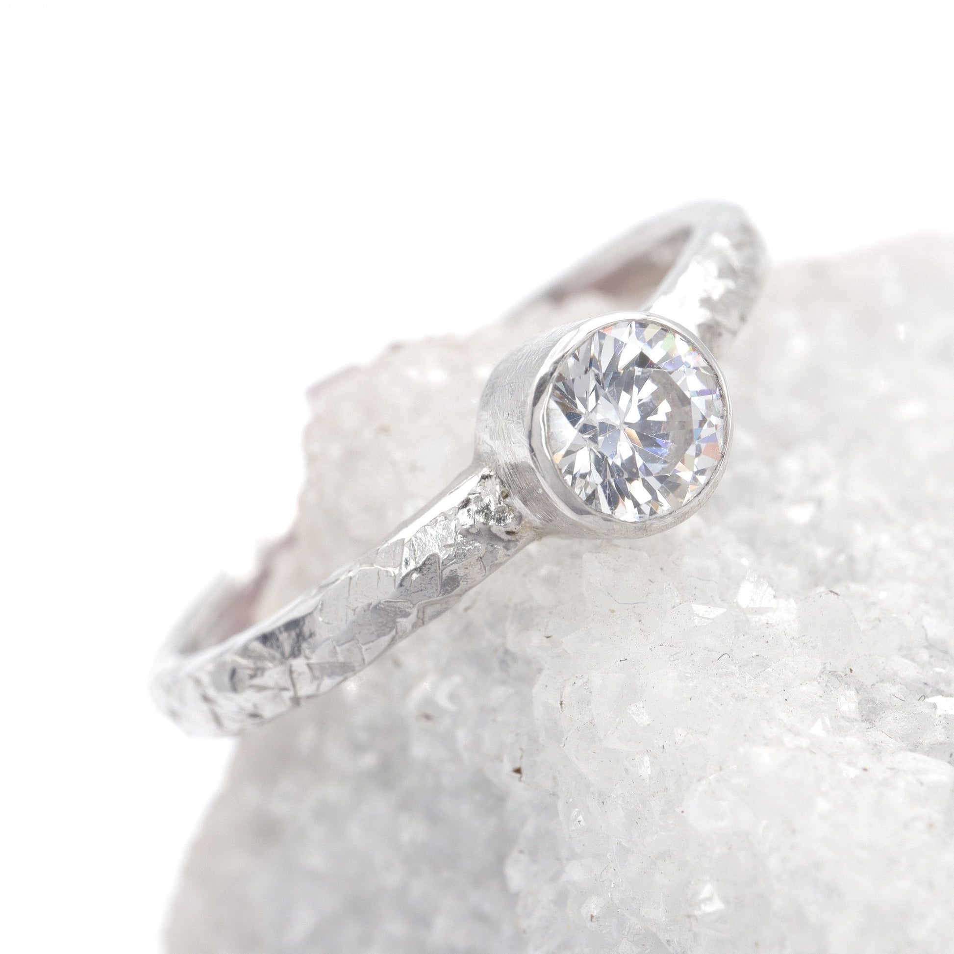 Solitaire diamond 18ct white gold ring. Fire hammered design set with one natural 0.33ct third of a carat diamond graded H-I,Si.