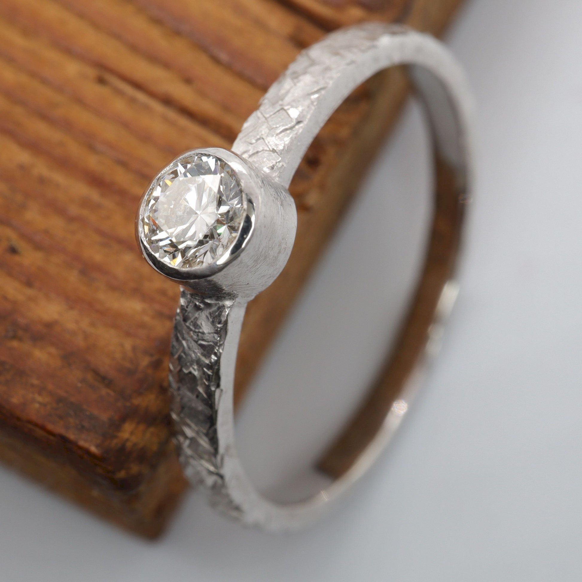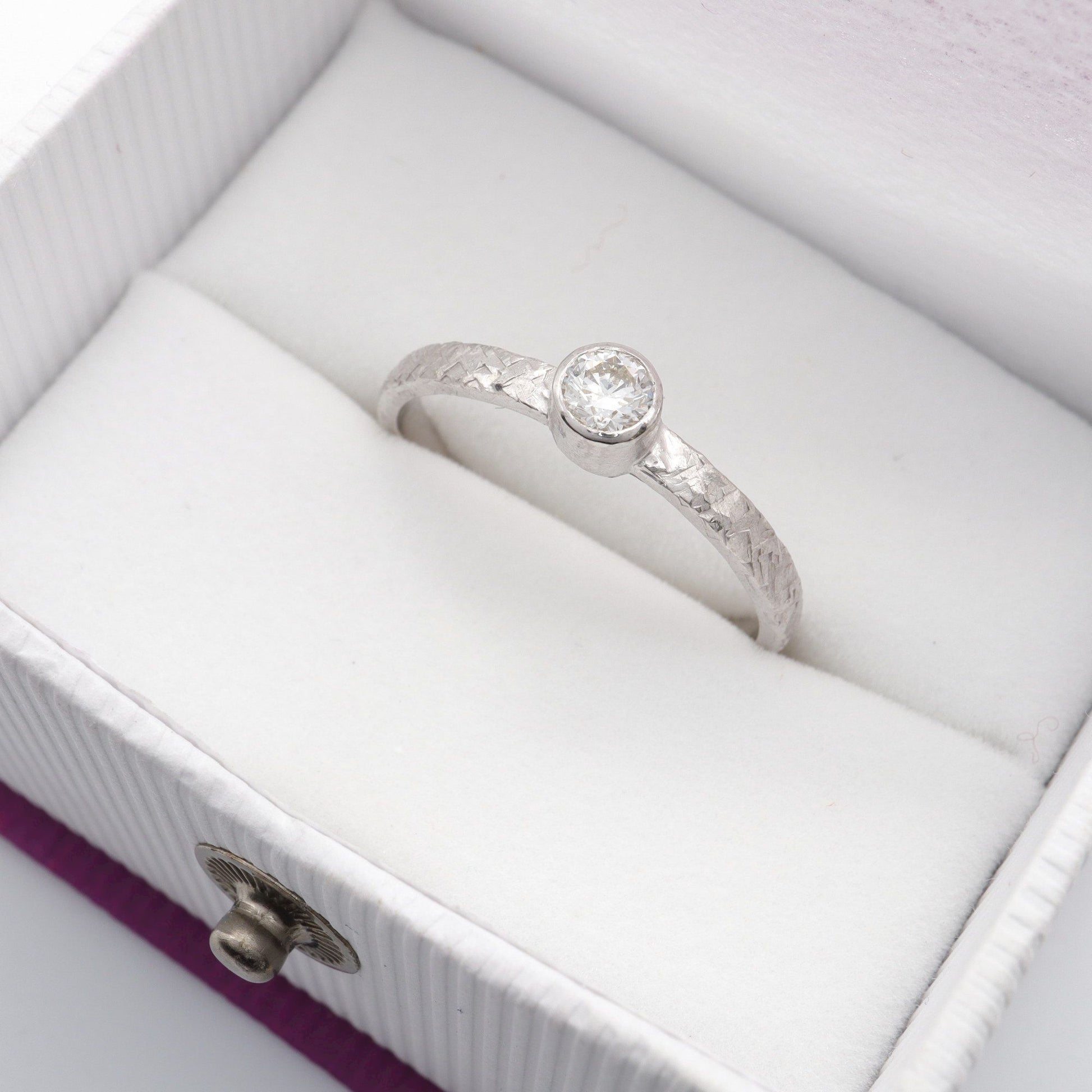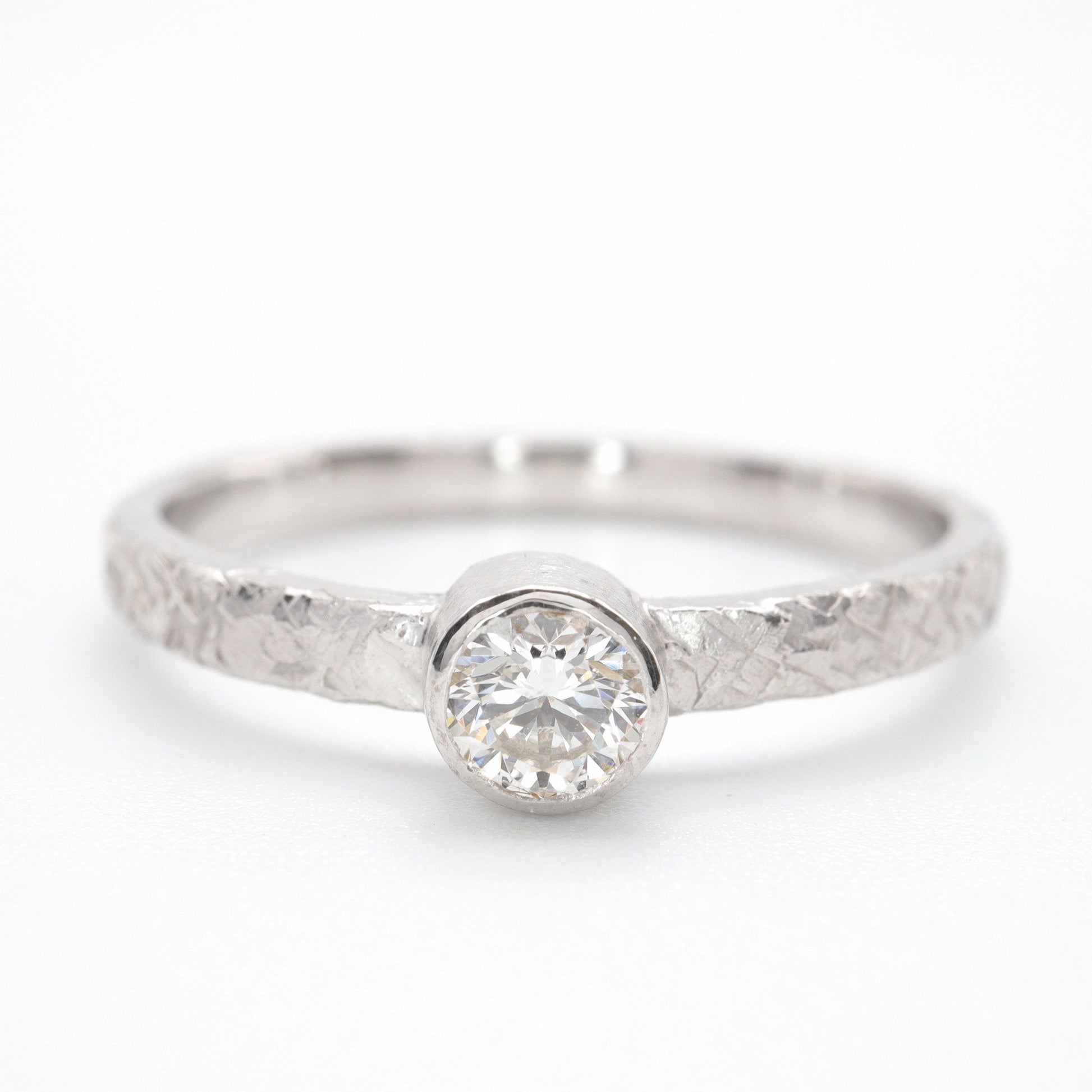 Solitaire diamond 18ct white gold ring. Fire hammered design set with one natural 0.25ct quarter carat diamond graded H-I,Si.