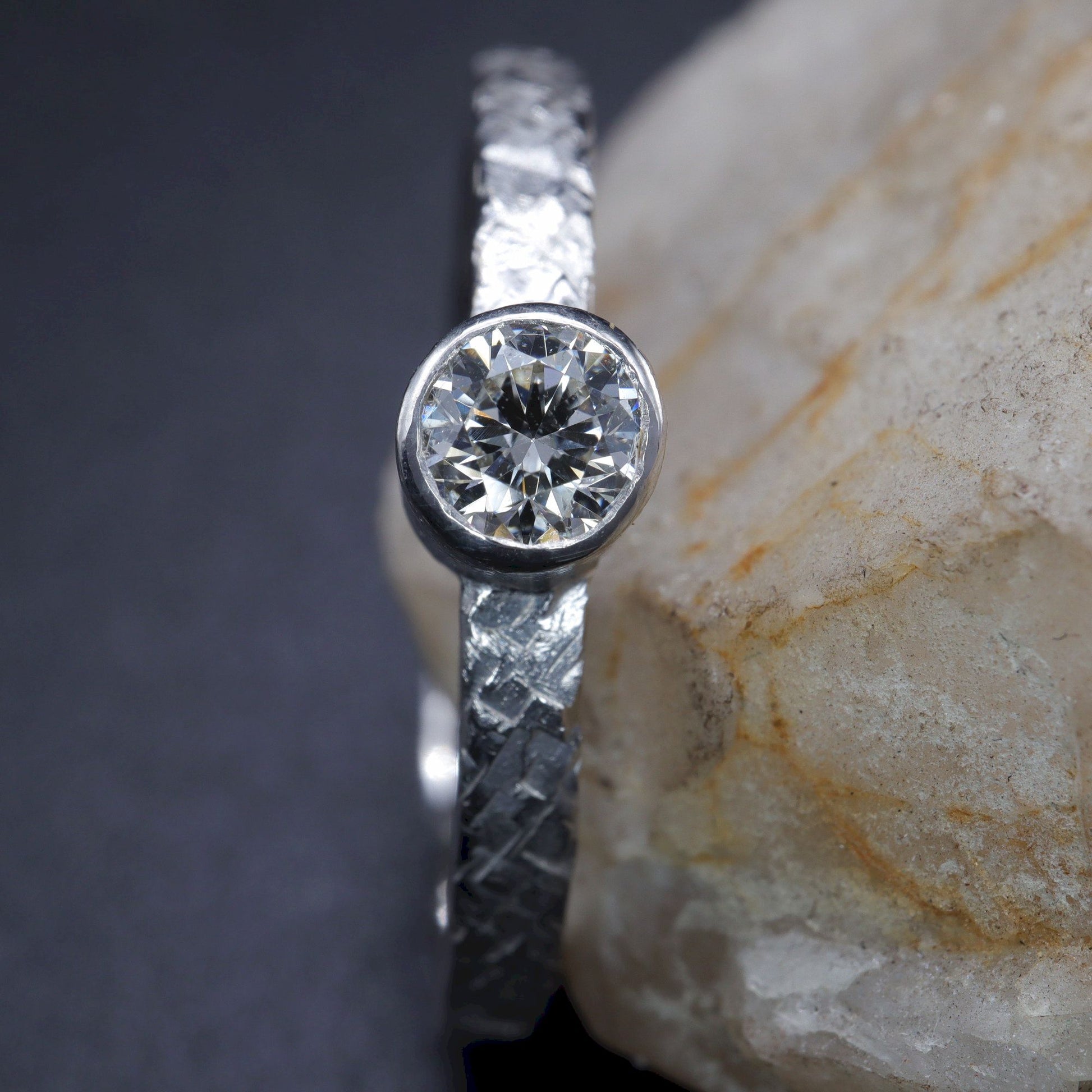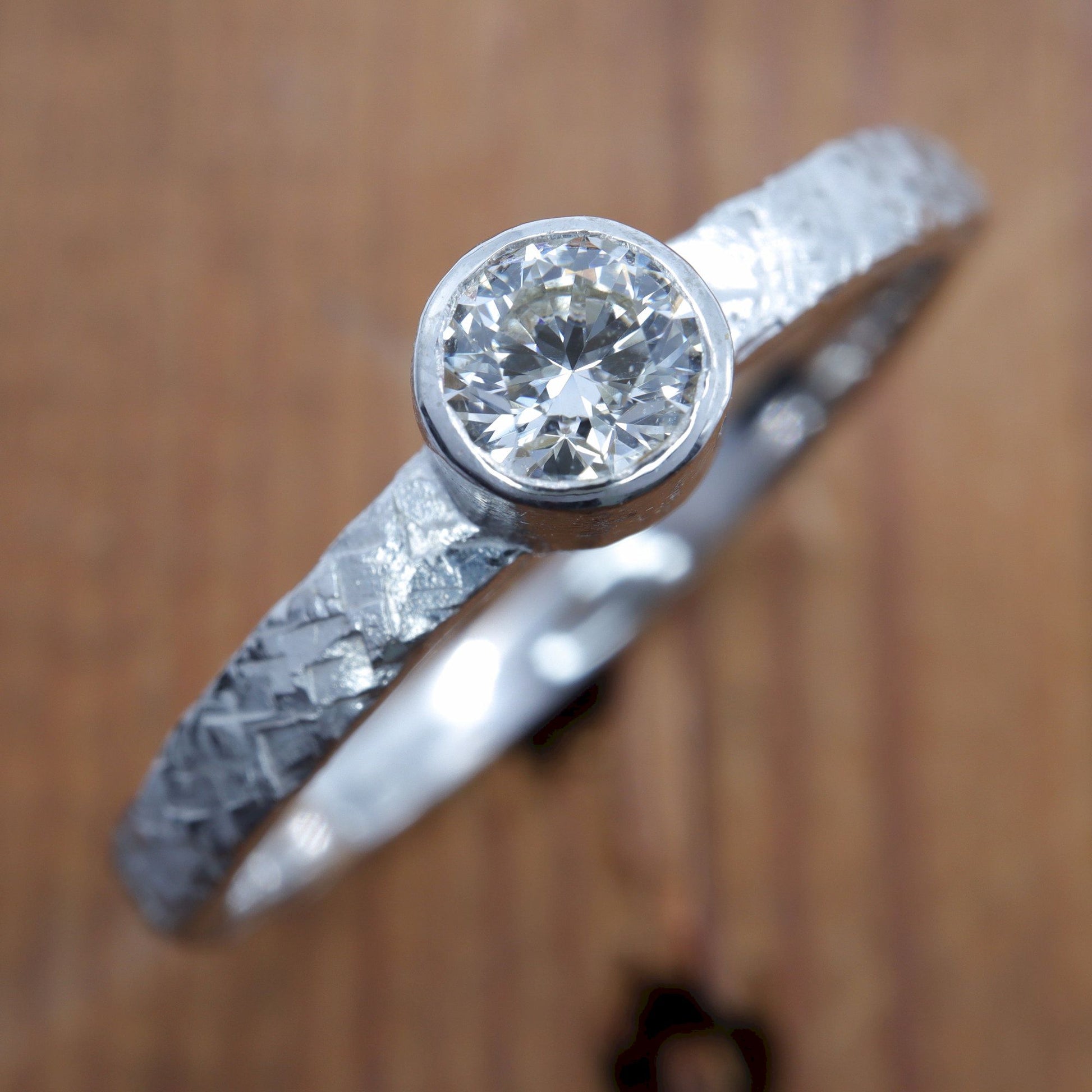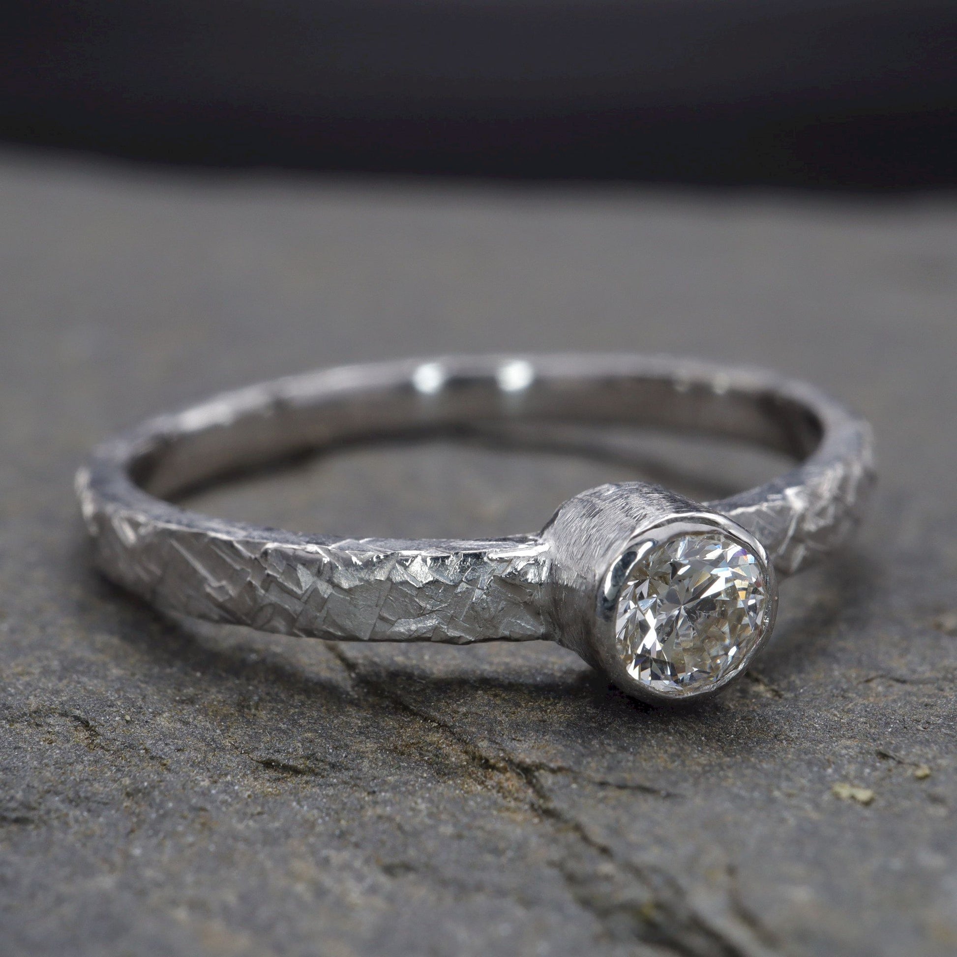 Solitaire diamond 18ct white gold ring. Fire hammered design set with one natural 0.25ct quarter carat diamond graded H-I,Si.