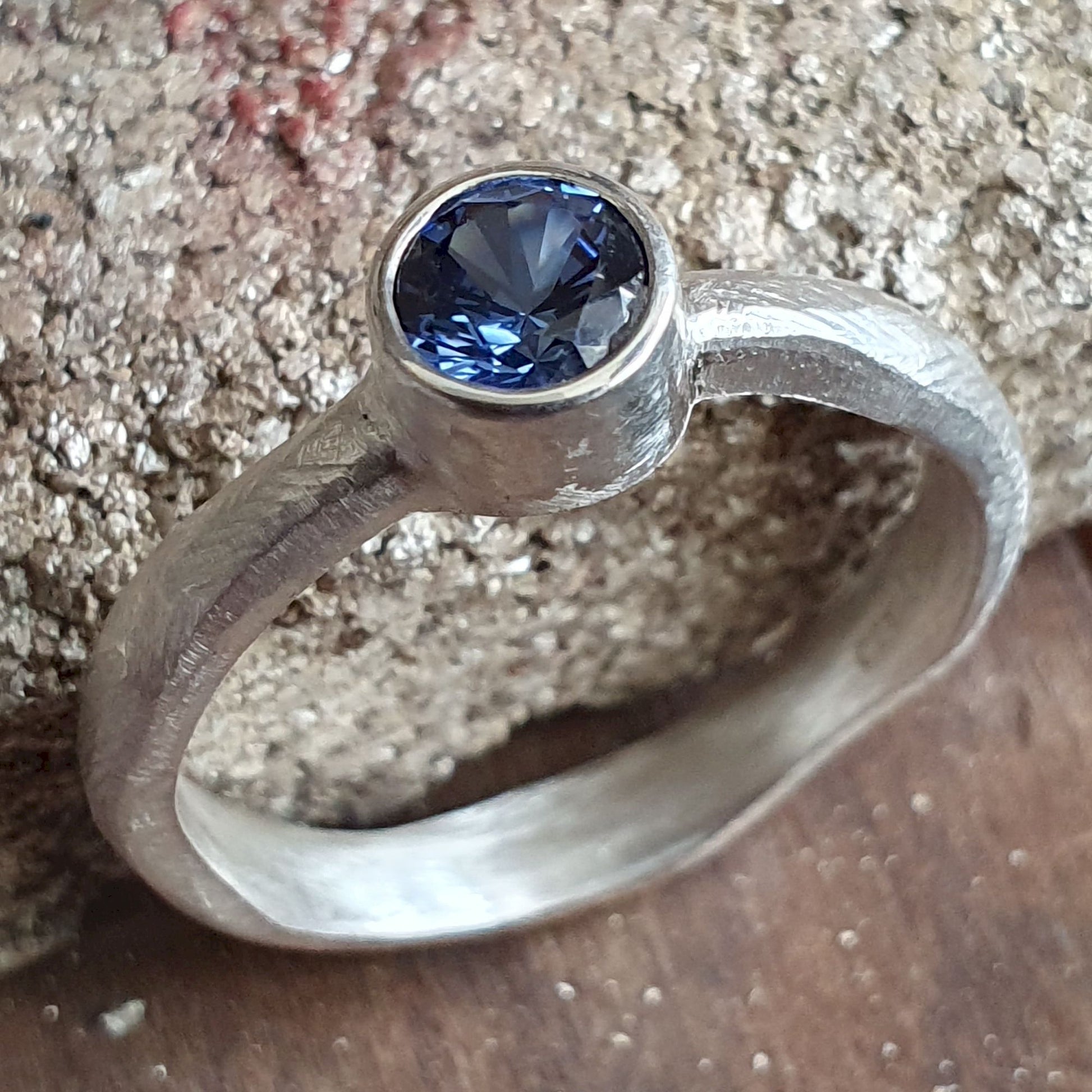 Solitaire large sapphire ring. Beach Sand silver design set with one 5mm blue lab sapphire. Mounted in a handmade silver rub over setting with a 3mm wide band.