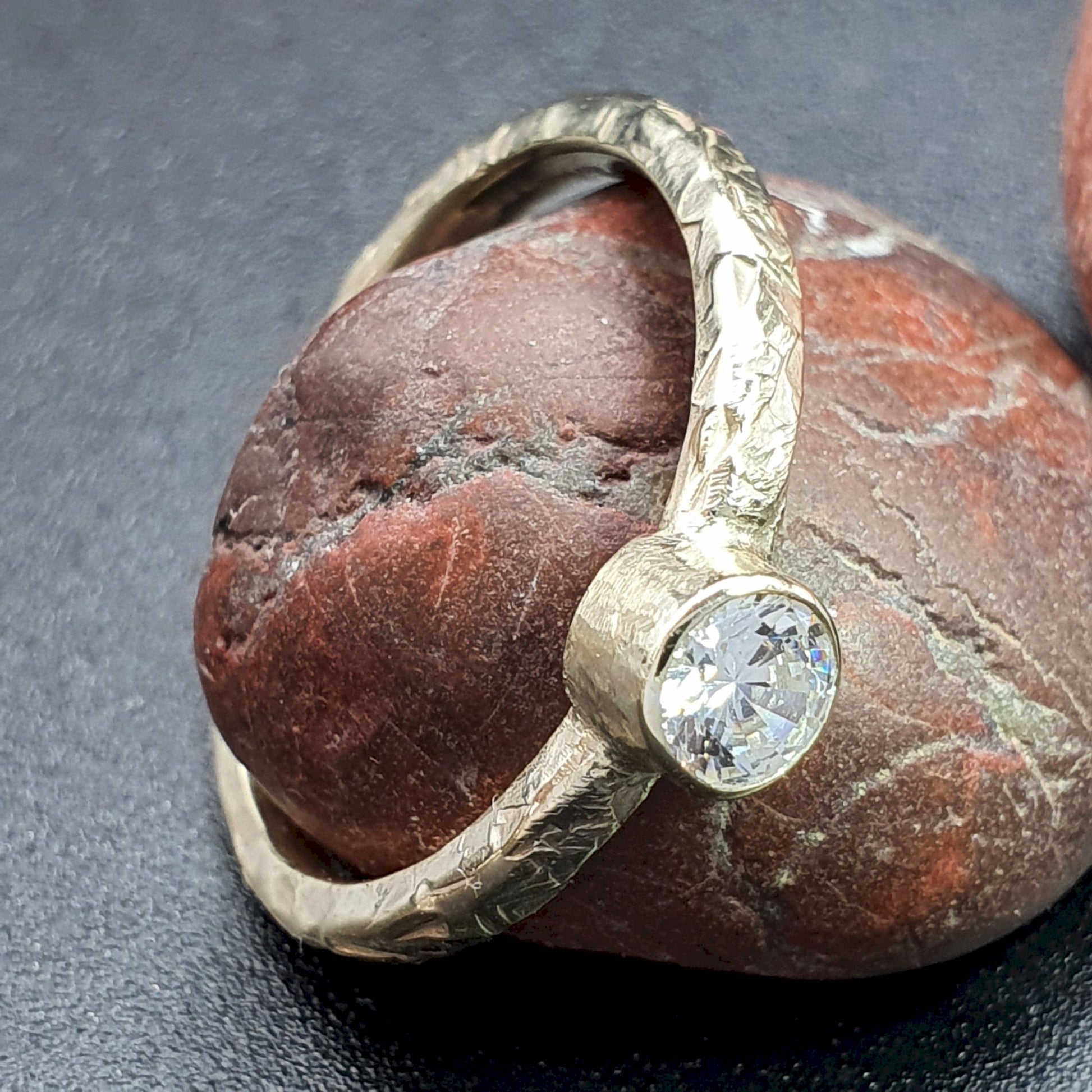 Solitaire diamond gold ring. Fire hammered design set with one natural 0.25ct diamond graded H-I,Si.