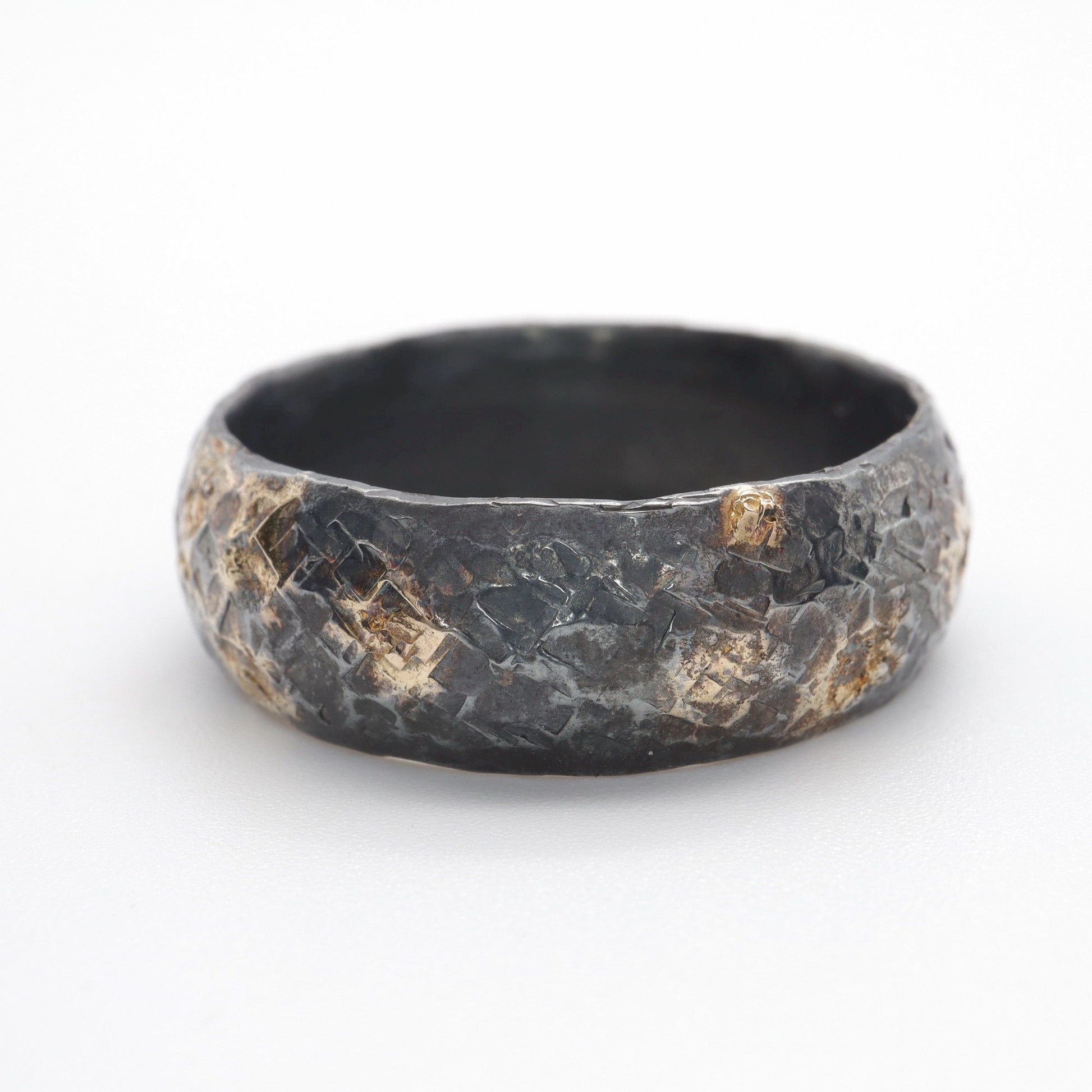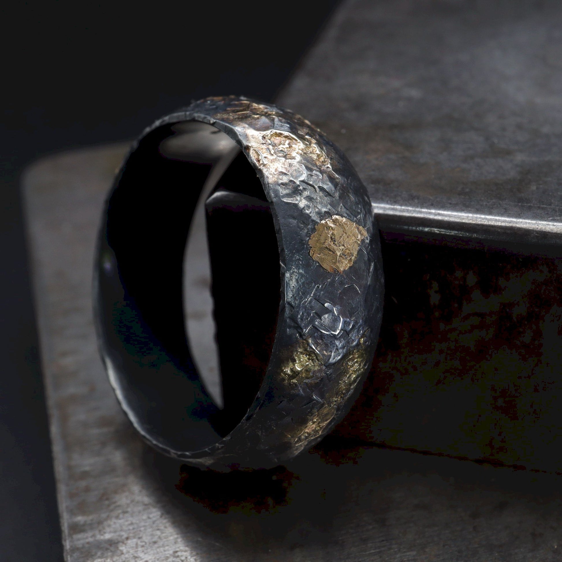 Wedding ring, black silver and gold hammered Night Sky design.