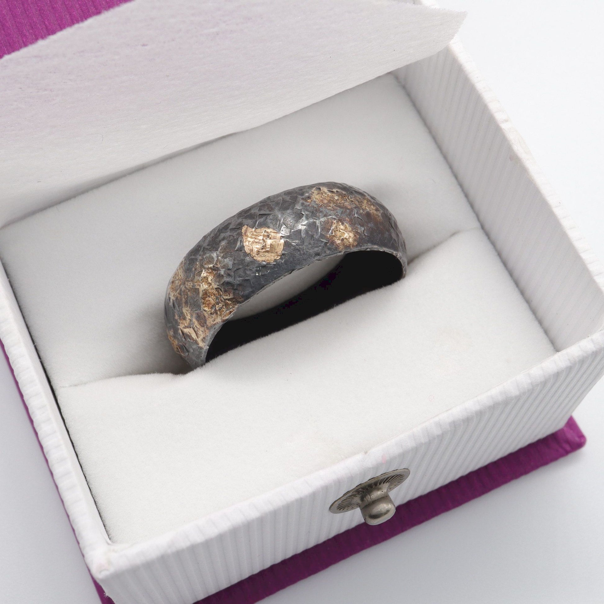 Each one is handmade with the gold making a unique individual pattern on every ring so no two rings are exactly alike. The images seen is of the 8mm version. Made from looking at the night sky in the lake district.