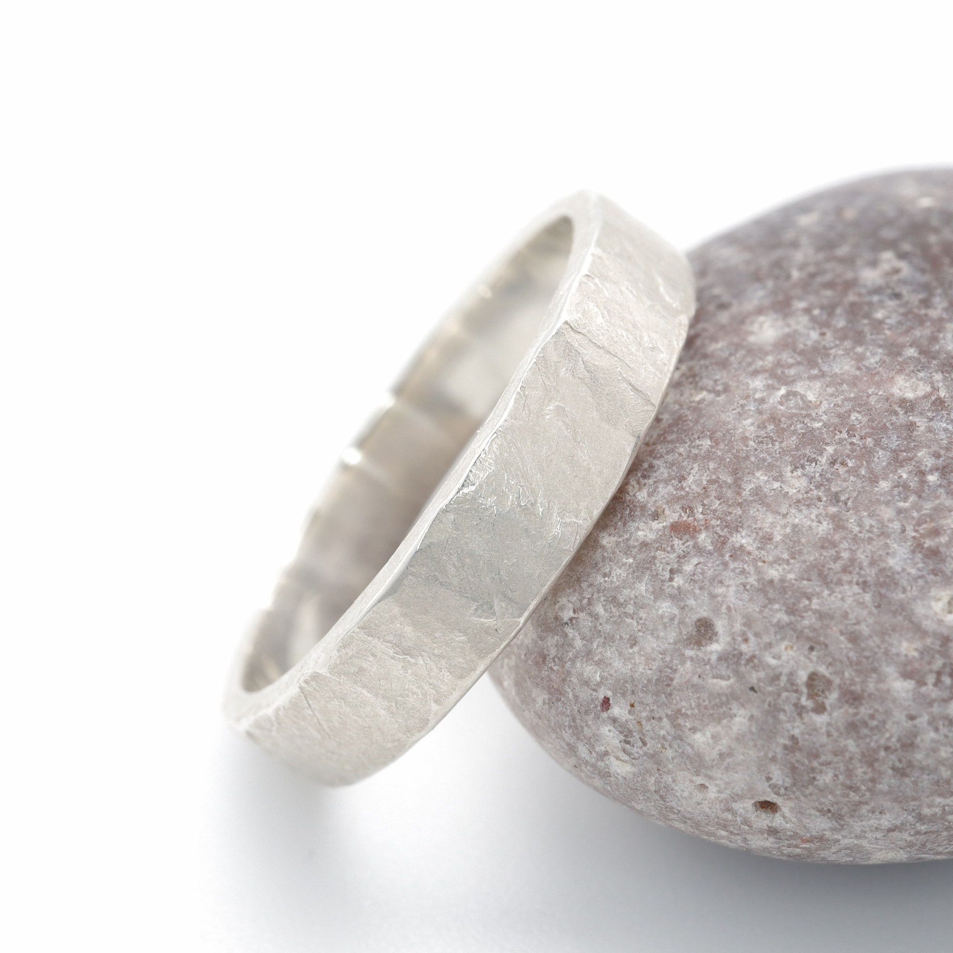 White gold thin wedding ring. Rustic flat hammered textured Windermere design available in a 2mm, 3mm or 4mm width.