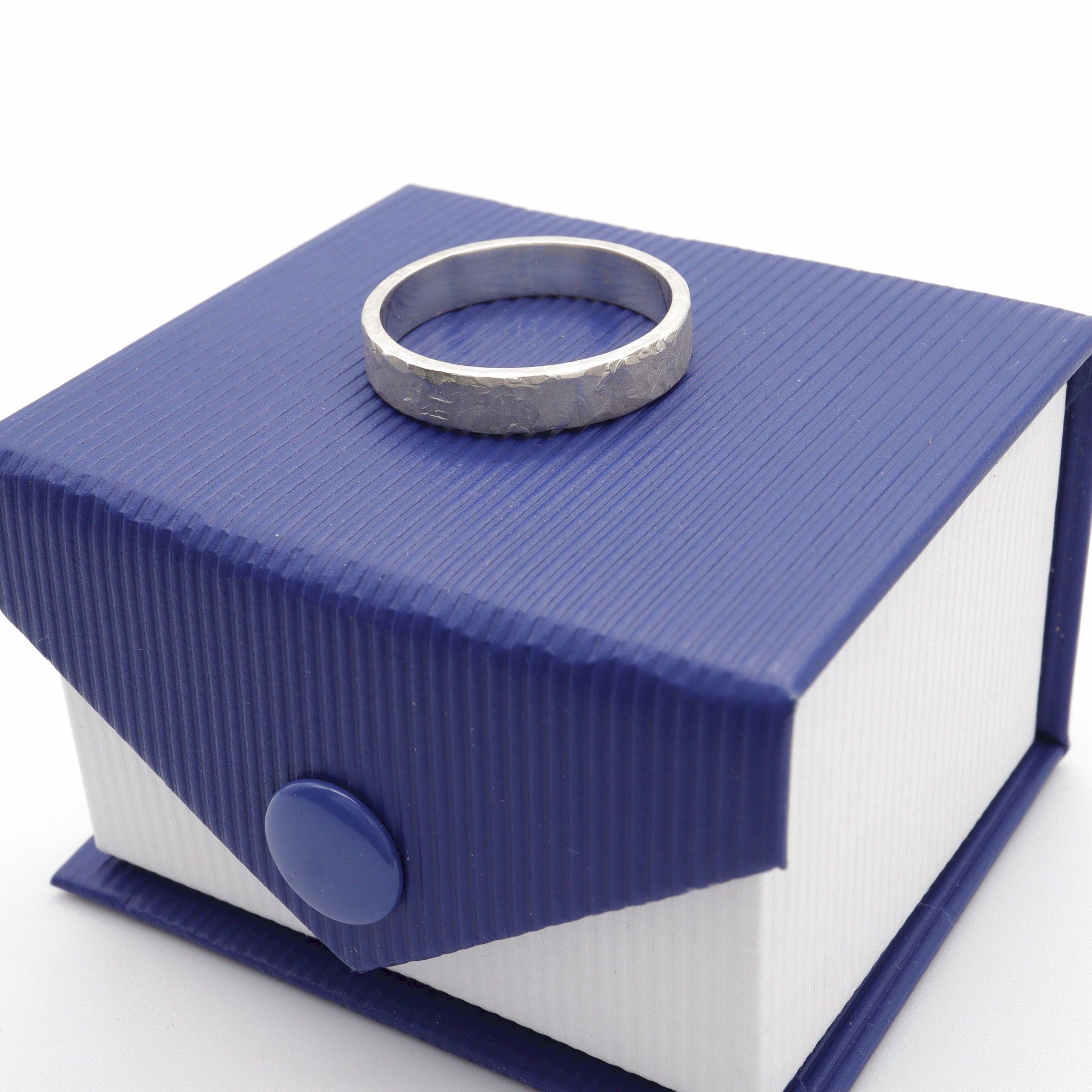 White gold thin wedding ring - rustic flat hammered textured band - Windermere design.