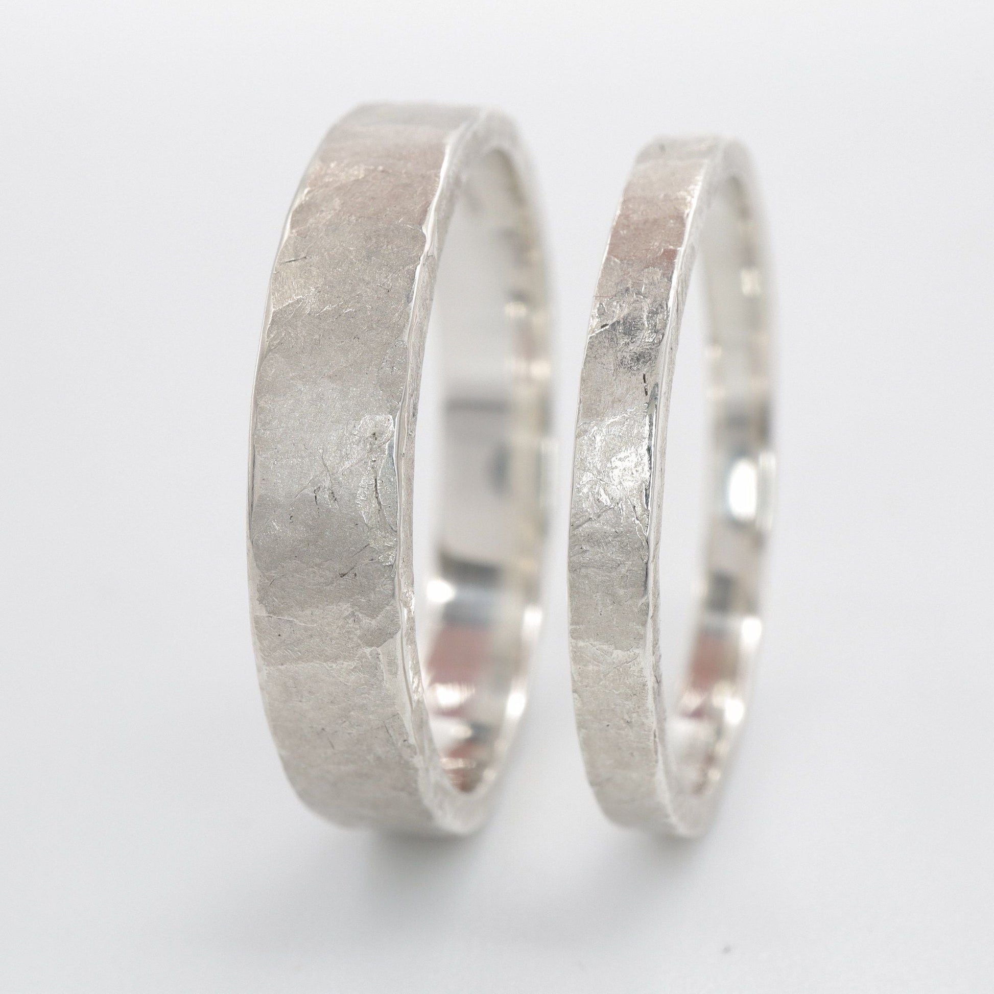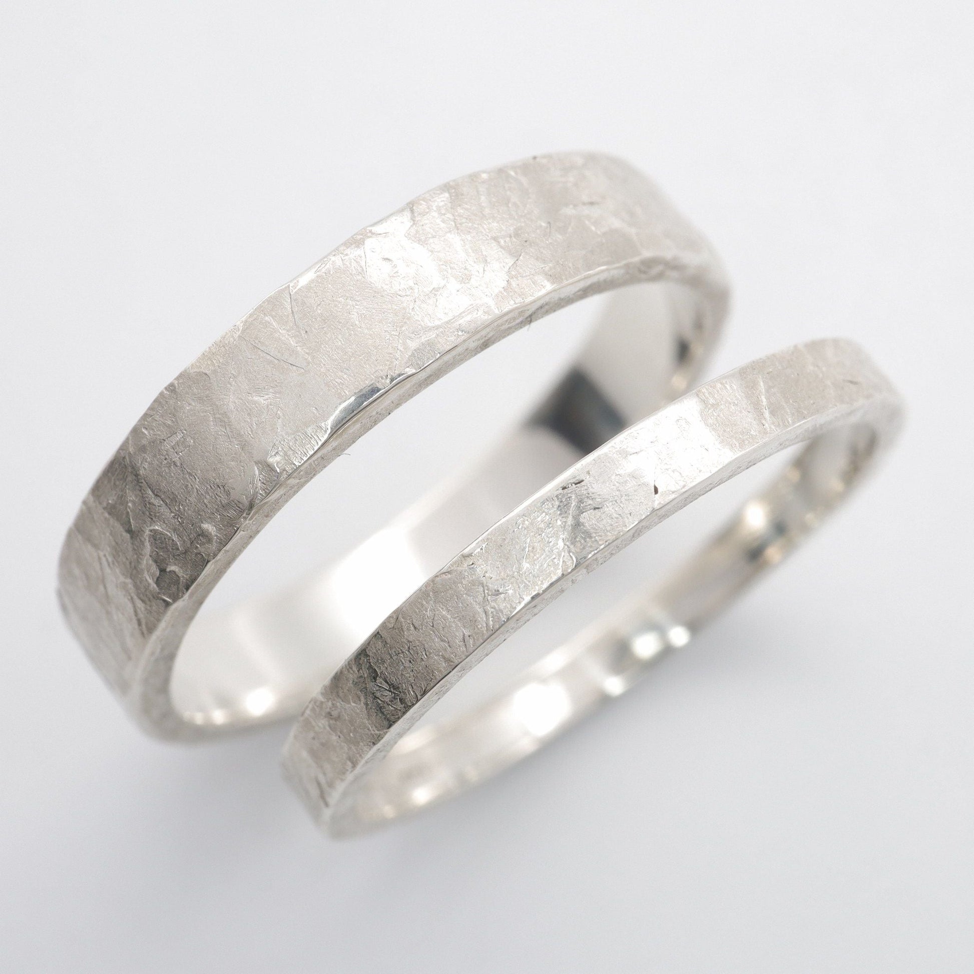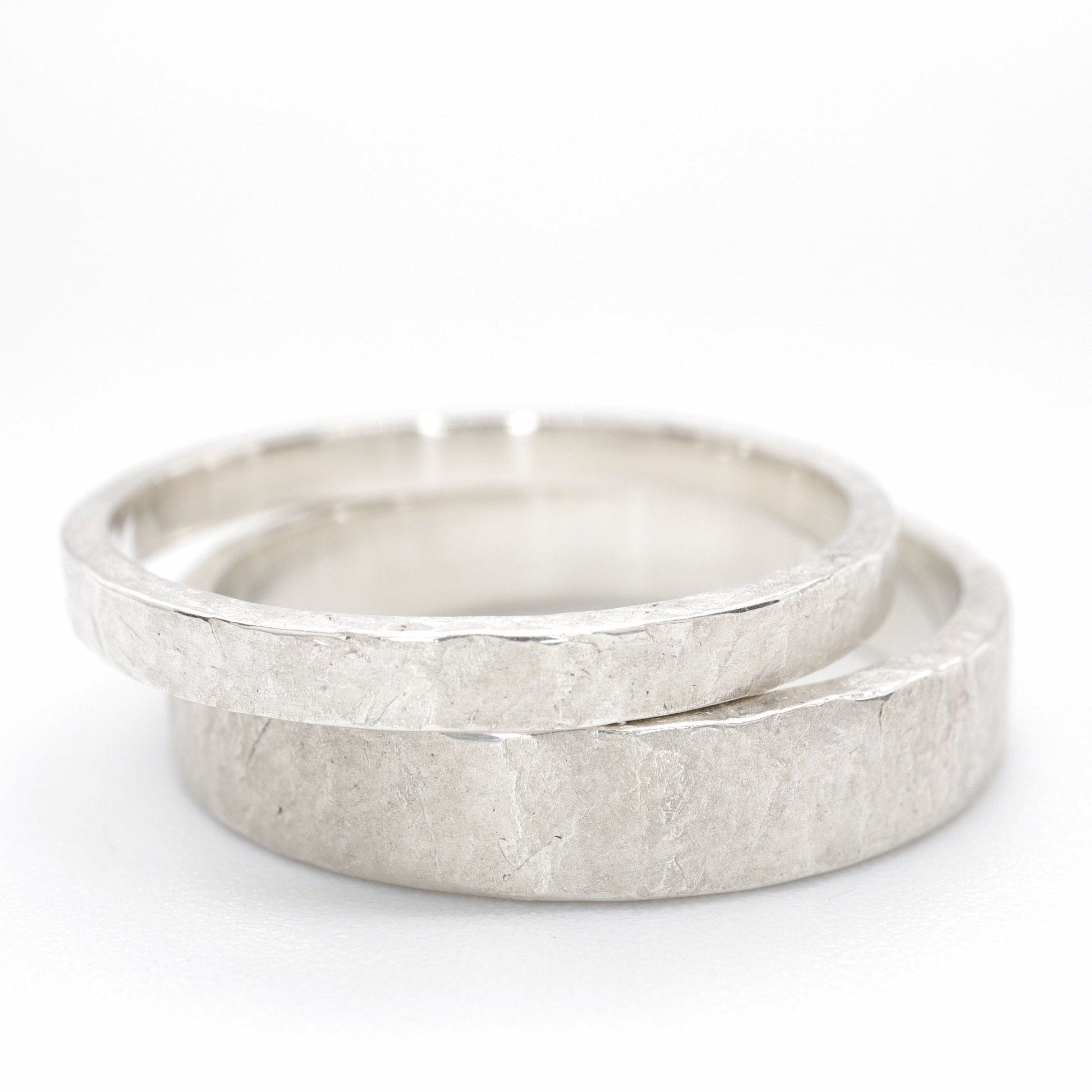 White gold matching wedding ring set - rustic flat hammered textured band - original men`s and women`s, Windermere design - 2mm and 4mm.