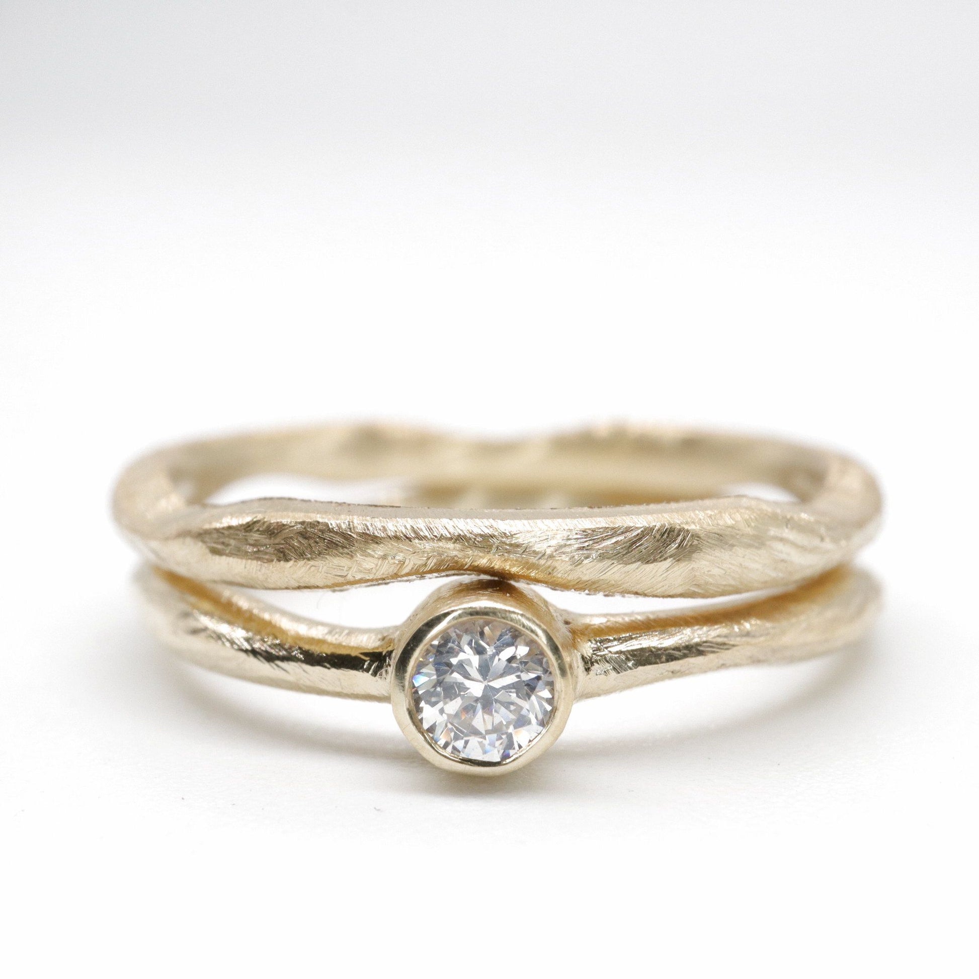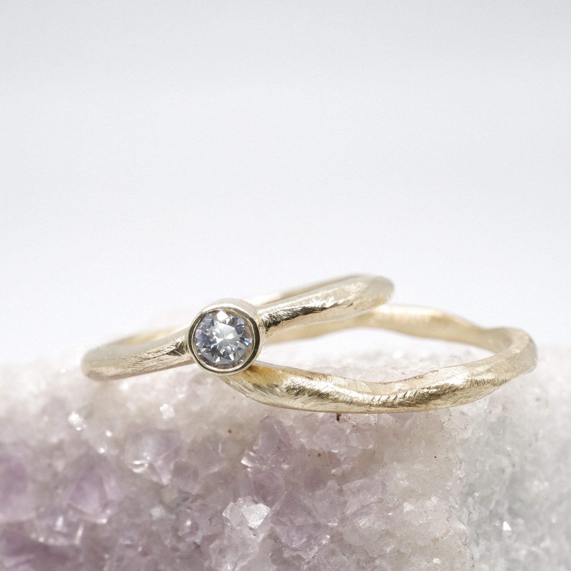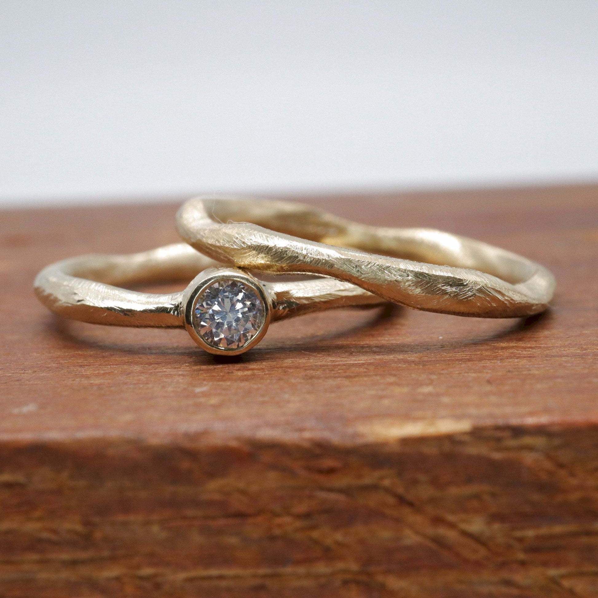 Solitaire diamond yellow gold minimalist narrow 2mm ring bridal set. Beach Sand design set with one natural 0.13ct diamond.