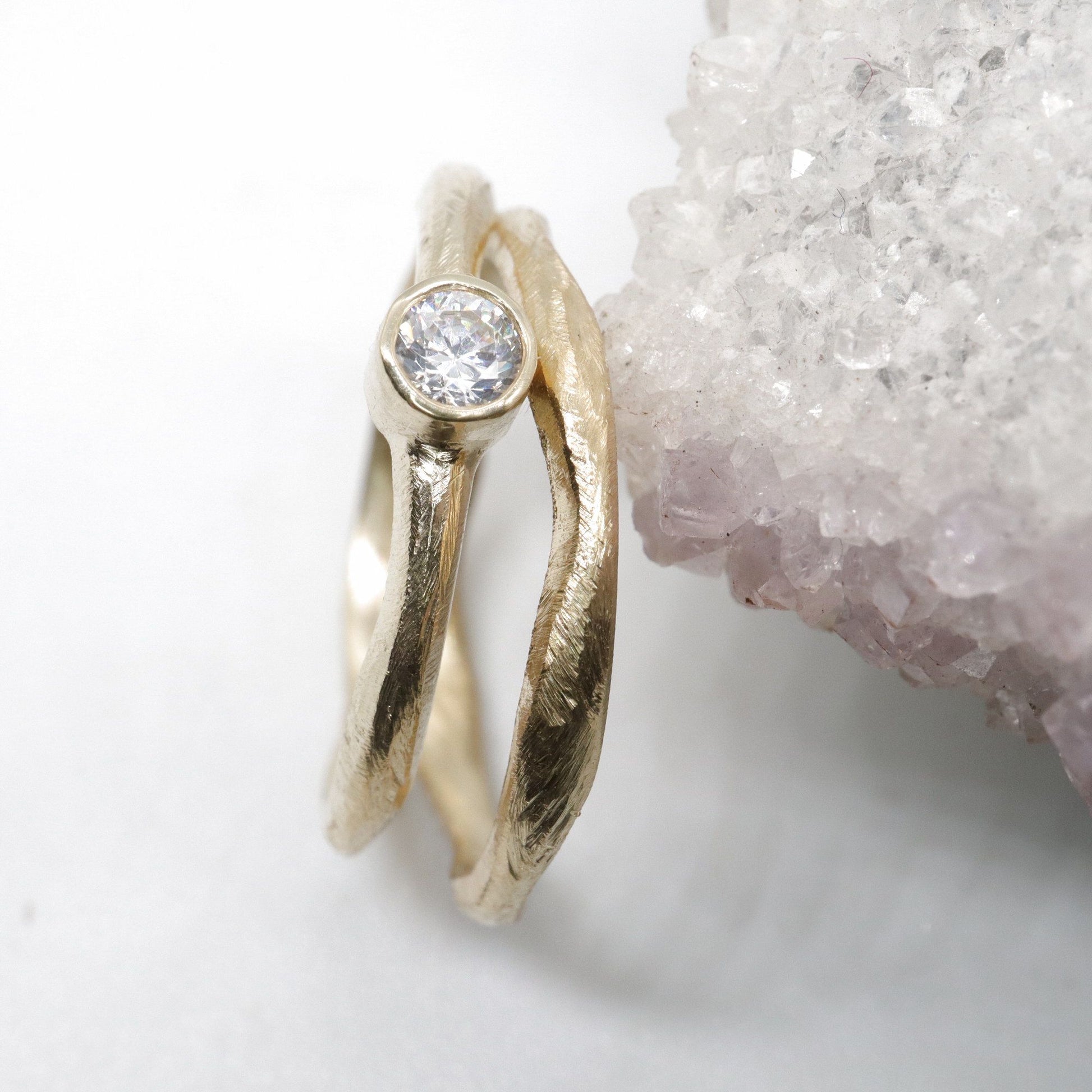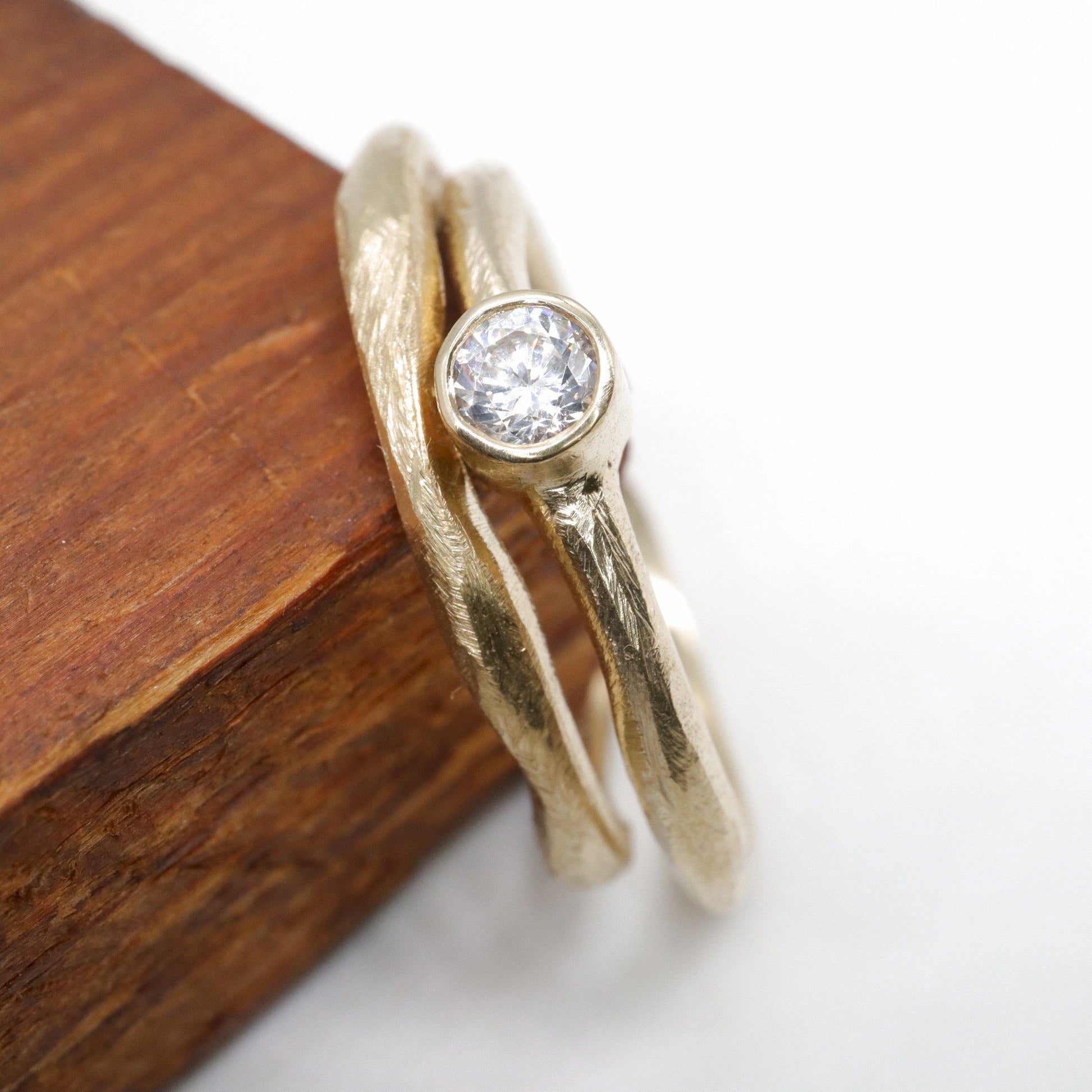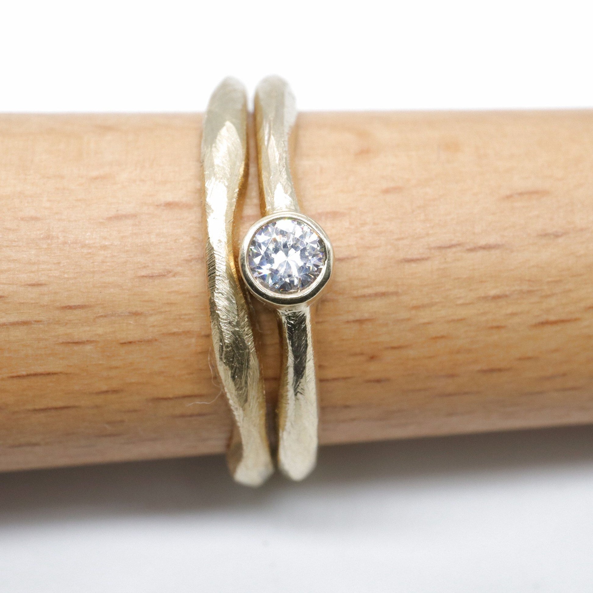 Solitaire diamond yellow gold minimalist narrow 2mm ring bridal set. Beach Sand design set with one natural 0.13ct diamond.