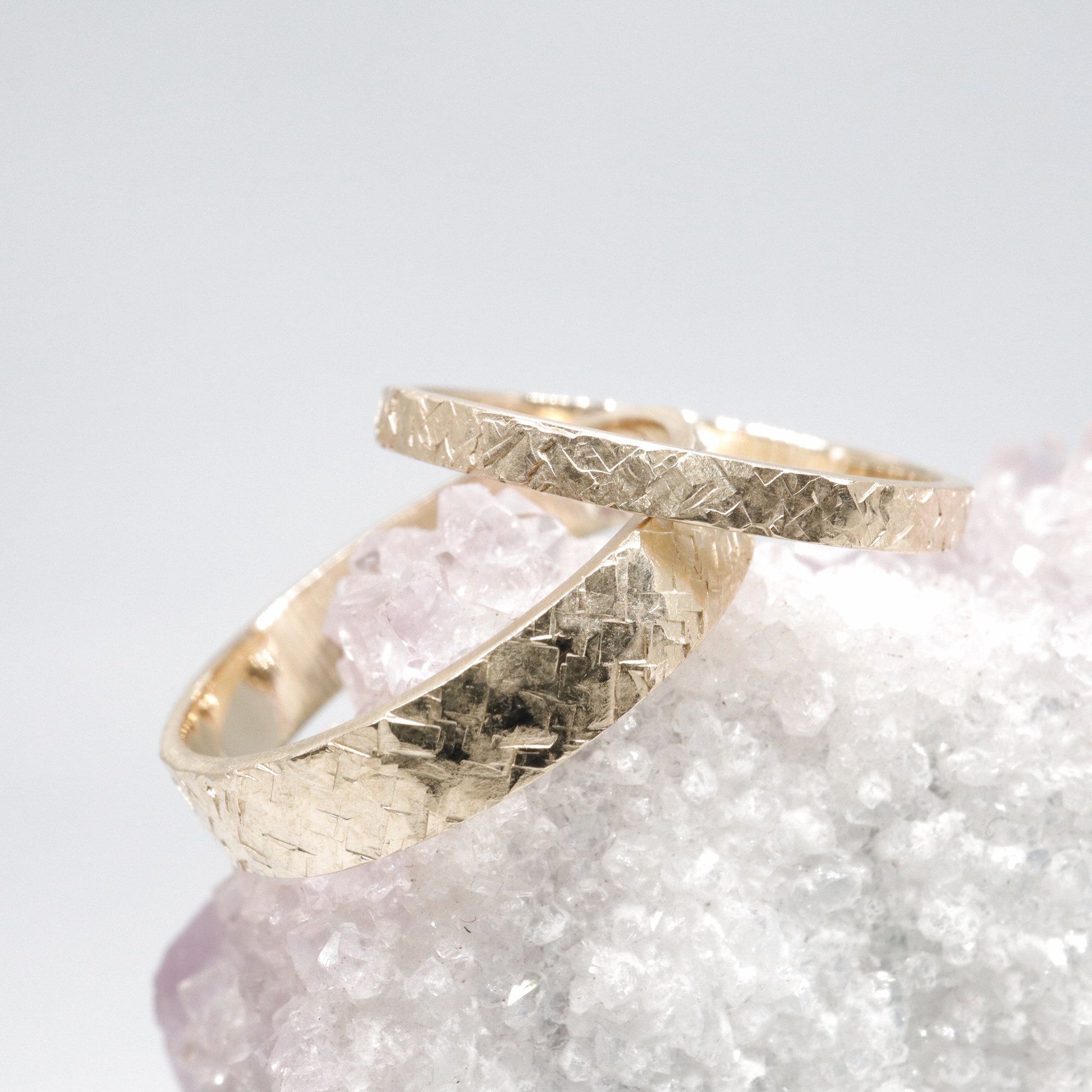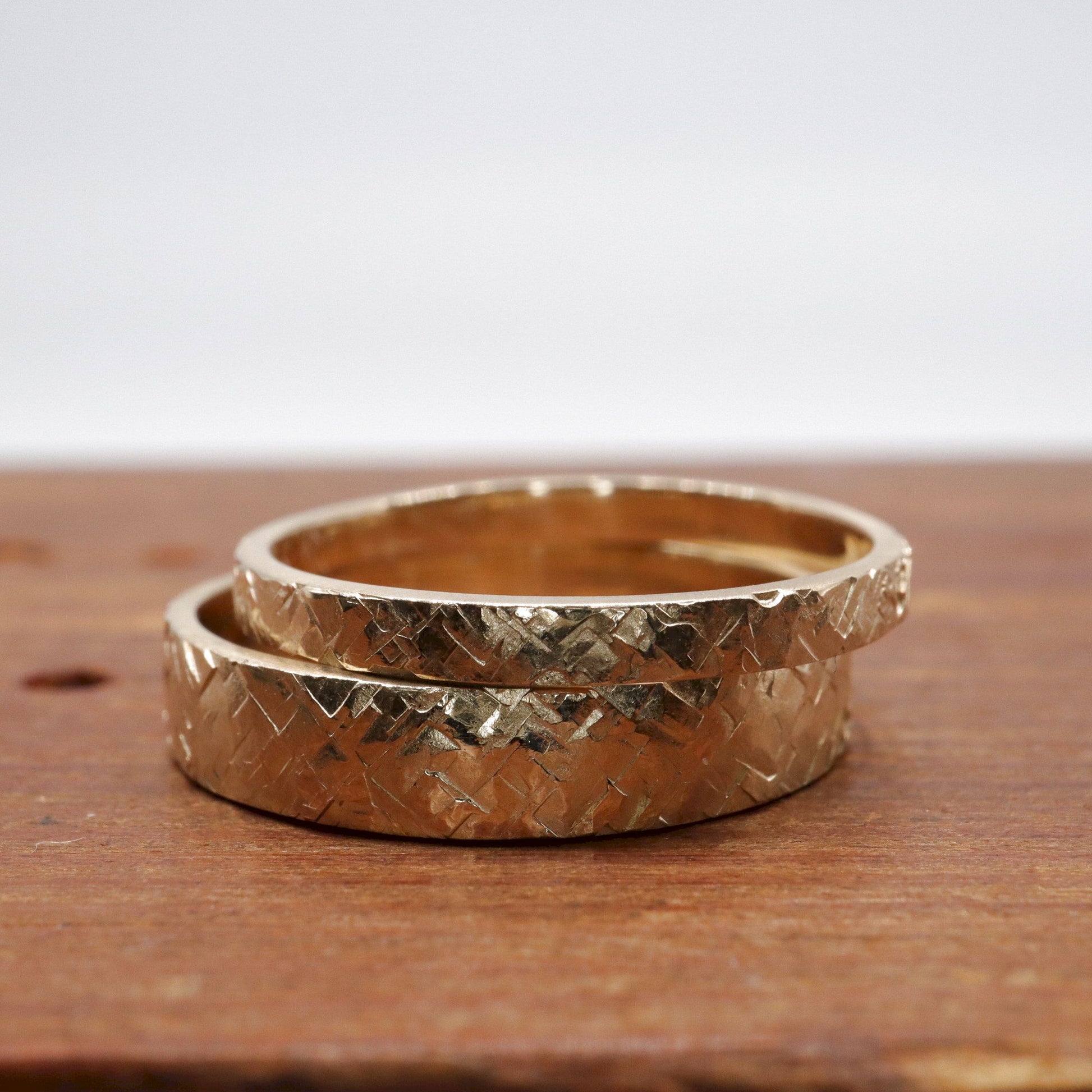 Matching Kendal design rustic hammered 2mm and 4mm flat wedding ring set - textured yellow gold men and womens rings.