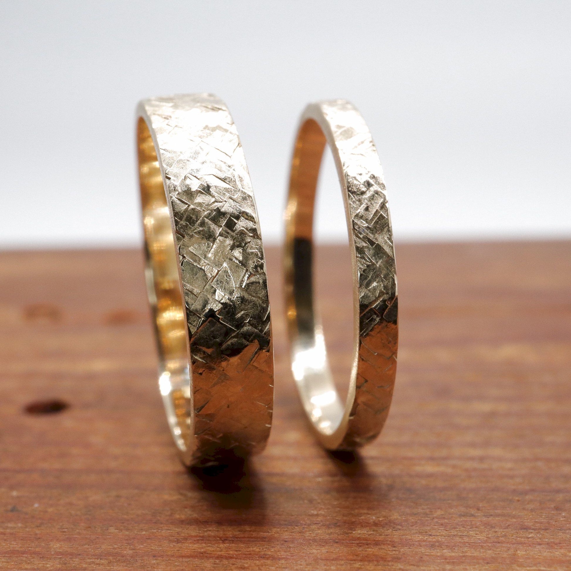 Yellow gold matching Kendal rustic hammered 2mm and 4mm wedding ring set - flat textured men and womens design.