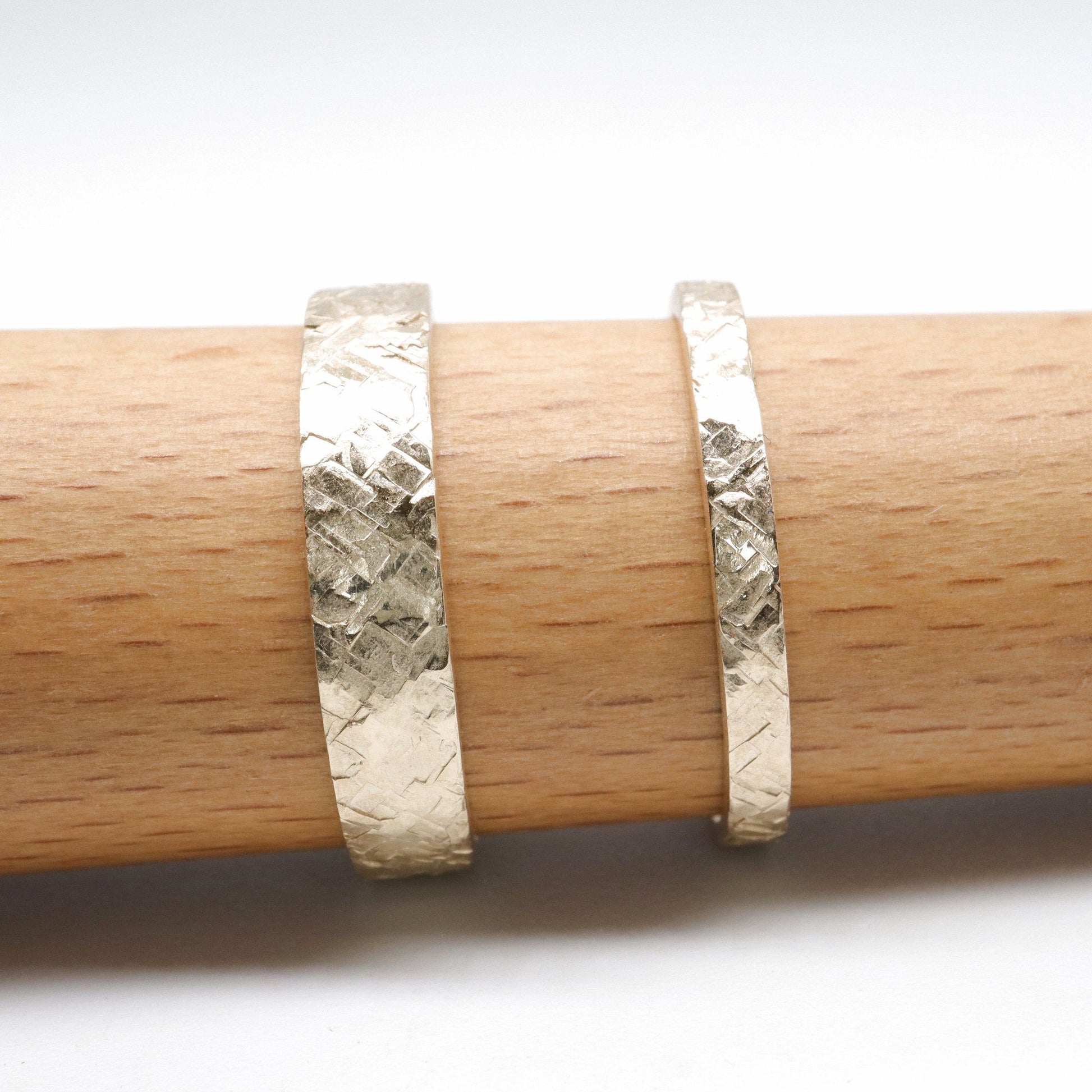 This is my Kendal rustic hammered design matching wedding ring set. They have a hammered outside, brushed matt sides and a polished inside.