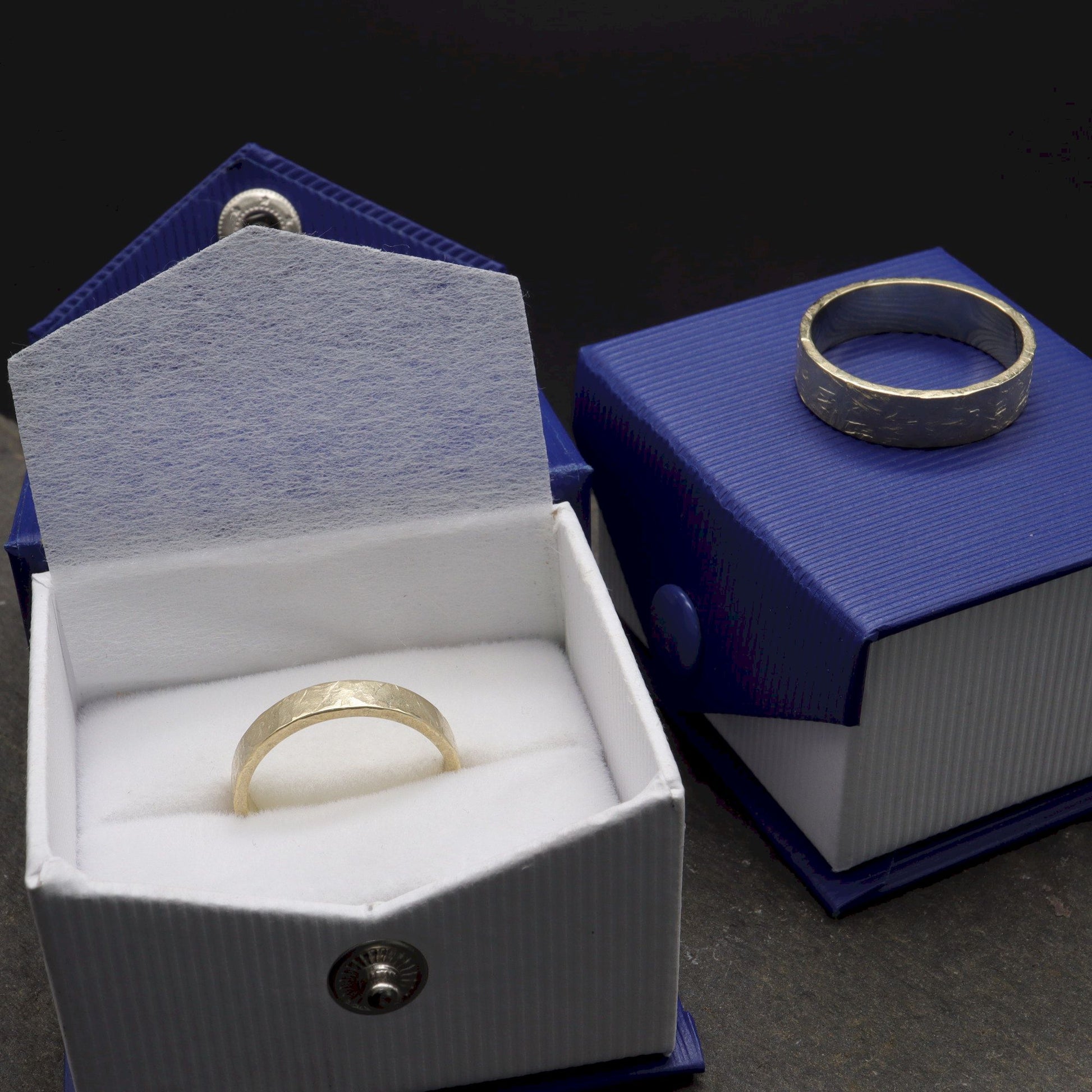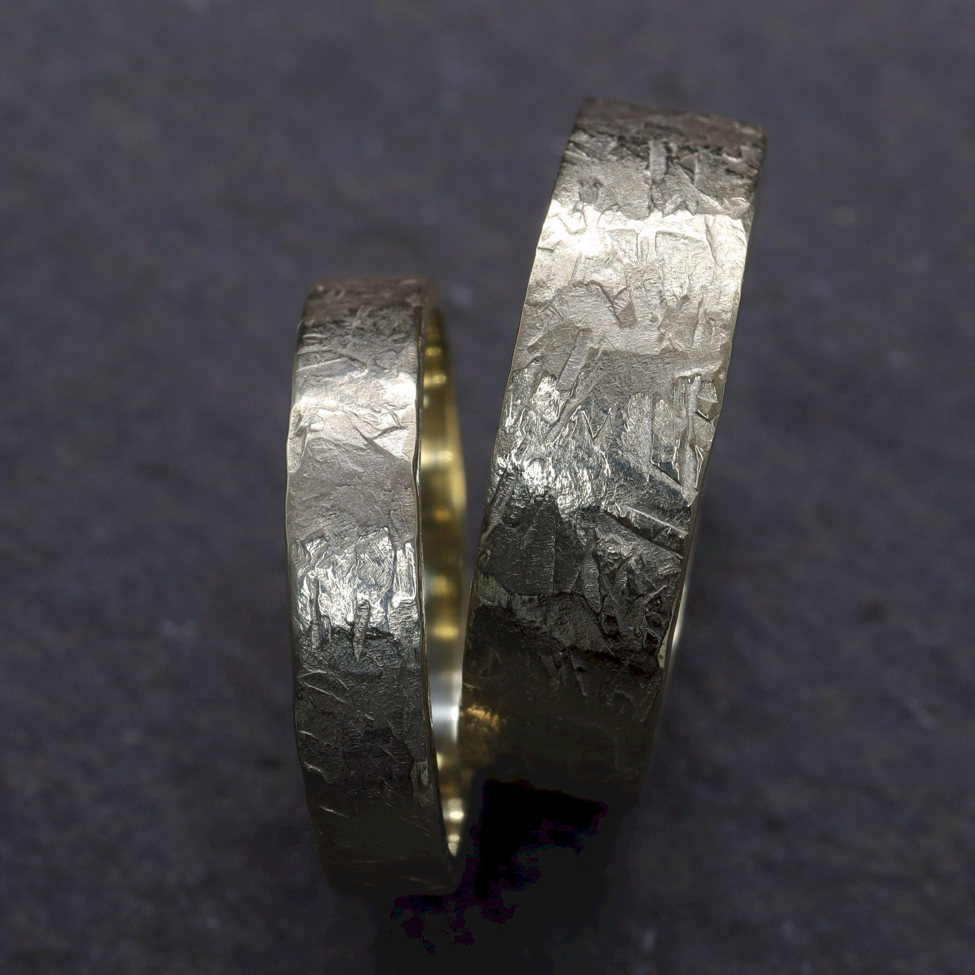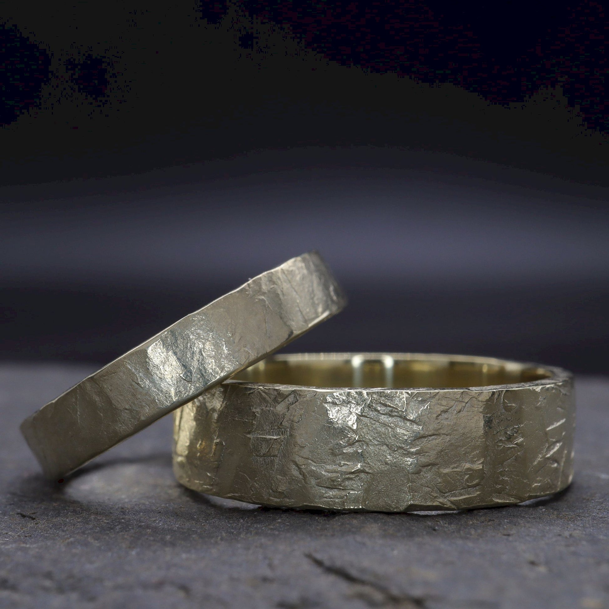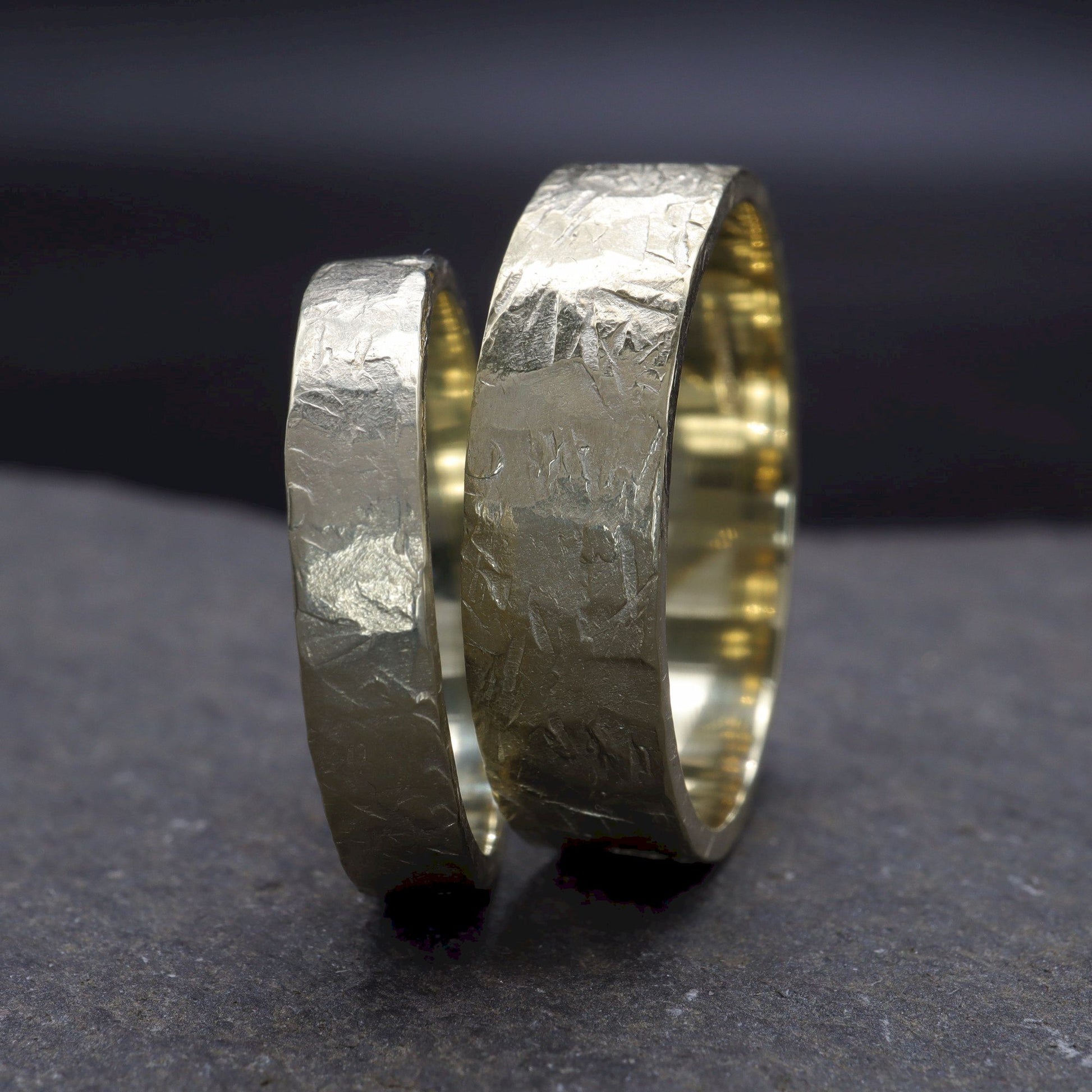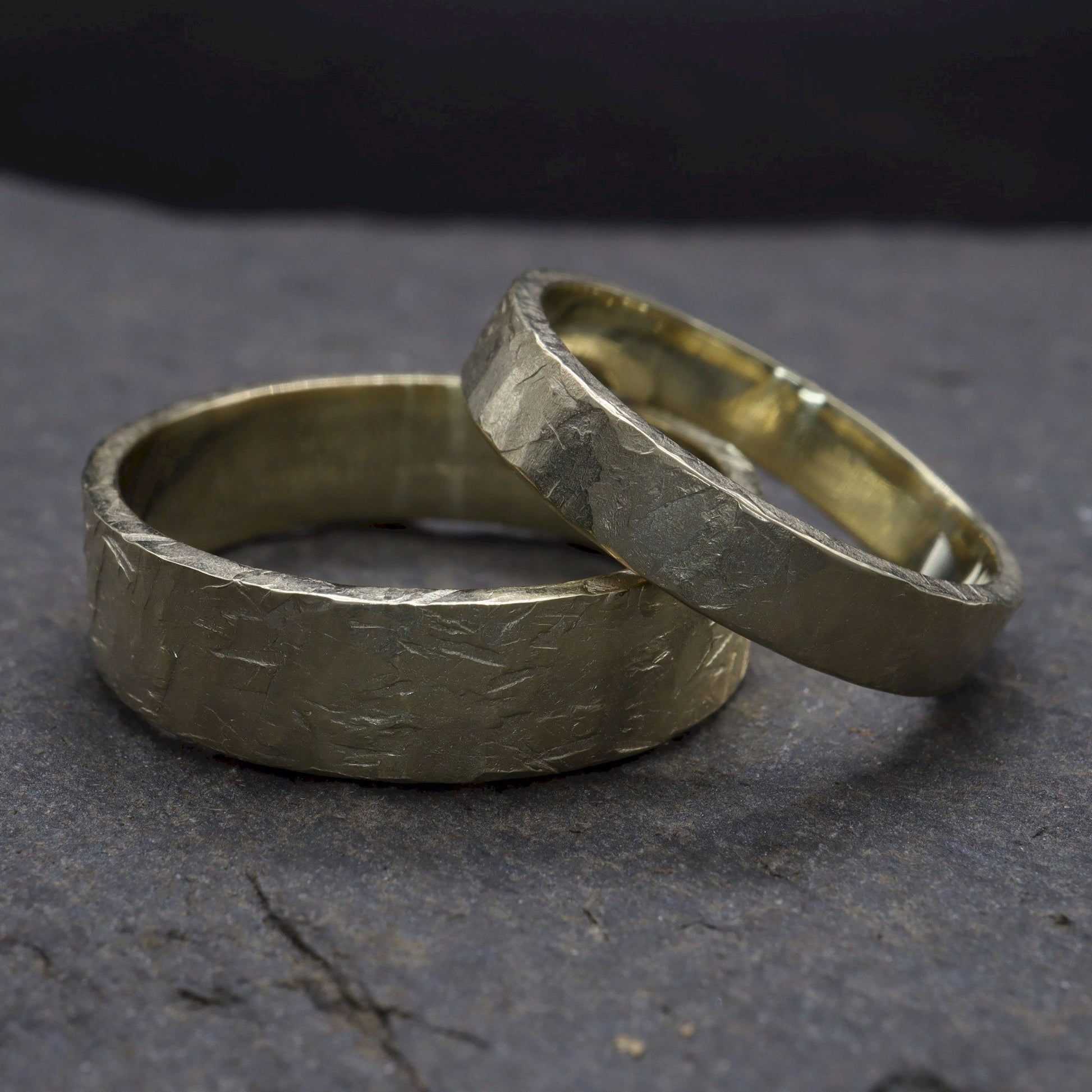 This is my Windermere design matching wedding ring set. They have been finished with an original hammered distressed texture. Inspired by the patterns on the Lakeland rock beside Lake Windermere when on a walk. Created with my own hand carved tools.
